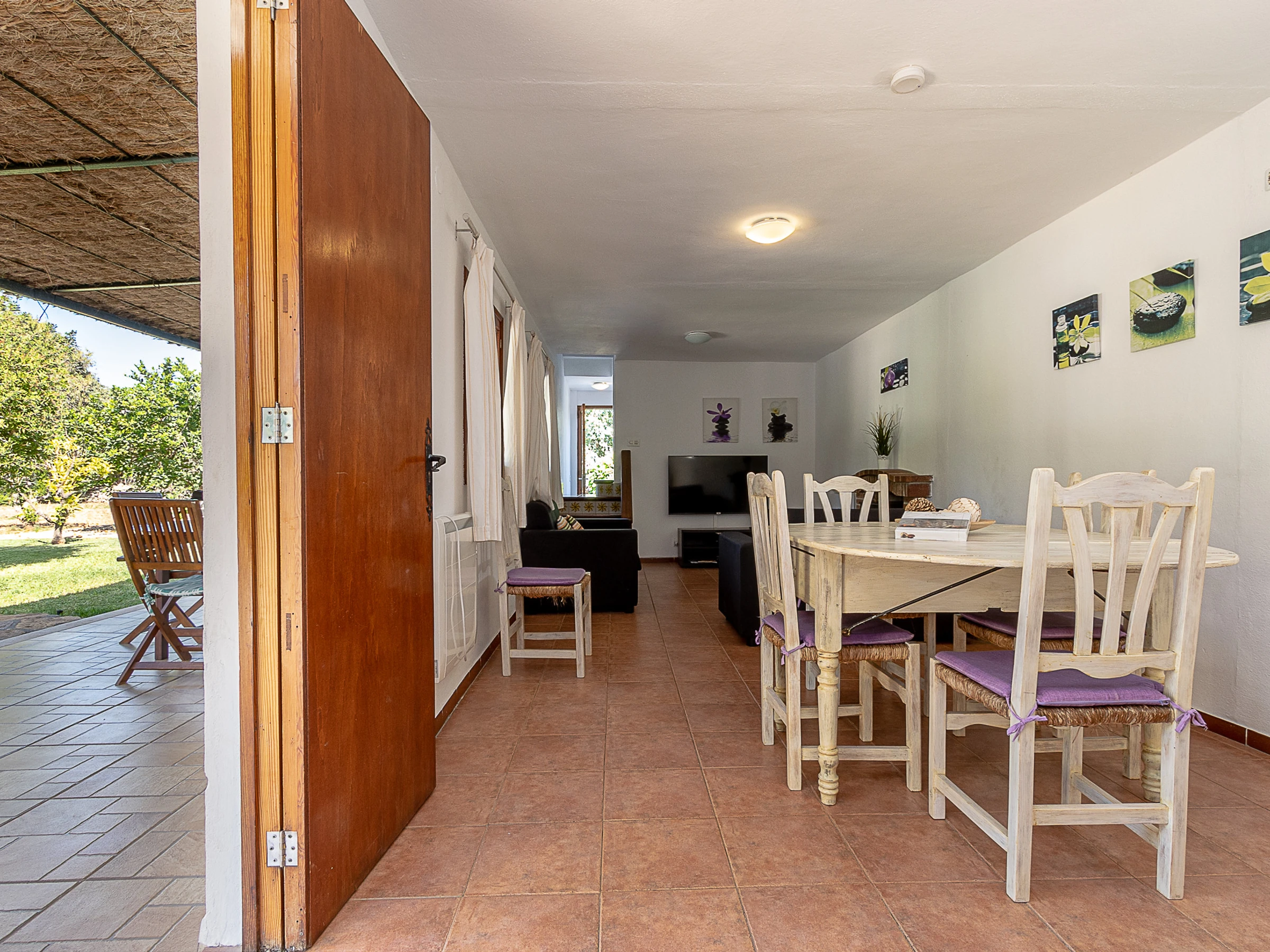 Spacious living-dining room with fireplace and air conditioning, ideal for both chilly winter nights and low-season stays.