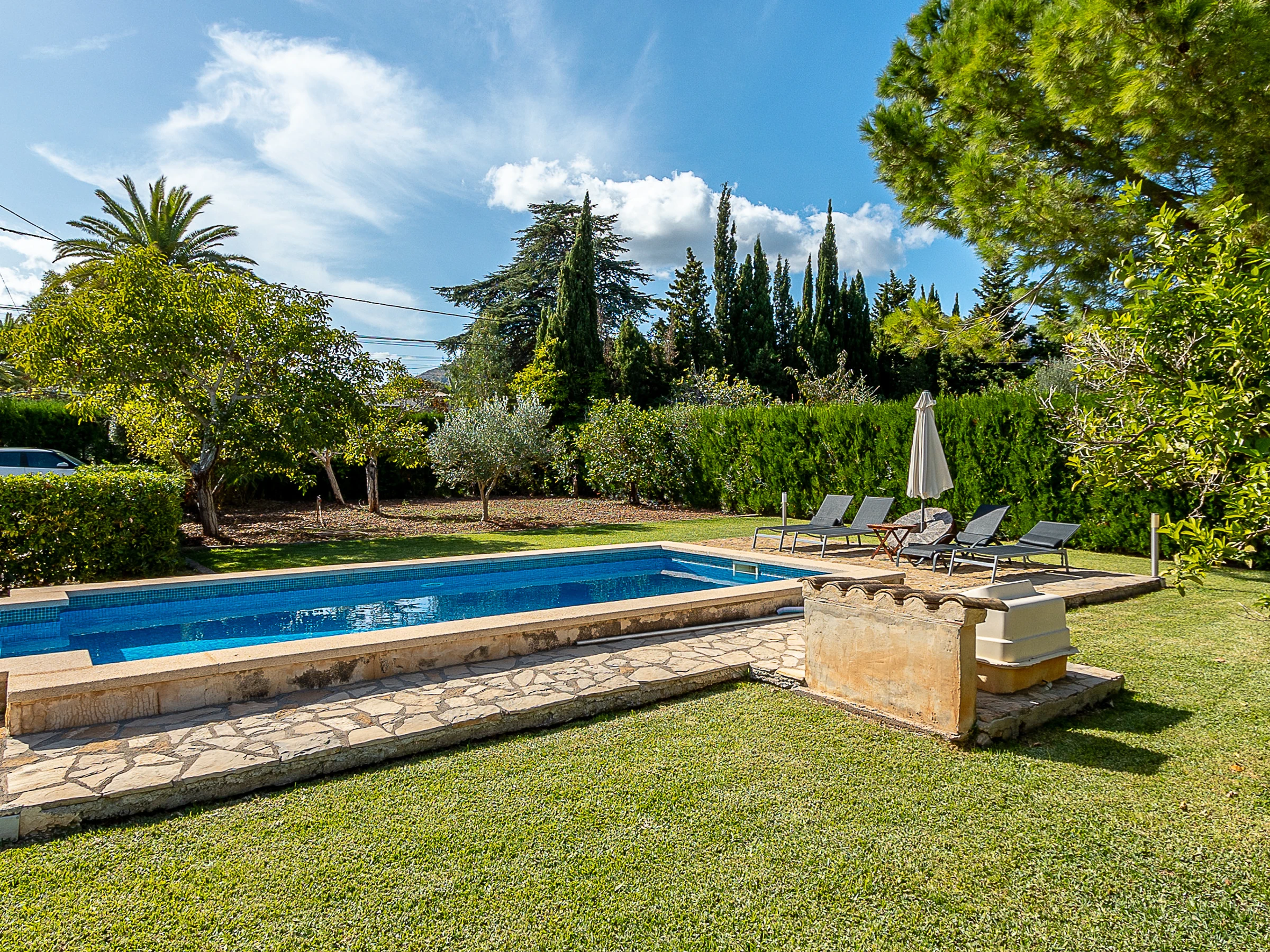 Large garden with private swimming pool, surrounded by nature.