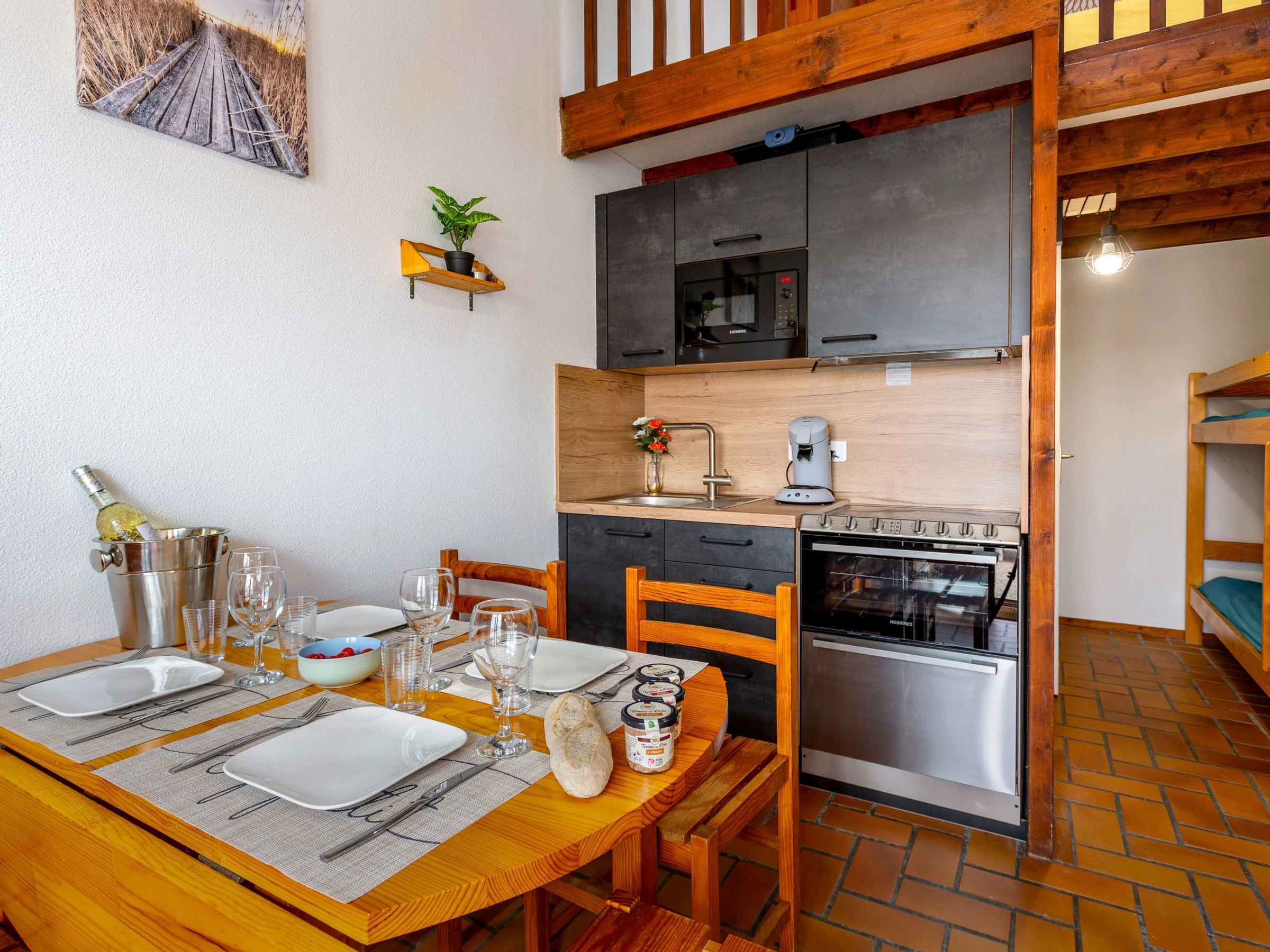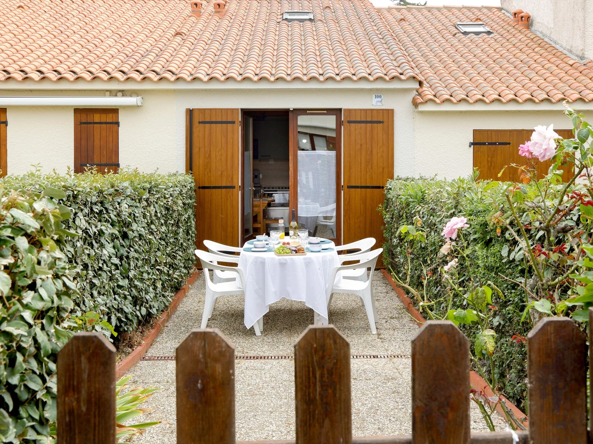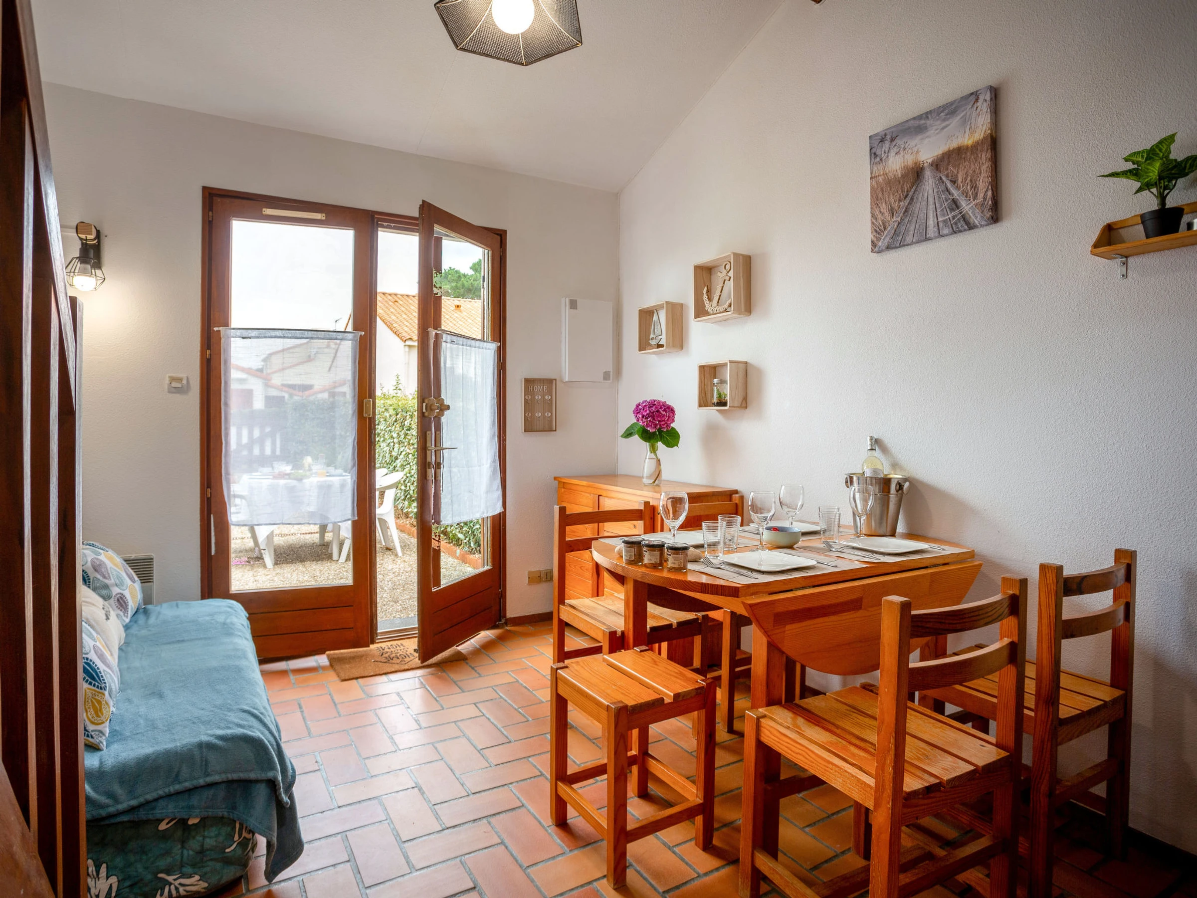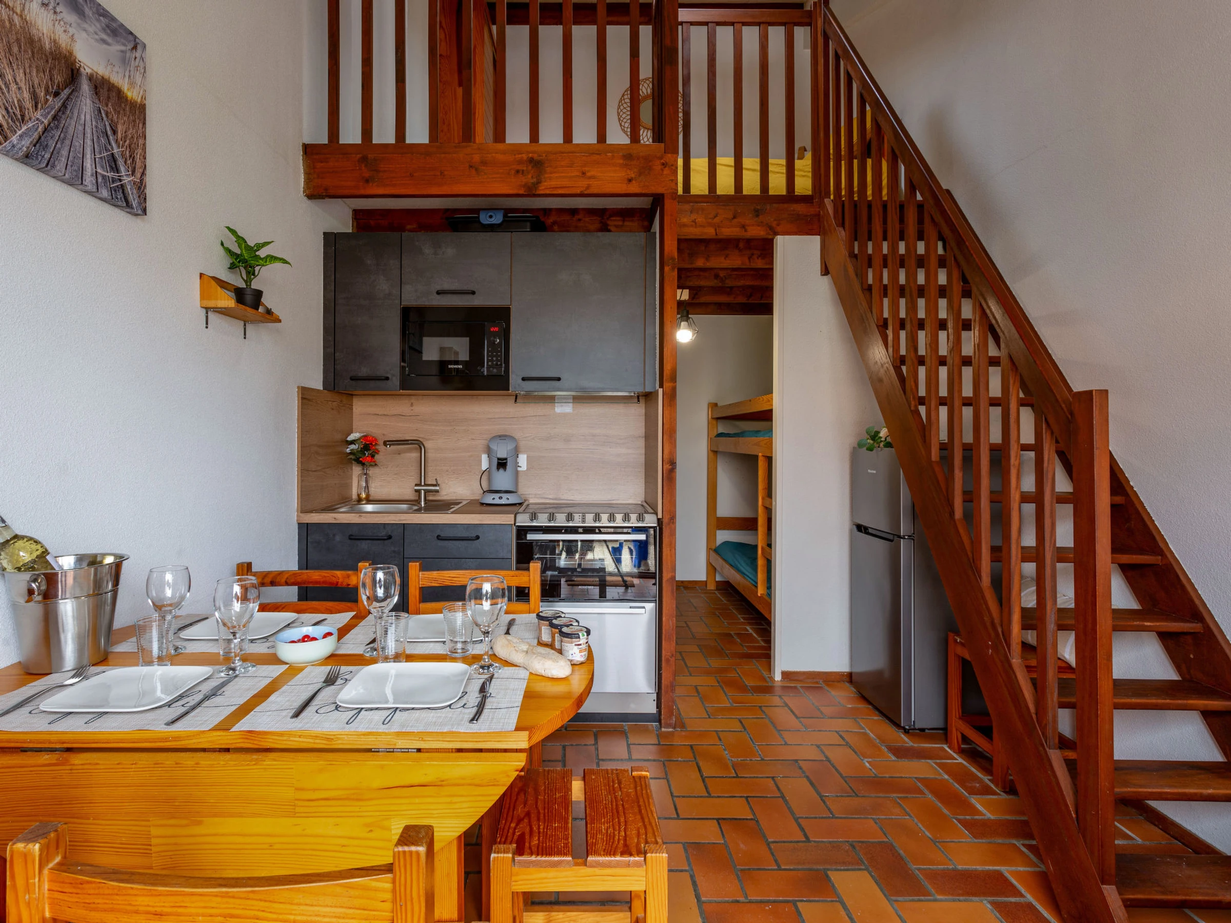 "Poisson", 2-room terraced house 26 m2 on 2 levels, west facing position. Simple furnishings: living/dining room with 1 sofabed (140 cm, length 190 cm). Exit to the terrace. Interconnecting room with 1 x 2 bunk beds (70 cm, length 190 cm). Small, open kitchen (mini-oven, oven, dishwasher, 4 induction hot plates, toaster, kettle, microwave, freezer, electric coffee machine, Capsules for coffee machine (Senseo) extra). Shower/WC. Upper floor: (steep stair), 1 open room with sloping ceilings with 1 french bed (1 x 140 cm, length 200 cm). Electric heating. Terrace 20 m2, south facing position and west facing position. Terrace furniture, electric barbecue. Side view of the sea. Facilities: iron, hair dryer. Internet (WiFi, extra). Reserved parking space n 100 (1 car). Please note: non-smoking house. 1 small pet/ dog allowed. Smoke alarm. Bed layout is flexible. There are more sleeping options available than the maximum number of people allowed which may, however, not be exceeded. Offer by a commercial proprietor according to Art. 155, IV, CGI [hidden]