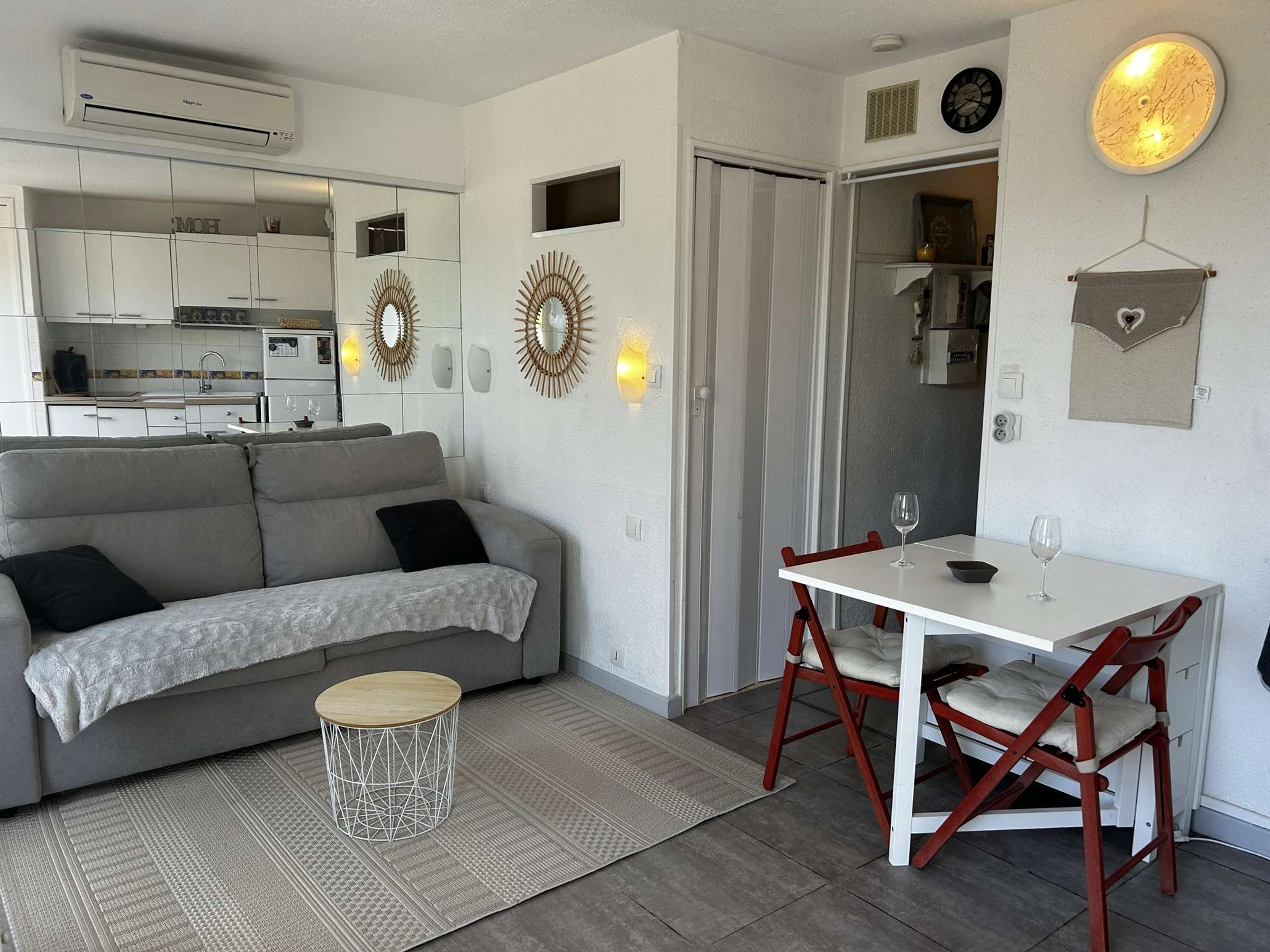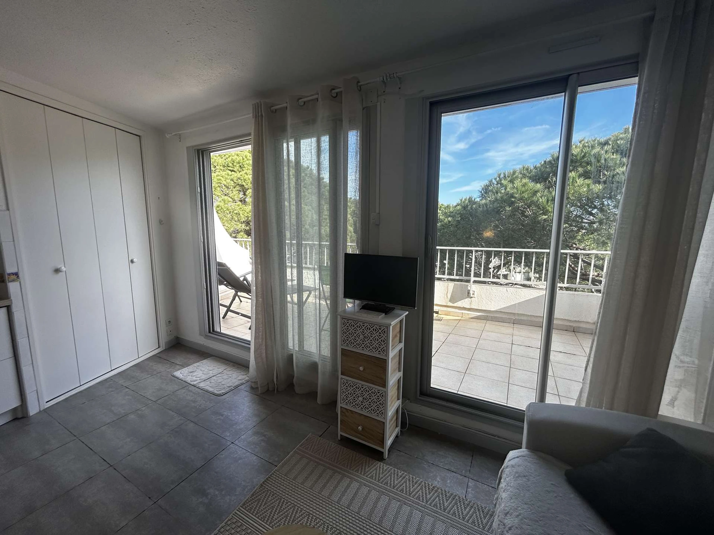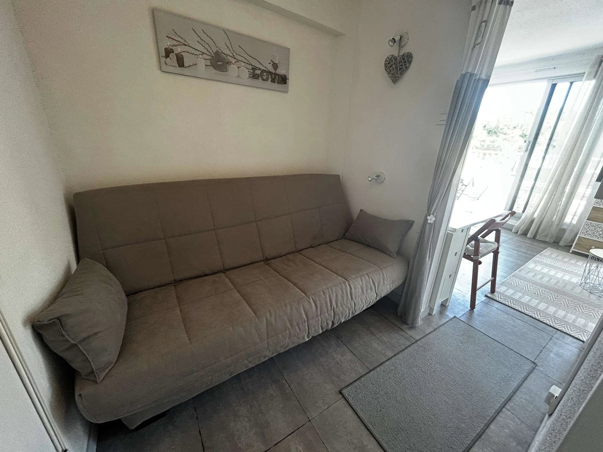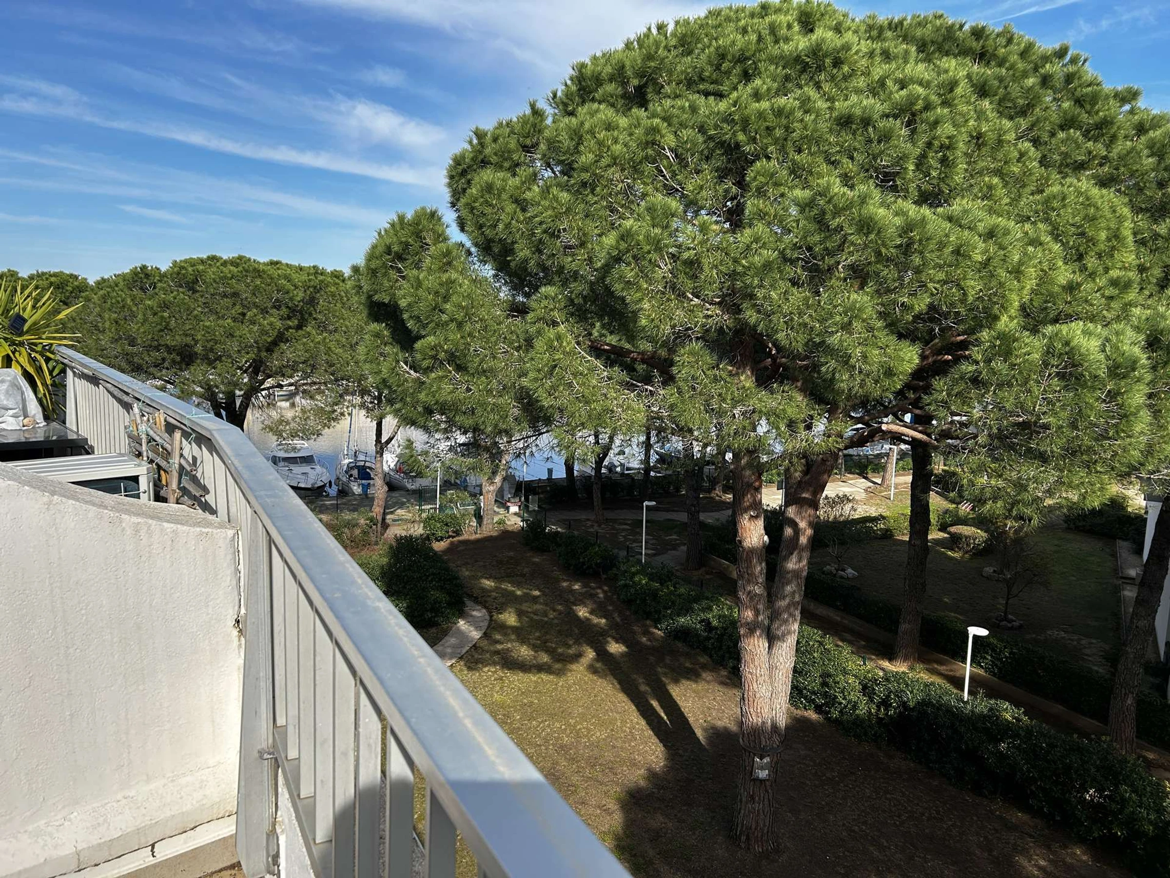 This apartment is located in the South Beach area of Port Camargue, on the 3rd floor of the "Les Caravelles" residence. It comprises a living room with a sofa bed and television; a fully equipped kitchenette; a shower room; and a separate toilet. The living room opens onto a southeast-facing terrace of approximately 15 m². The terrace is furnished with sun loungers, outdoor furniture, and a sunshade, allowing you to enjoy the lovely view of the gardens and the canal.