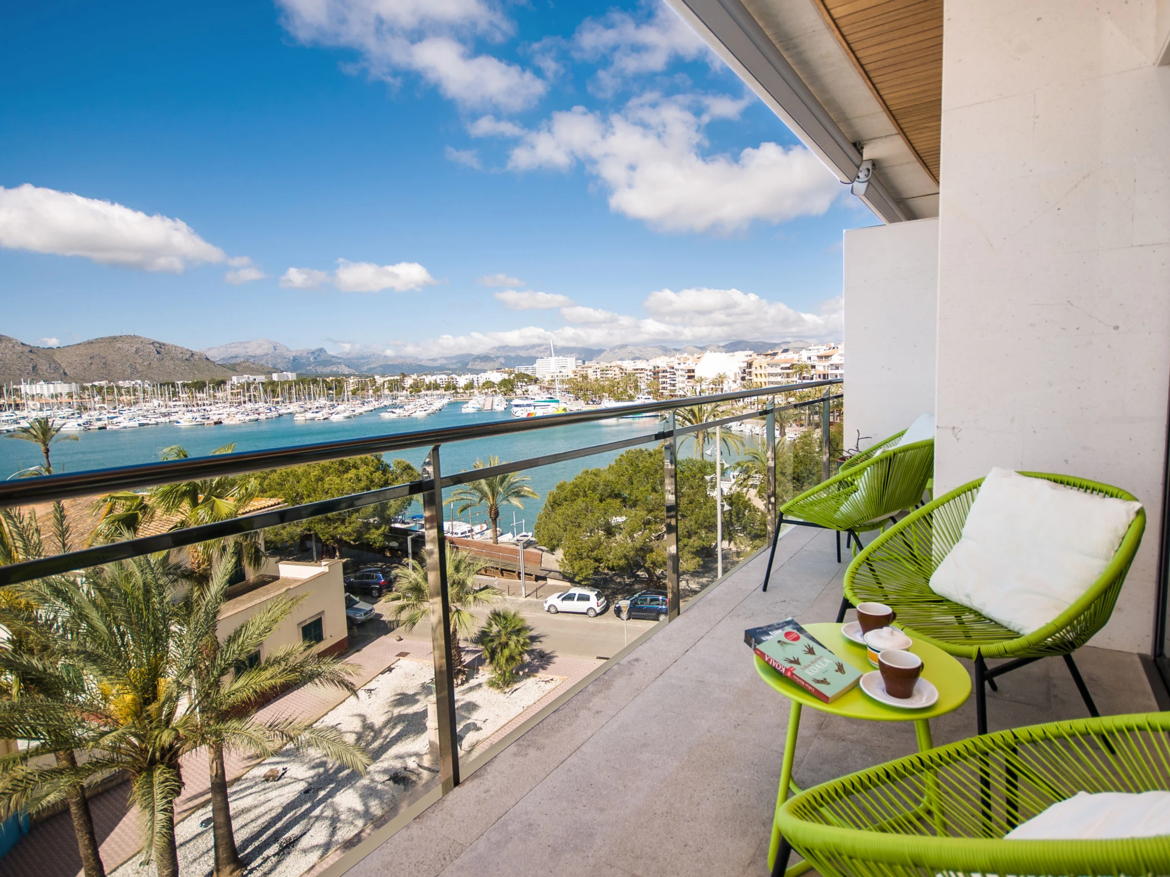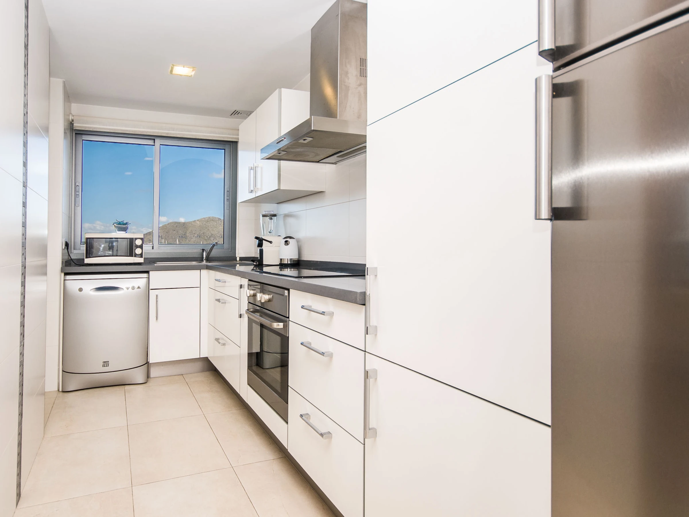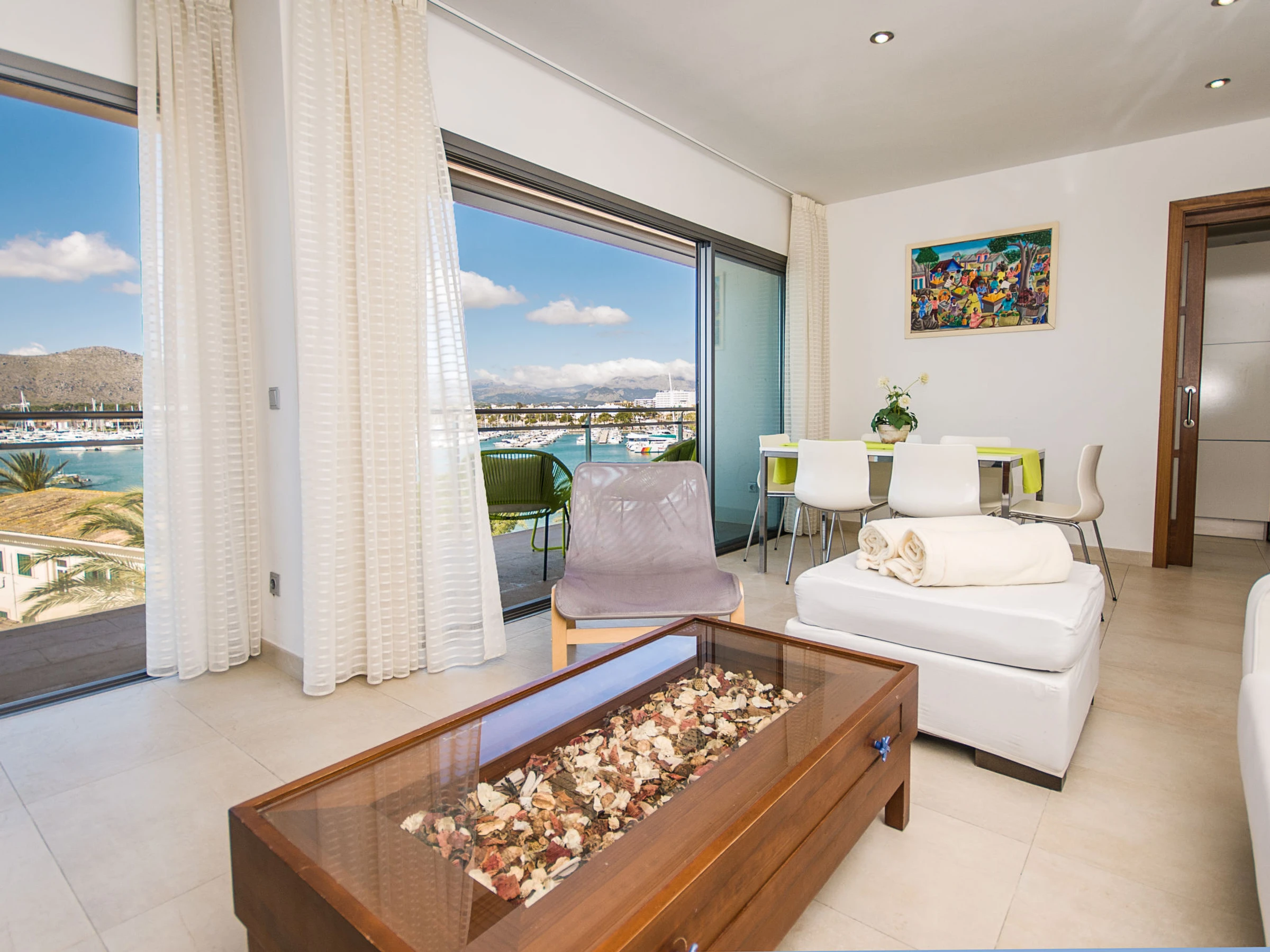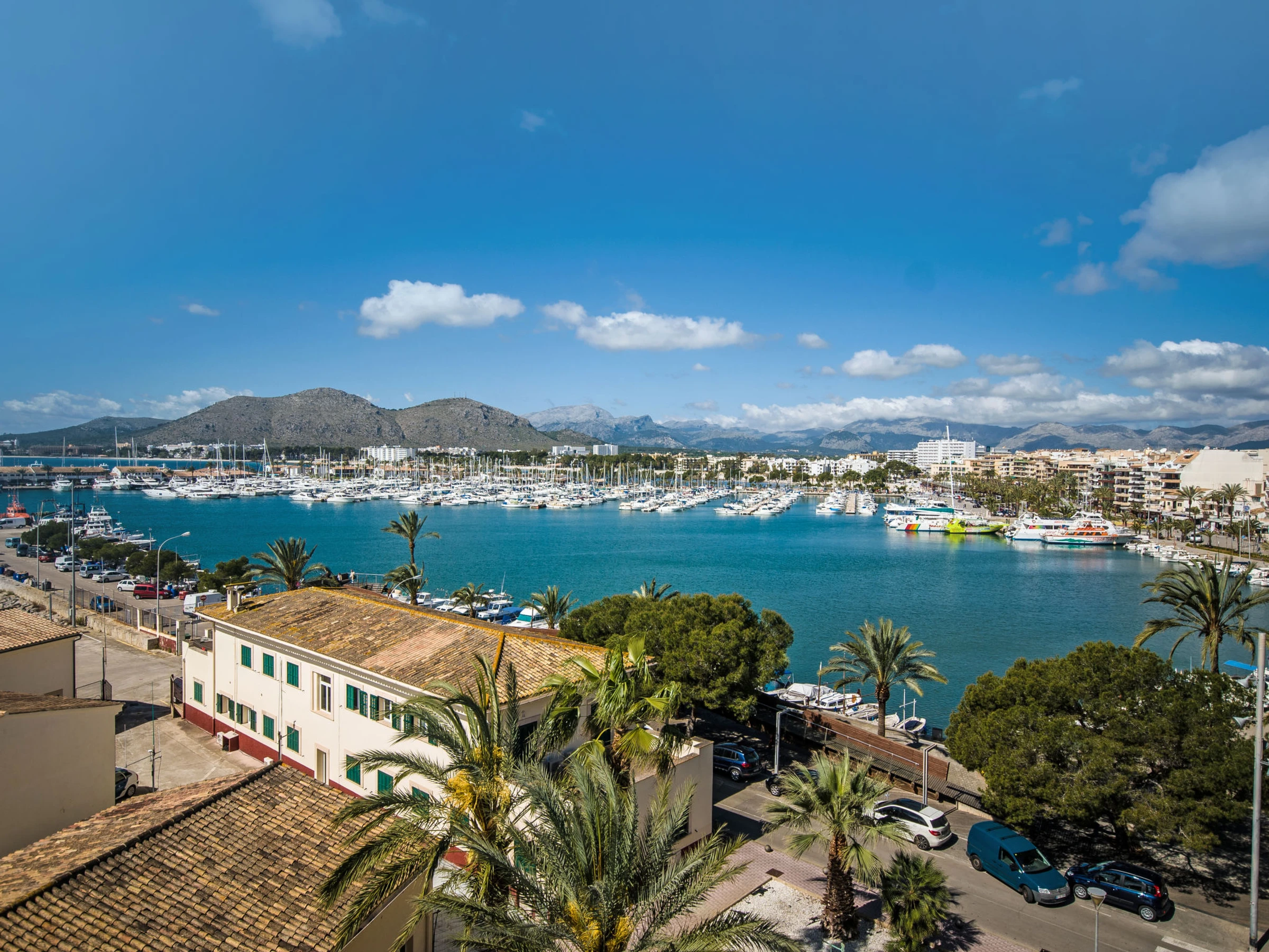 Port d'Alcúdia: Very modern, beautiful apartment block "Paseo Maritimo". In the centre of Port d'Alcúdia, in a sunny position, excellent location: right in the centre but still quiet, 1 km from the edge of the forest, 30 m from the sea, 500 m from the beach. Private: terrace. In the house: internet access, WiFi, air conditioning, washing machine. Shop, grocery, supermarket 100 m, restaurant, bar 10 m, bakery 100 m, café, internet café 10 m, pedestrian zone 15 m, bicycle rental 300 m, pub garden 15 m, 1 minute walk to the centre, bus stop, sandy beach 500 m, shingle beach 1.2 km, rocky beach 900 m, 400 m, swimming bay 1 km. Sports harbour, marina 600 m, golf course (18 hole) 2 km, riding stable 5 km, sports centre 2 km. Nearby attractions: Playa de Aucanada, Playa de Alcúdia, Ermita de La Victoria, Bonaire. Ciudad Romana de Pollentia. Museo de Alcúdia. Playa de Es Barcarés. Hiking paths: Sa Talaïa de Alcudia. Puig de Sant Martí. Please note: suitable for families, suitable for seniors. Object suitable for 5 adults + 1 child groups of teenagers on request only.