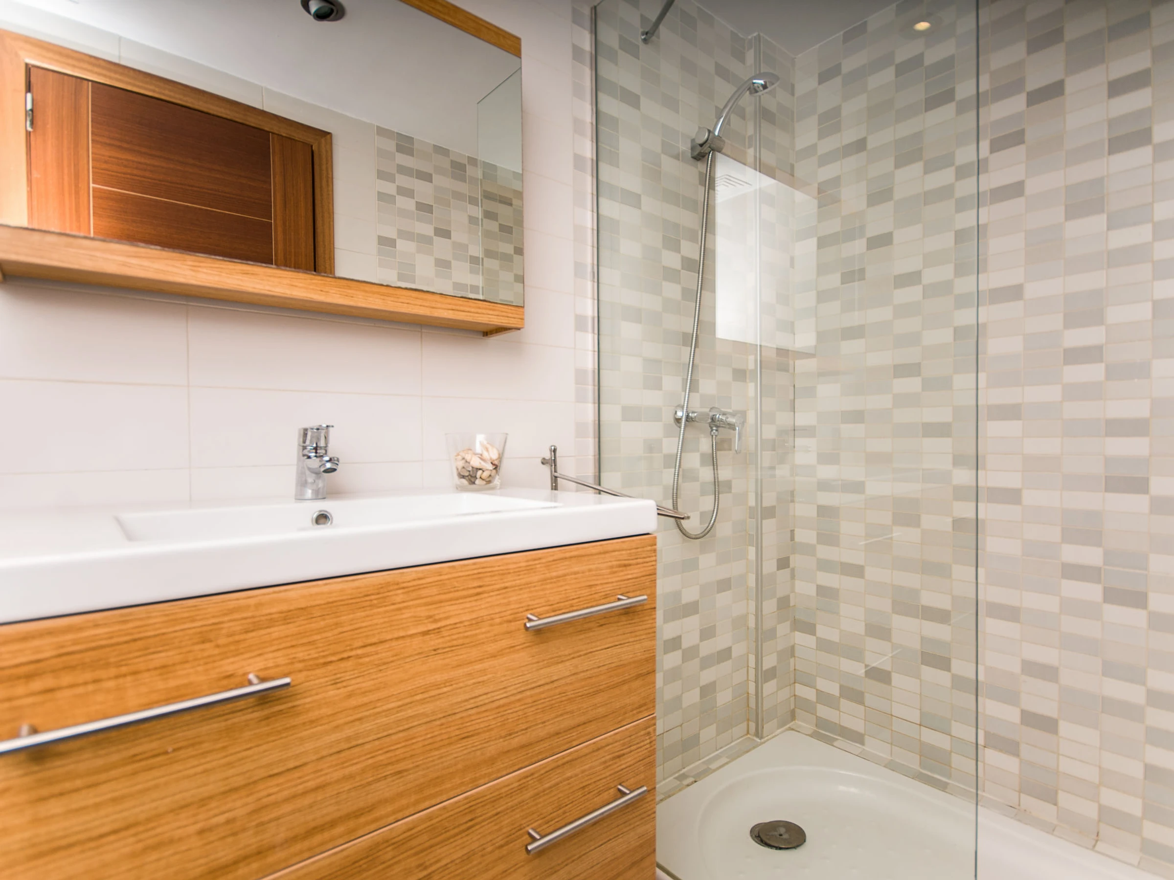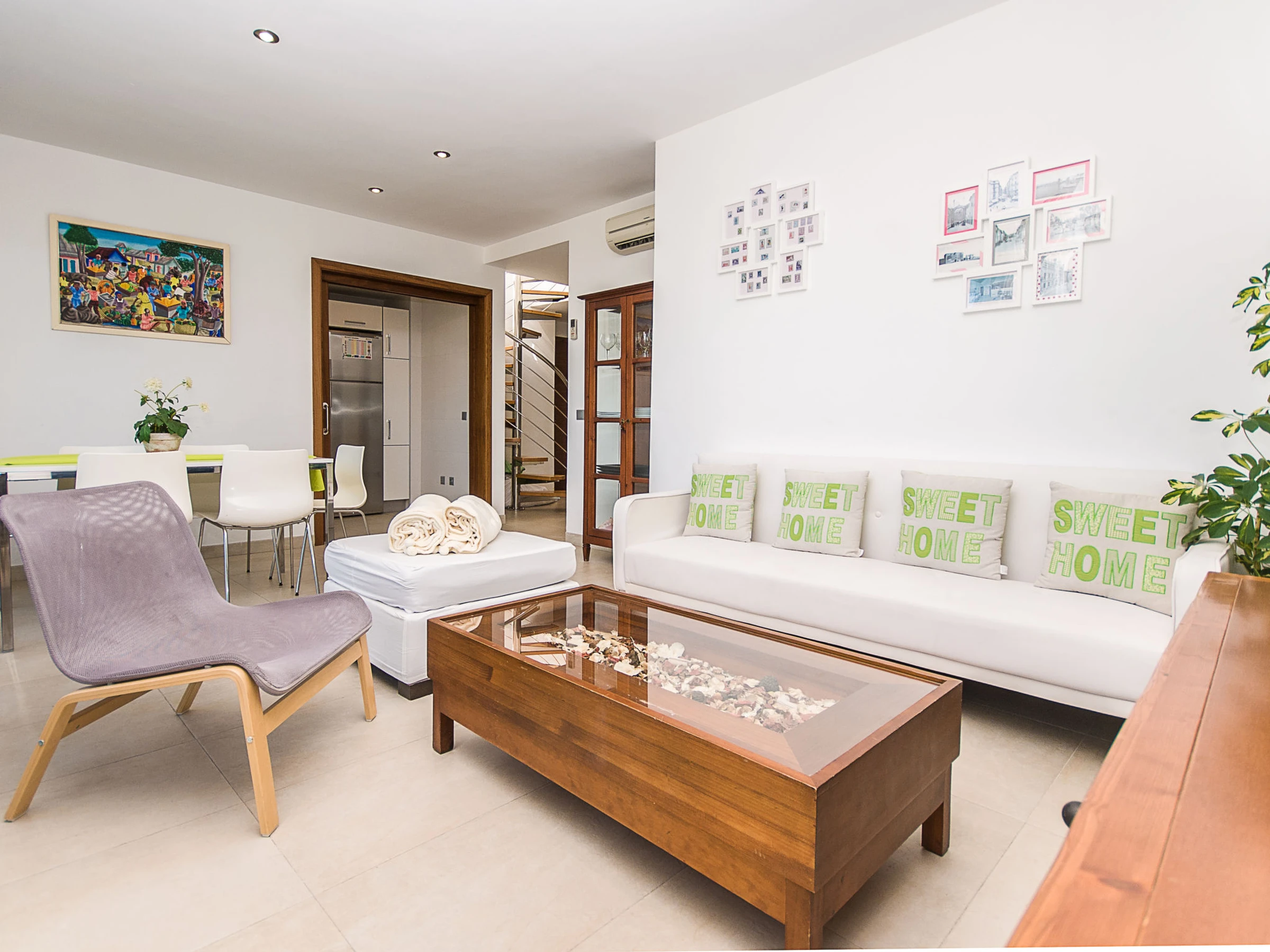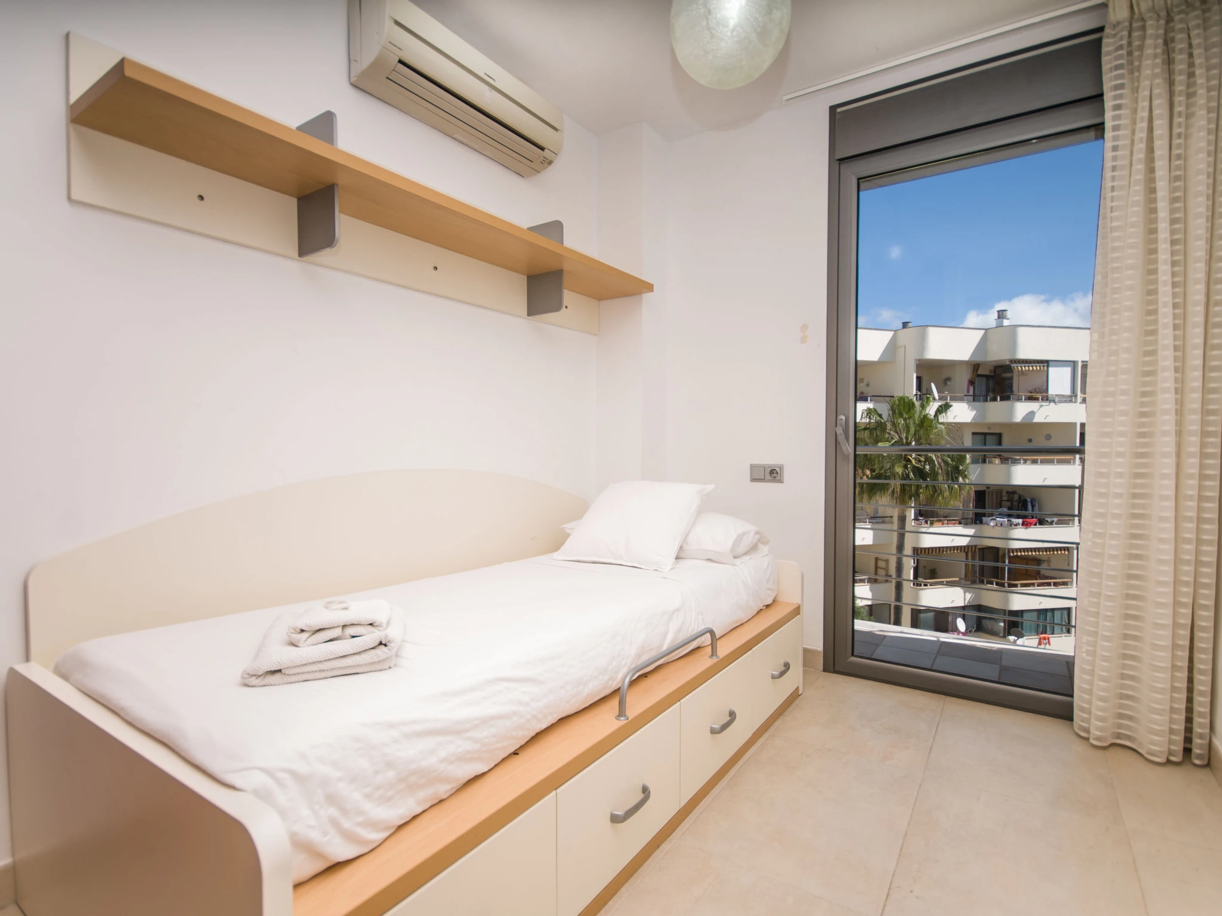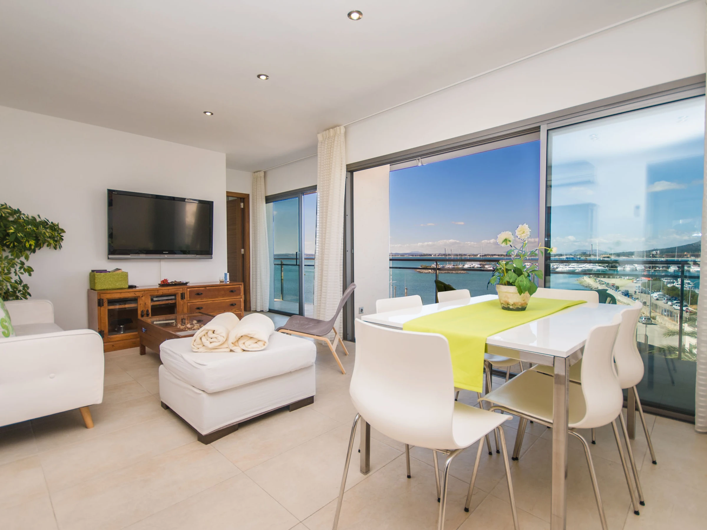 Port d'Alcúdia: Very modern, beautiful apartment block "Paseo Maritimo". In the centre of Port d'Alcúdia, in a sunny position, excellent location: right in the centre but still quiet, 1 km from the edge of the forest, 30 m from the sea, 500 m from the beach. Private: terrace. In the house: internet access, WiFi, air conditioning, washing machine. Shop, grocery, supermarket 100 m, restaurant, bar 10 m, bakery 100 m, café, internet café 10 m, pedestrian zone 15 m, bicycle rental 300 m, pub garden 15 m, 1 minute walk to the centre, bus stop, sandy beach 500 m, shingle beach 1.2 km, rocky beach 900 m, 400 m, swimming bay 1 km. Sports harbour, marina 600 m, golf course (18 hole) 2 km, riding stable 5 km, sports centre 2 km. Nearby attractions: Playa de Aucanada, Playa de Alcúdia, Ermita de La Victoria, Bonaire. Ciudad Romana de Pollentia. Museo de Alcúdia. Playa de Es Barcarés. Hiking paths: Sa Talaïa de Alcudia. Puig de Sant Martí. Please note: suitable for families, suitable for seniors. Object suitable for 5 adults + 1 child groups of teenagers on request only.