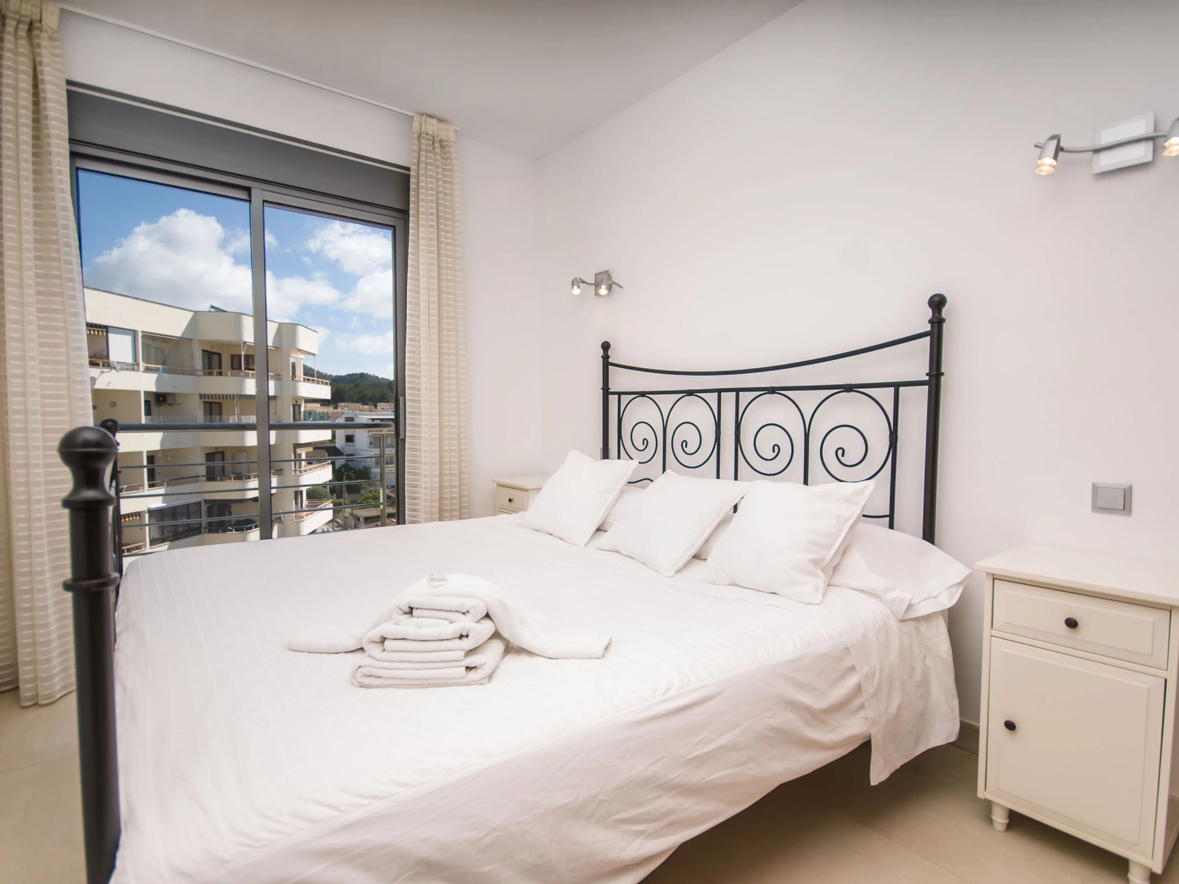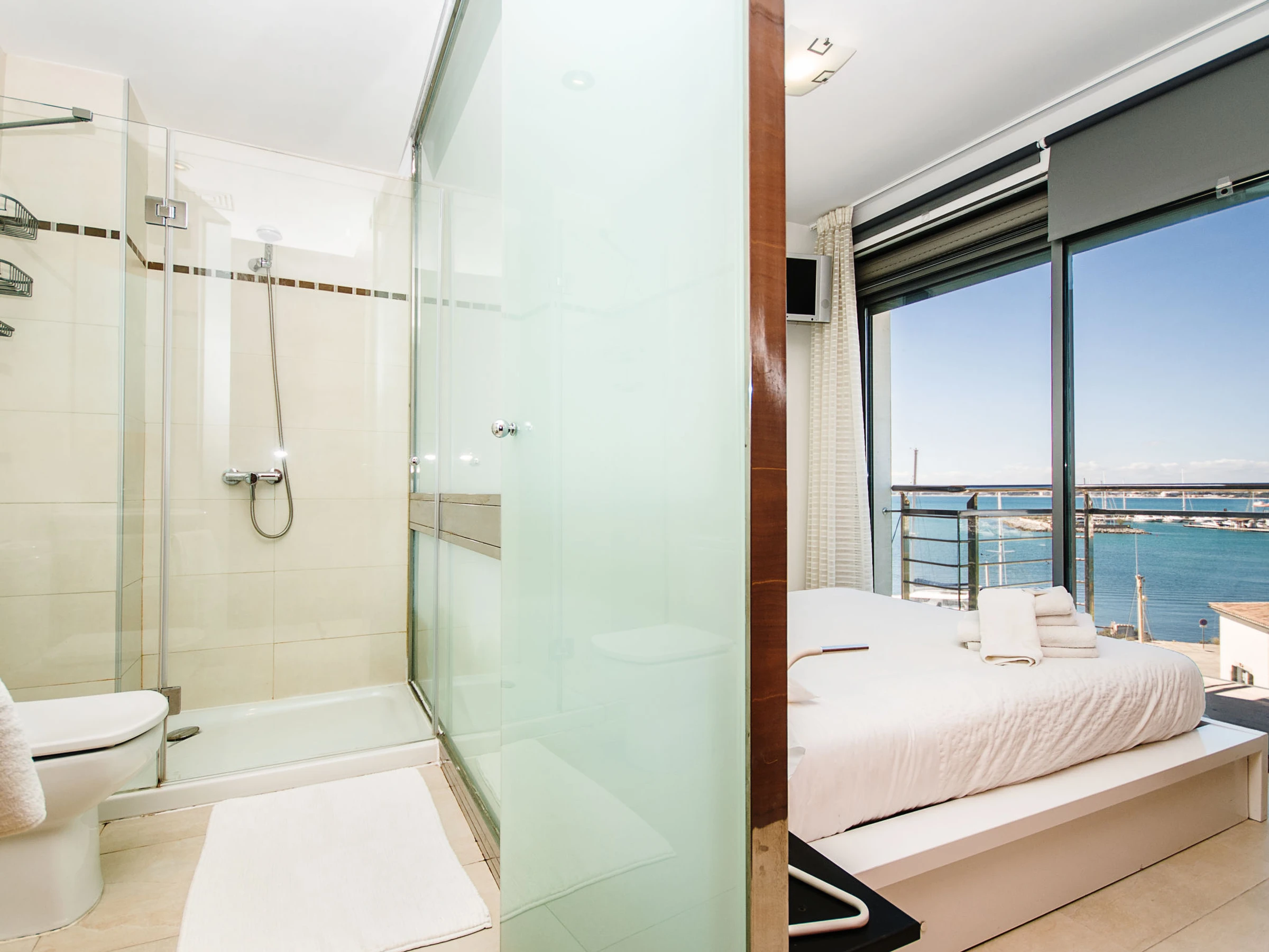 "Paseo Maritimo", 4-room apartment 120 m2 on 2 levels on 4th floor. Object suitable for 5 adults + 1 child. Spacious and bright, very comfortable and cosy furnishings: open large living/dining room with sliding door, panoramic window with dining table, TV, international TV channels, flat screen, air conditioning and forced-air heating. Exit to the balcony. 1 large double bedroom with sliding door, panoramic window with 1 french bed (150 cm), bath/shower/WC, TV, air conditioning and forced-air heating. Exit to the balcony. 1 large double bedroom with panoramic window with 1 french bed (150 cm), air conditioning and forced-air heating. 1 room with sliding door, panoramic window with 1 pull-out bed (2 pers. 2 x 90 cm), air conditioning and forced-air heating. Exit to the balcony. Kitchen (oven, dishwasher, 3 ceramic glass hob hotplates, toaster, kettle, microwave, freezer, electric coffee machine). Bath/shower/WC. Large balcony, large terrace. Terrace furniture, balcony furniture, deck chairs. Marvellous panoramic view of the mountains, the ocean and the bay. Facilities: washing machine, iron, children's high chair, baby cot, hair dryer. Internet (WiFi, free). Suitable for families. [hidden]