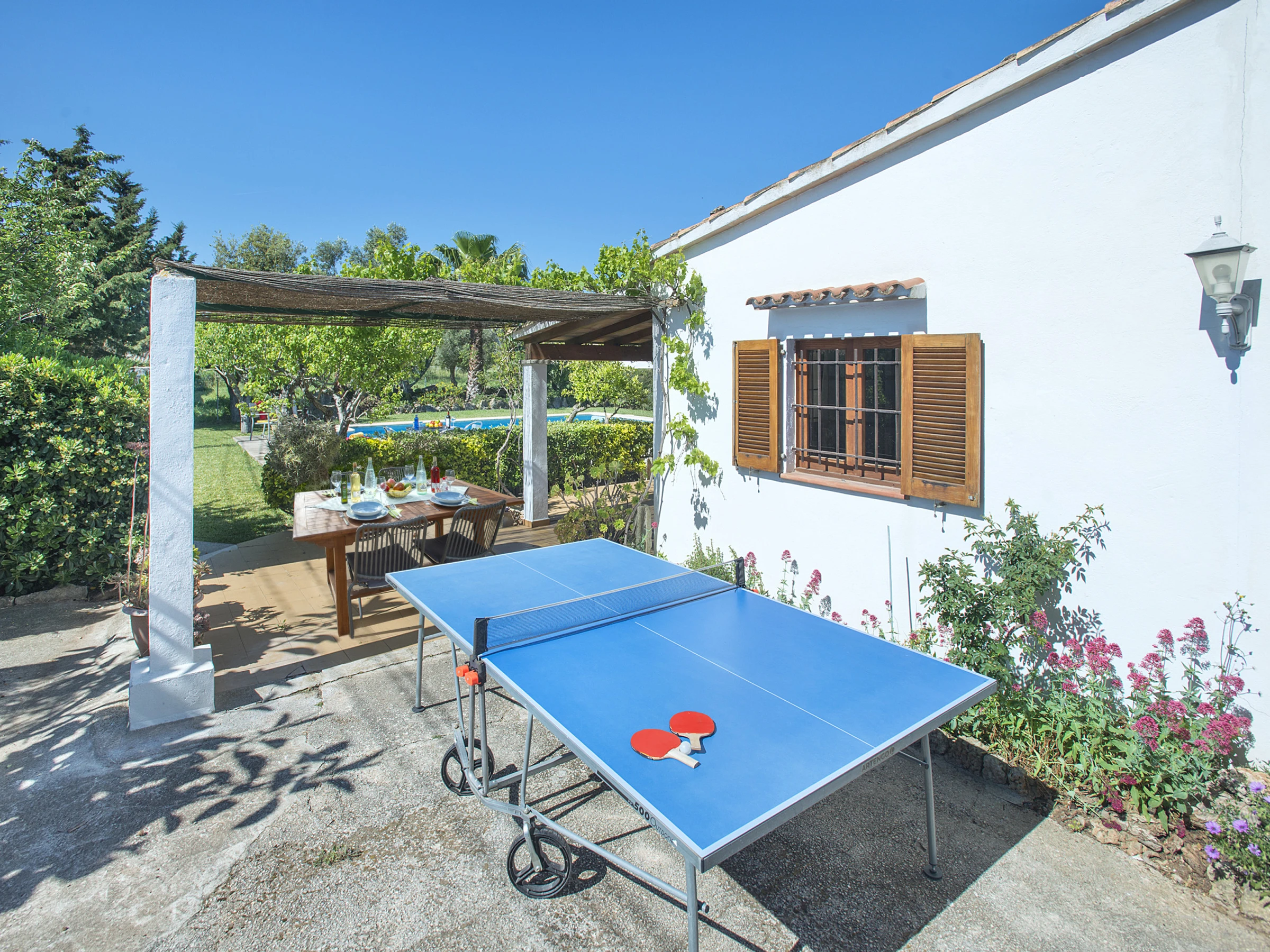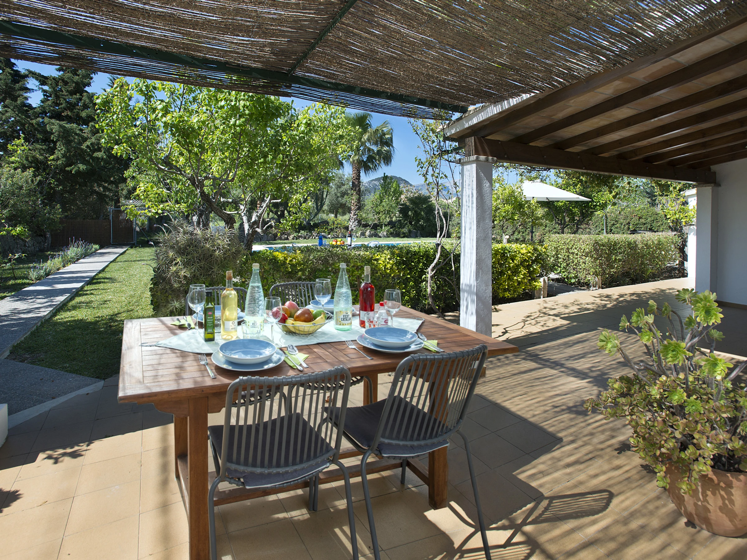 The villa is in a typical Mallorcan rustic style with a furnished terrace overlooking the garden and the pool with its lawn area. The terrace and garden have views of the