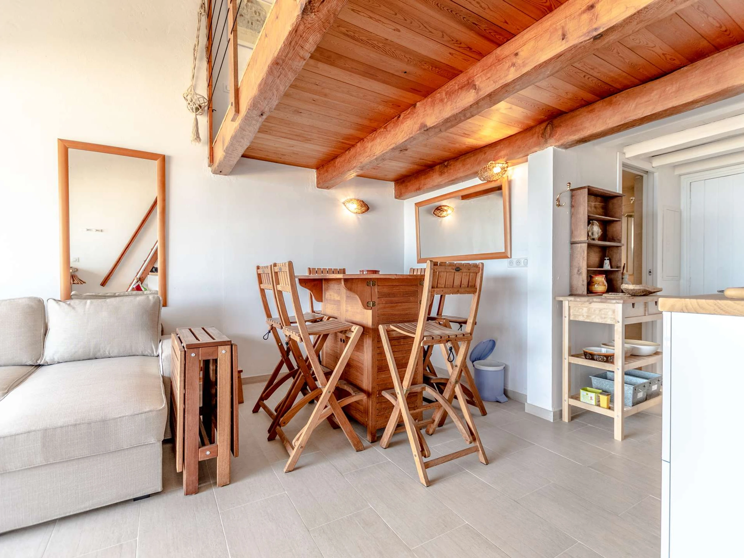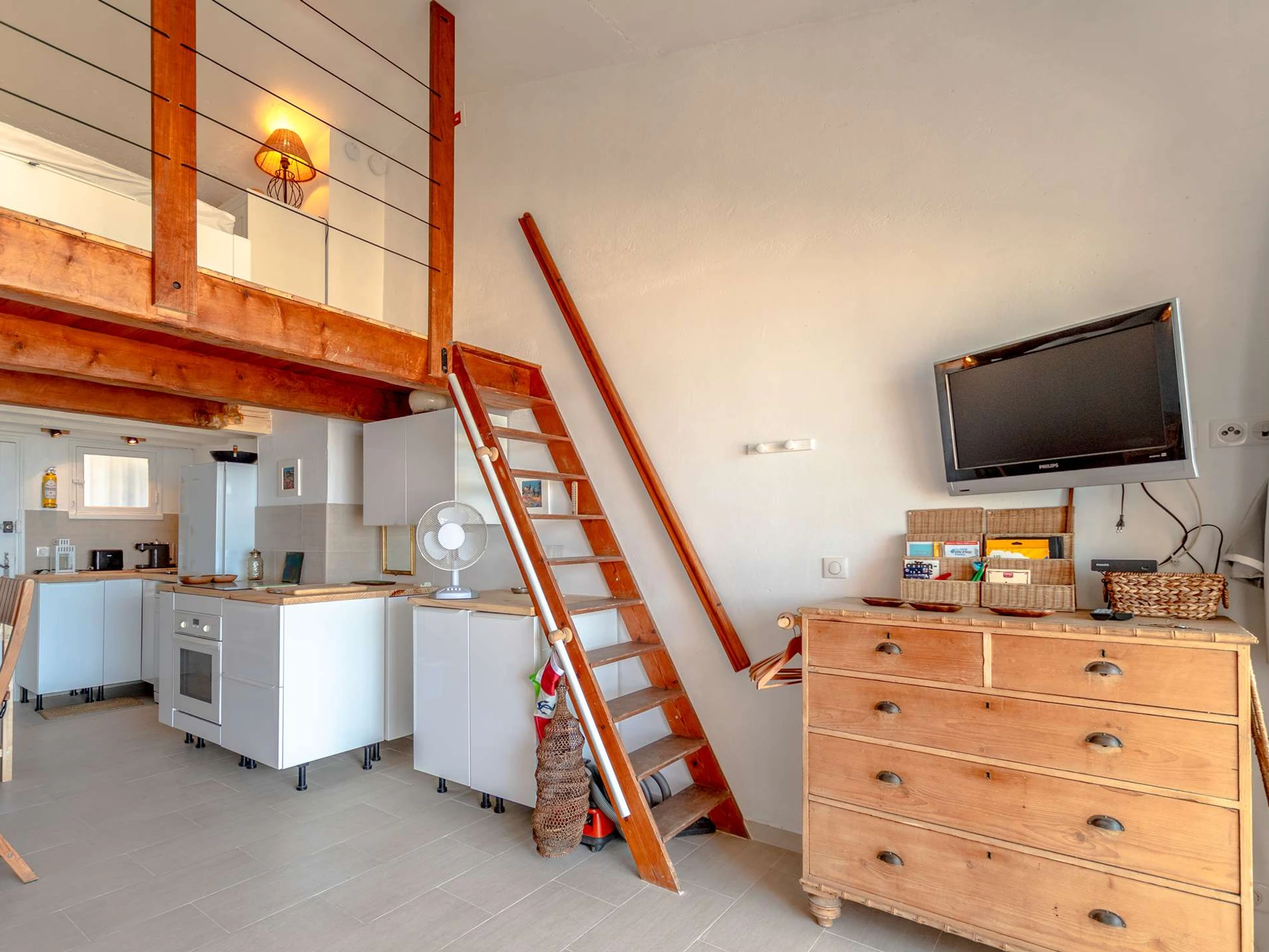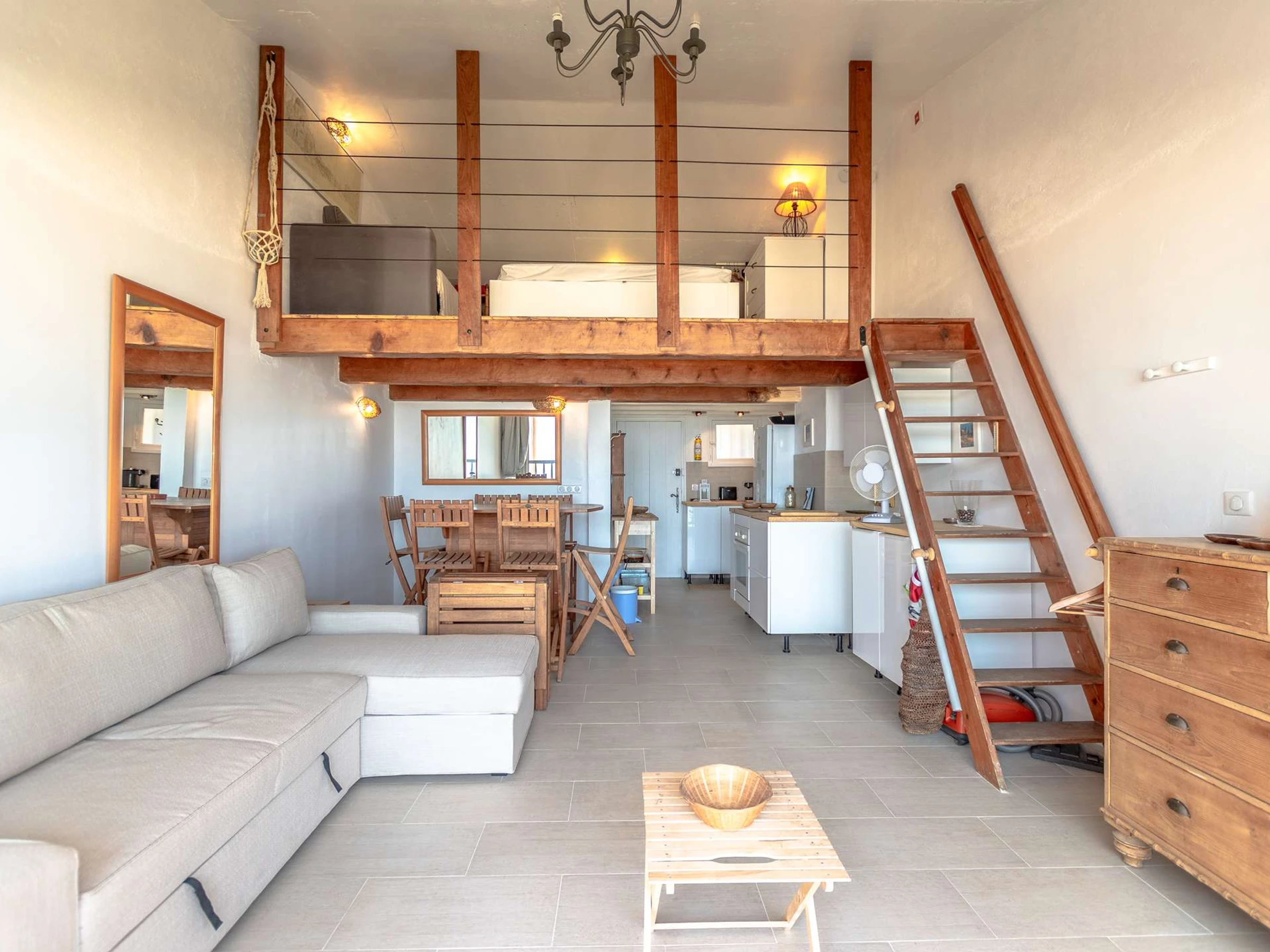 Upstairs, the mezzanine bedroom has a 160 cm double bed, providing an intimate and comfortable space for restful nights.