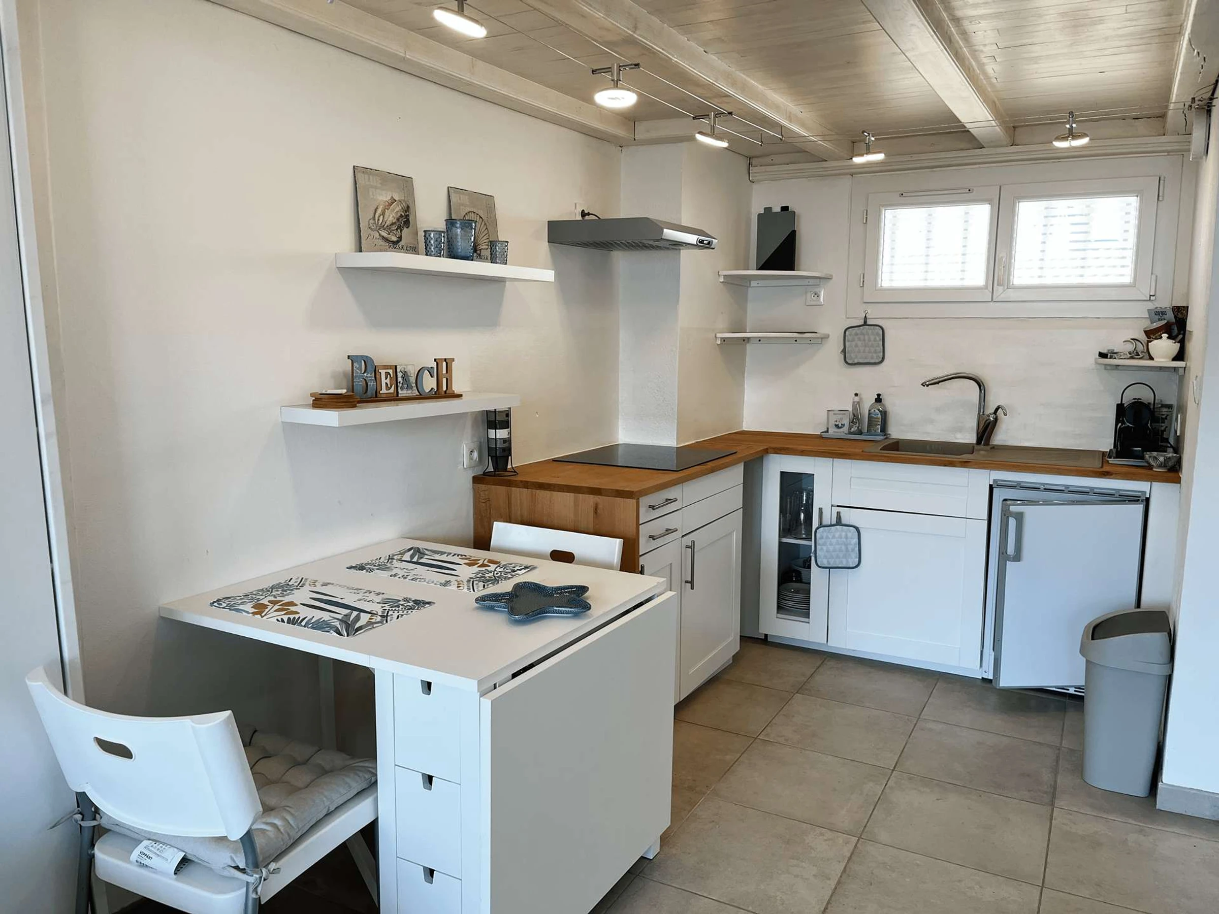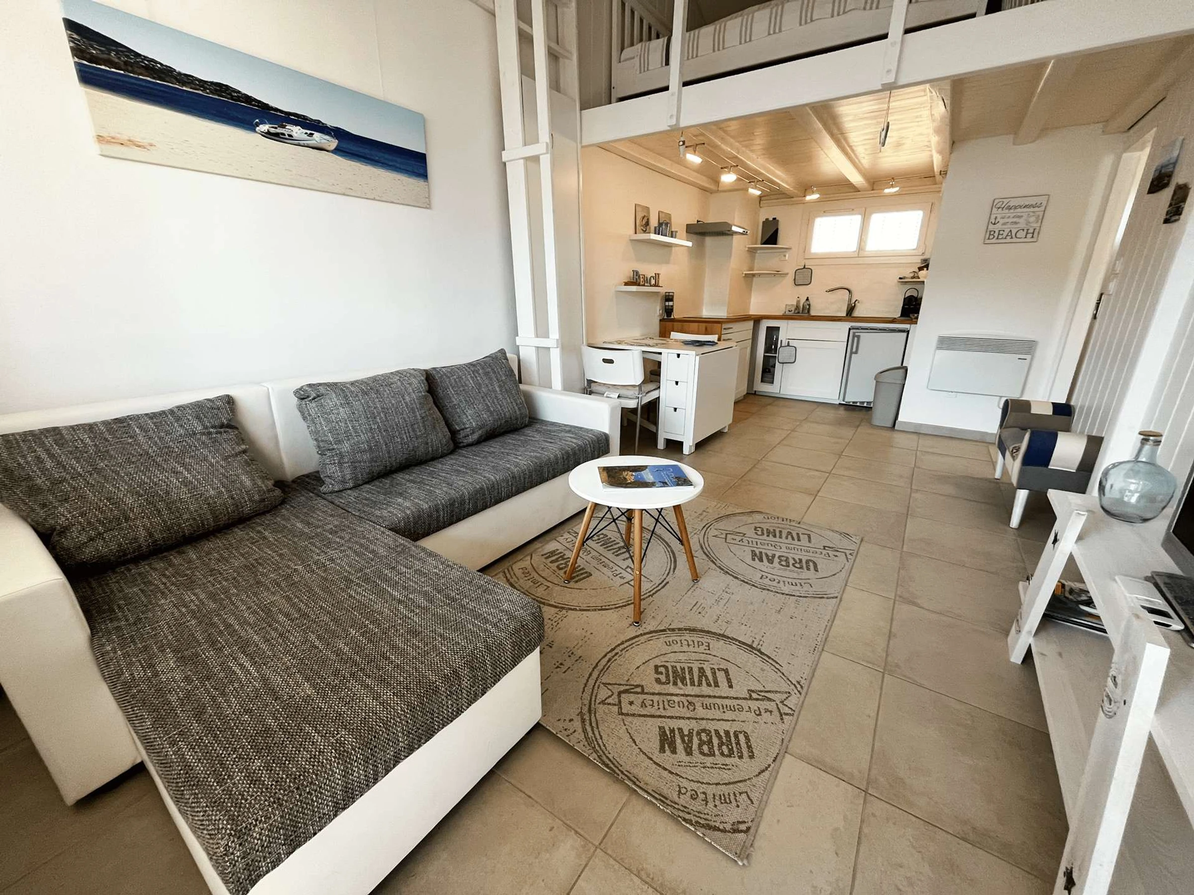 The living room, flooded with light thanks to its high ceilings, is air-conditioned and furnished with a sofa bed suitable for a child. It opens onto a fully equipped open kitchen, with everything you need to prepare your meals with ease.