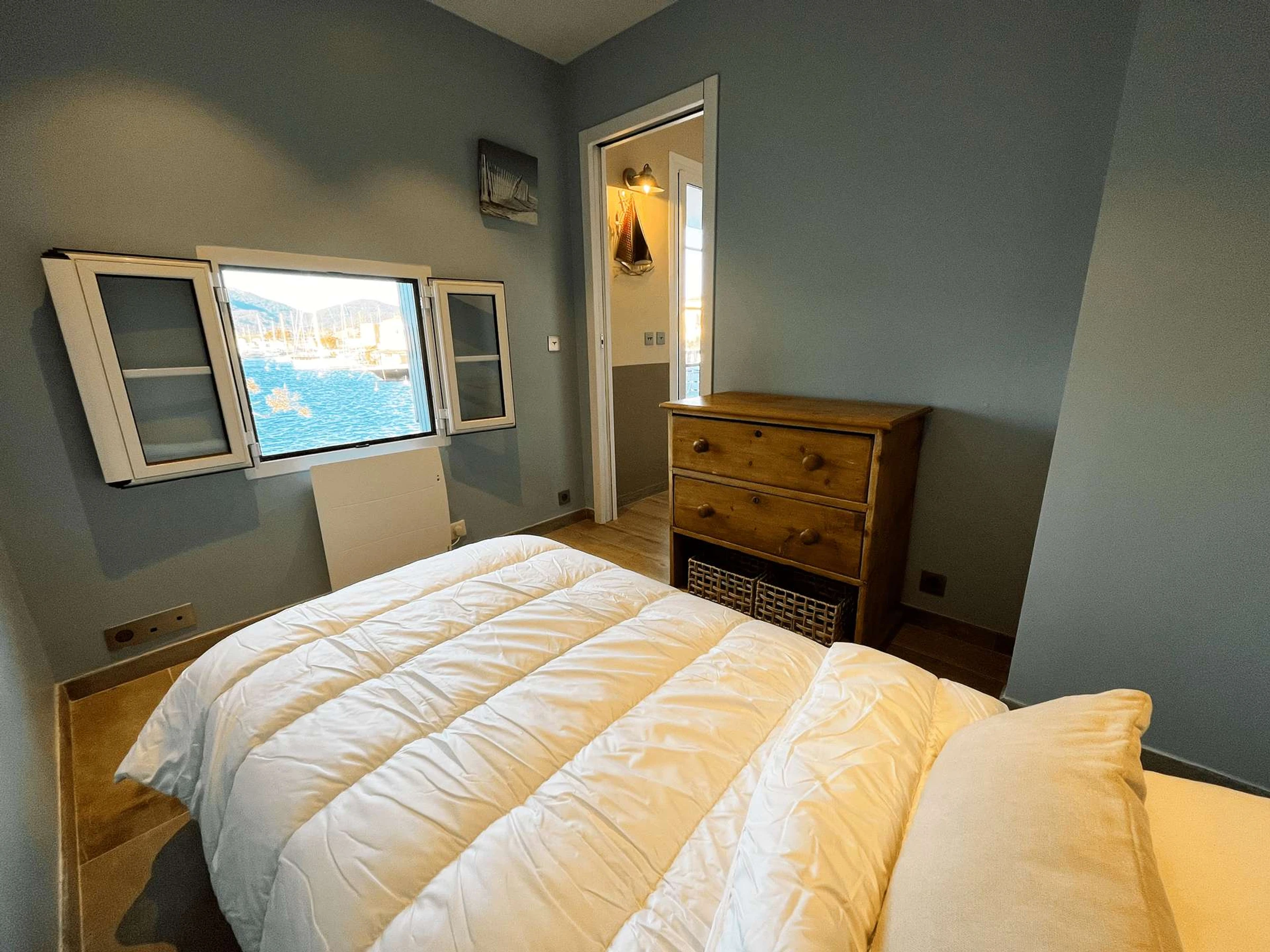 The air-conditioned living room, filled with natural light, opens onto a large balcony, perfect for lunch for 4 while enjoying the view of the port entrance. The living area also features a fully equipped open kitchen, functional and pleasant.