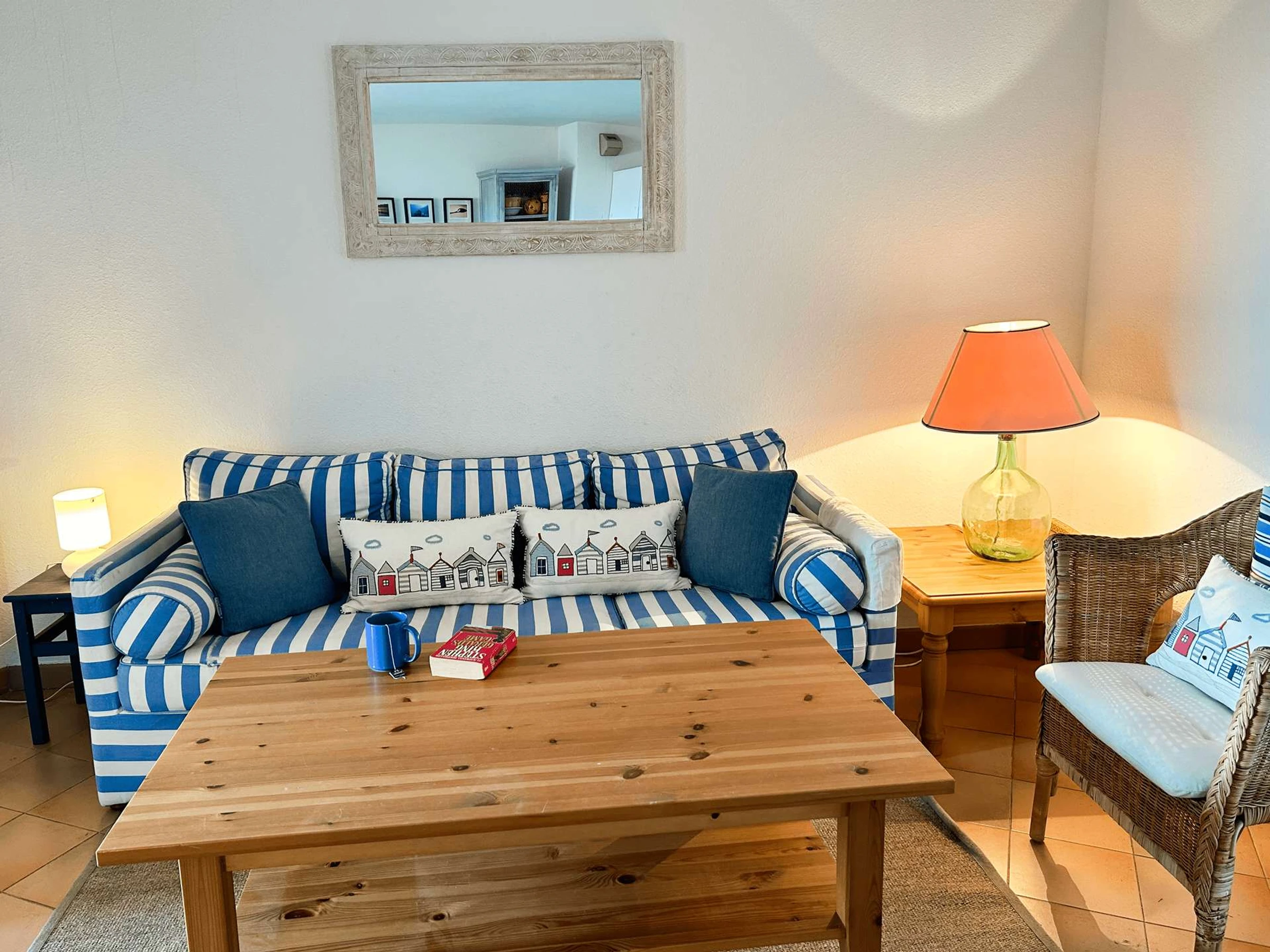 It is composed of a wide living-room with an open-plan kitchen, a large bedroom with a double bed (160 cm), a smaller bedroom with bunk beds, a bathroom and separate toilets.