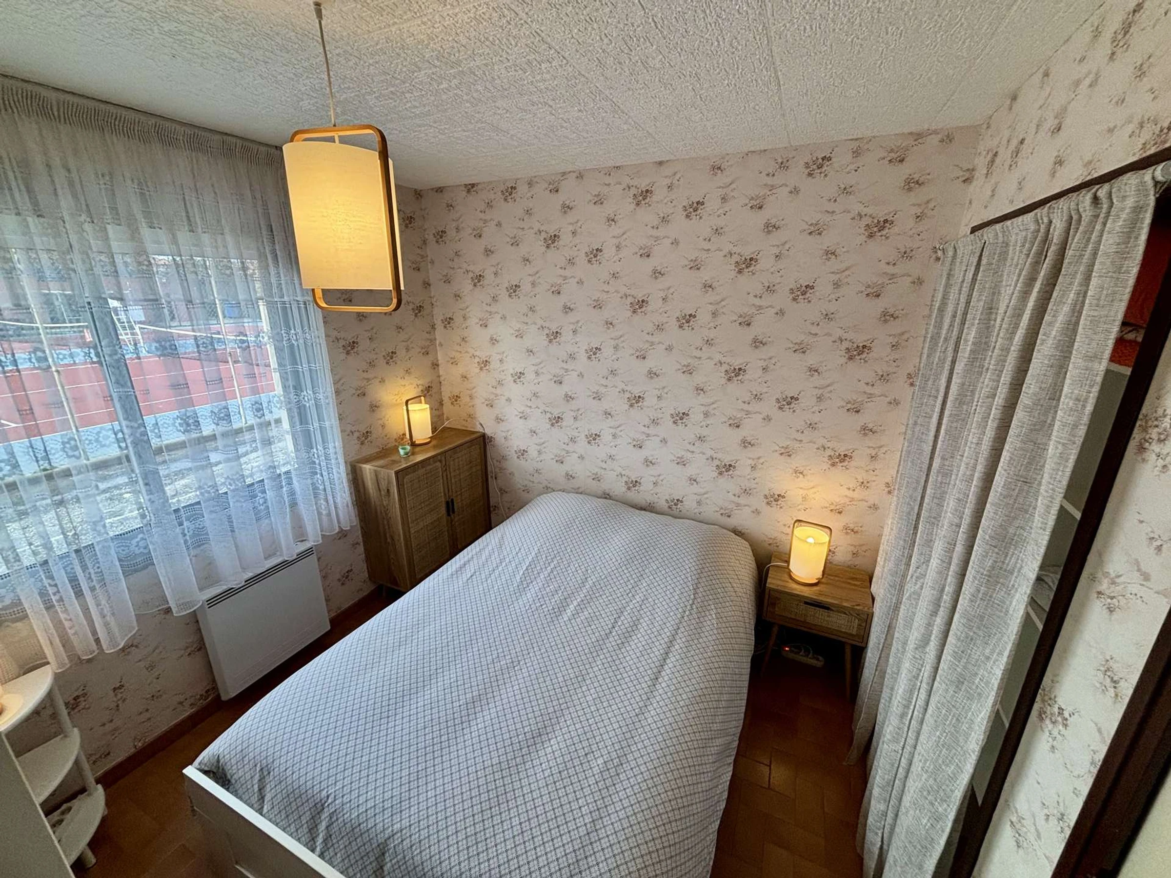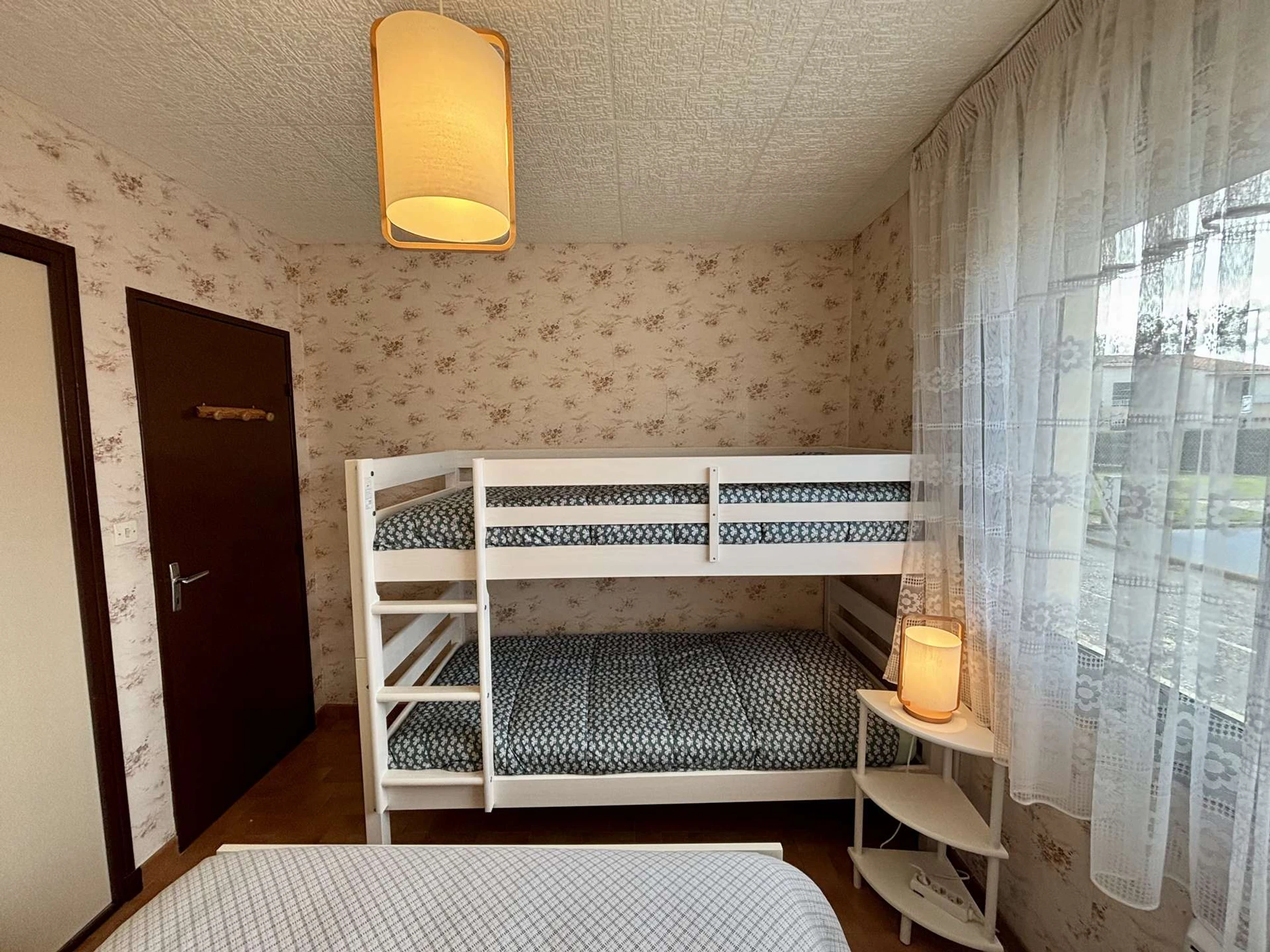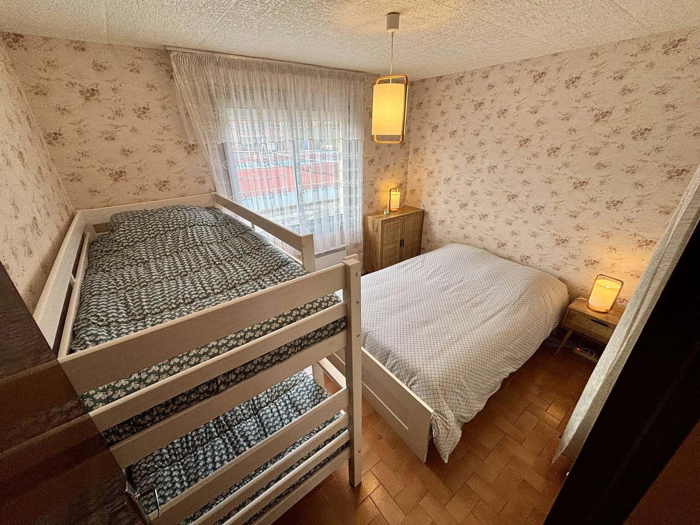 Une chambre avec un lit double (140 cm) et deux lits superposés (90 cm)