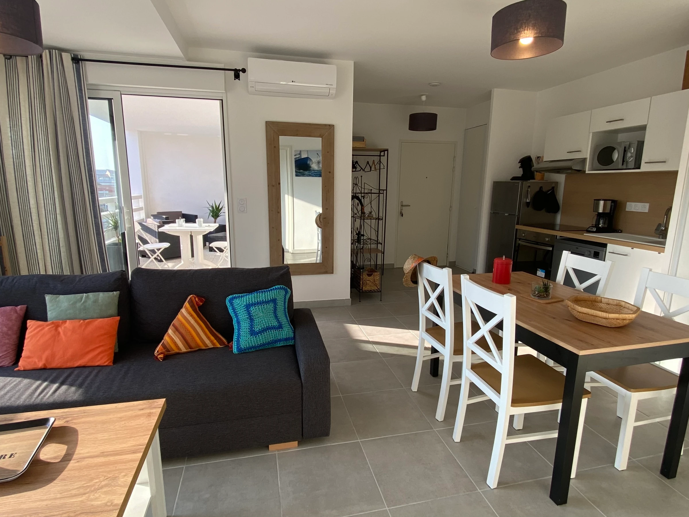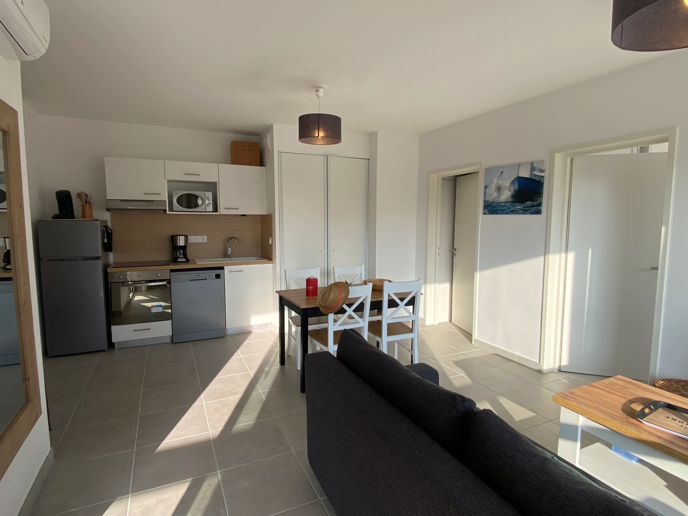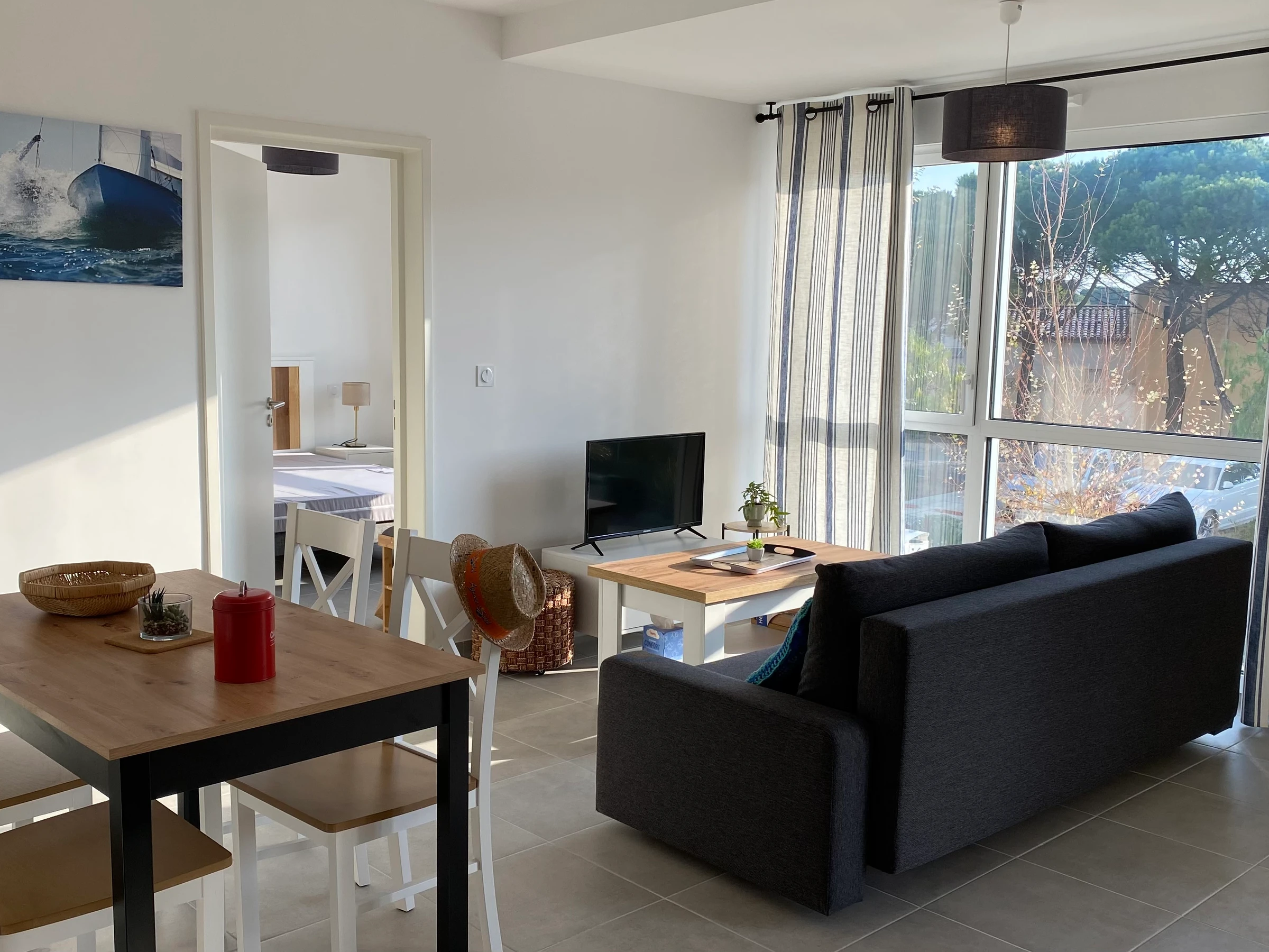 Les Voiles Blanches Residence. Beautiful one-bedroom apartment located on the 1st floor with elevator, facing southeast. Ideal for 4 people. Bright, air-conditioned living room (sofa bed, TV) opening onto a fully equipped kitchenette (large refrigerator, dishwasher, oven) with access to a terrace overlooking the lovely promenade (sofa, armchairs), 1 bedroom (double bed), dressing room, 1 shower room with toilet (washing machine). Bed linen and towels are provided during your stay. Cleaning service included. You have a private and secure parking space within the residence. Pets are not allowed. 400m from the beach... This prime seaside resort is uniquely situated on the coastal strip separating the Leucate lagoon and its oyster beds from the Gulf of Lion. With vineyards stretching as far as the eye can see as a backdrop, the majestic Canigou, the highest peak in the Pyrénées-Orientales, and its ski slopes just an hour and a half away, your gaze is drawn to the horizon: the Mediterranean Sea lies before you, along with its magnificent beaches extending for 18 km.