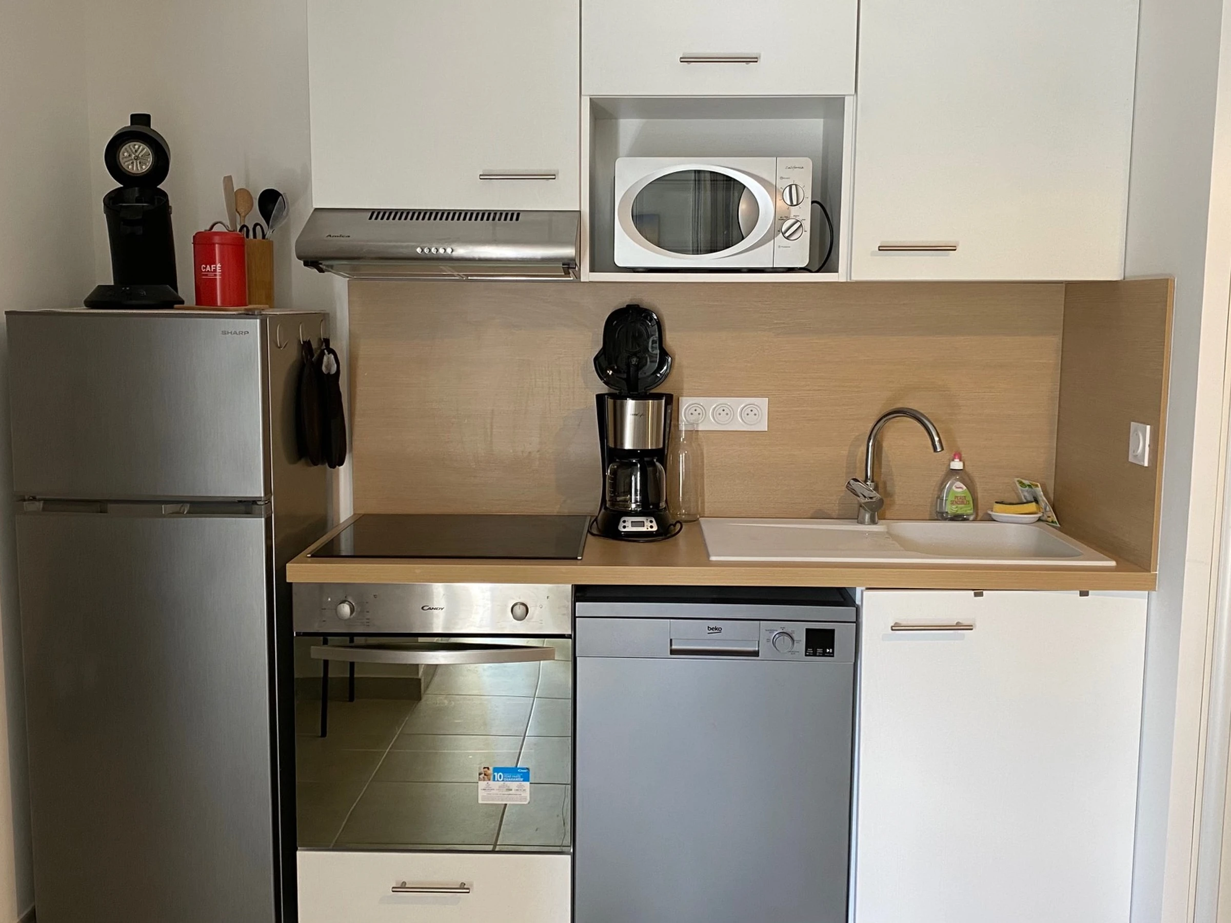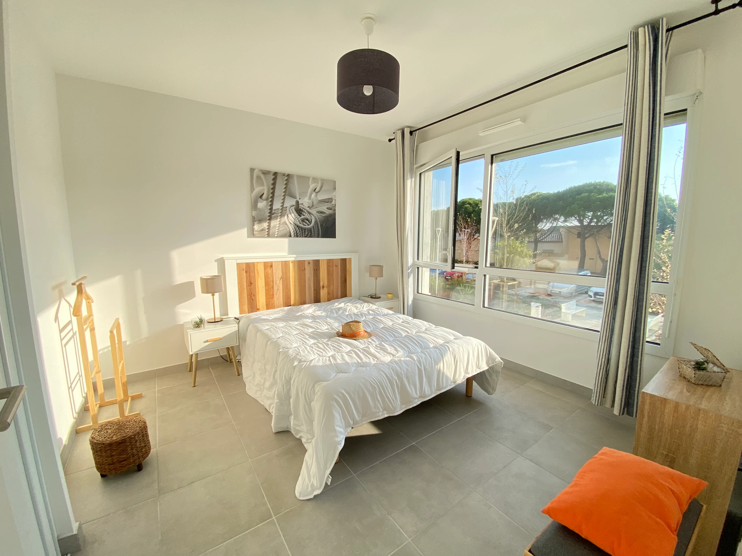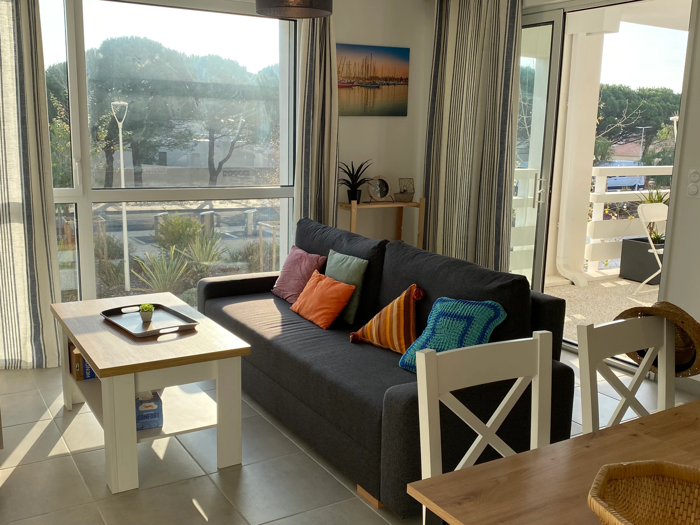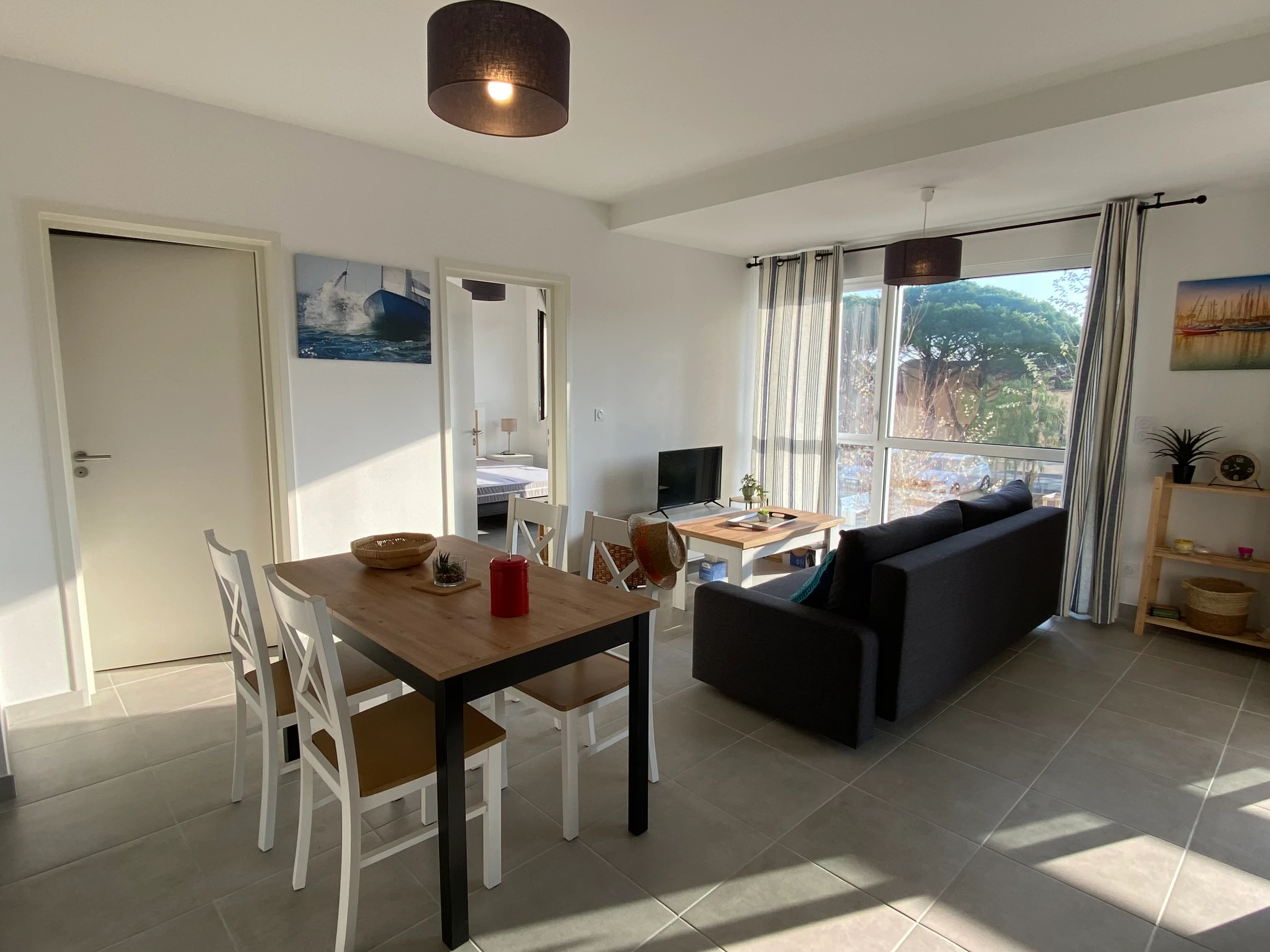 Les Voiles Blanches Residence. Beautiful one-bedroom apartment located on the 1st floor with elevator, facing southeast. Ideal for 4 people. Bright, air-conditioned living room (sofa bed, TV) opening onto a fully equipped kitchenette (large refrigerator, dishwasher, oven) with access to a terrace overlooking the lovely promenade (sofa, armchairs), 1 bedroom (double bed), dressing room, 1 shower room with toilet (washing machine). Bed linen and towels are provided during your stay. Cleaning service included. You have a private and secure parking space within the residence. Pets are not allowed. 400m from the beach... This prime seaside resort is uniquely situated on the coastal strip separating the Leucate lagoon and its oyster beds from the Gulf of Lion. With vineyards stretching as far as the eye can see as a backdrop, the majestic Canigou, the highest peak in the Pyrénées-Orientales, and its ski slopes just an hour and a half away, your gaze is drawn to the horizon: the Mediterranean Sea lies before you, along with its magnificent beaches extending for 18 km.