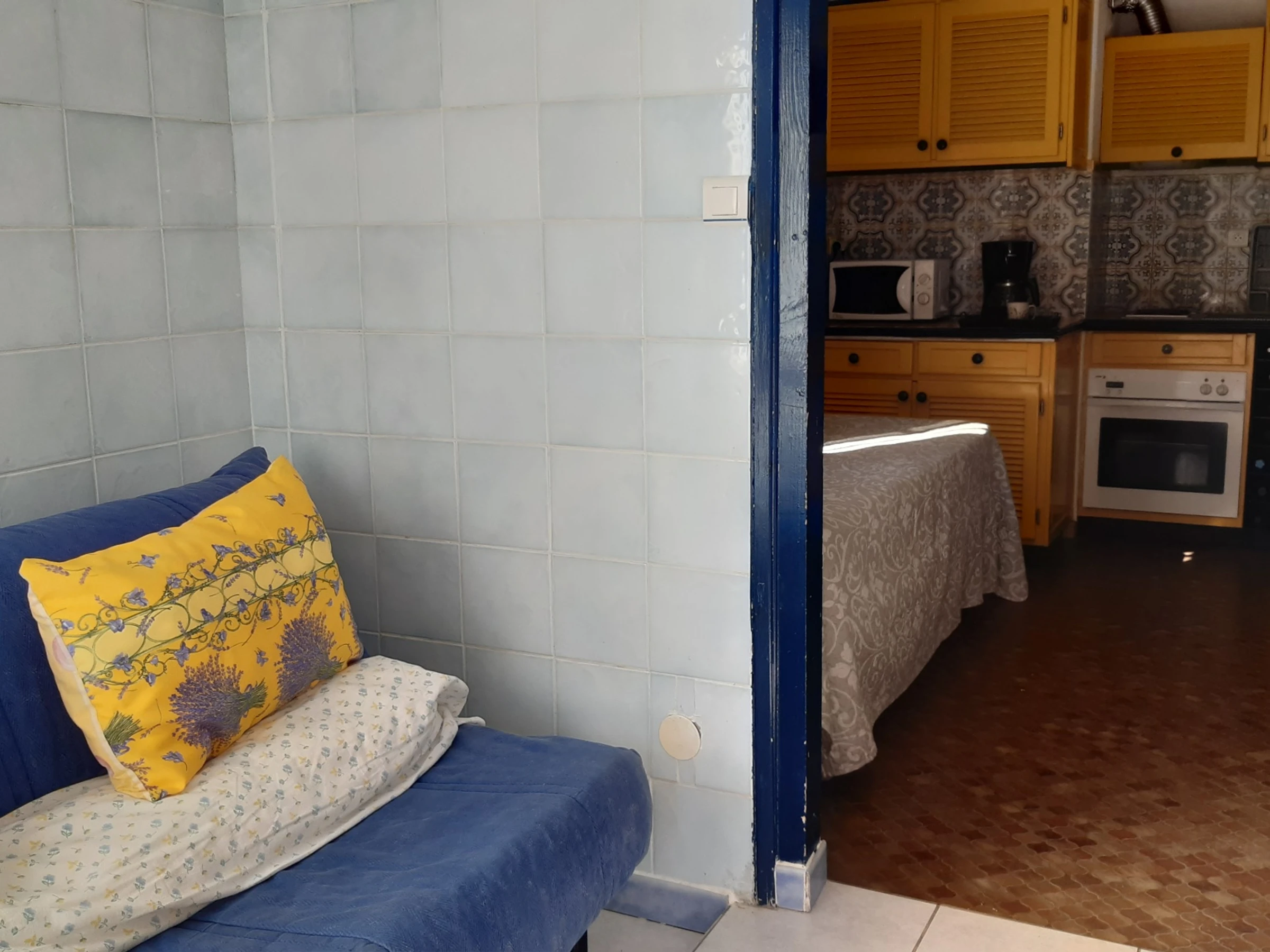 Living room (1 single bed) opening onto the equipped kitchen area, one bedroom (1 double bed), a sleeping area in the loggia (sofa bed), and a bathroom with toilet. Private parking space in the garden.