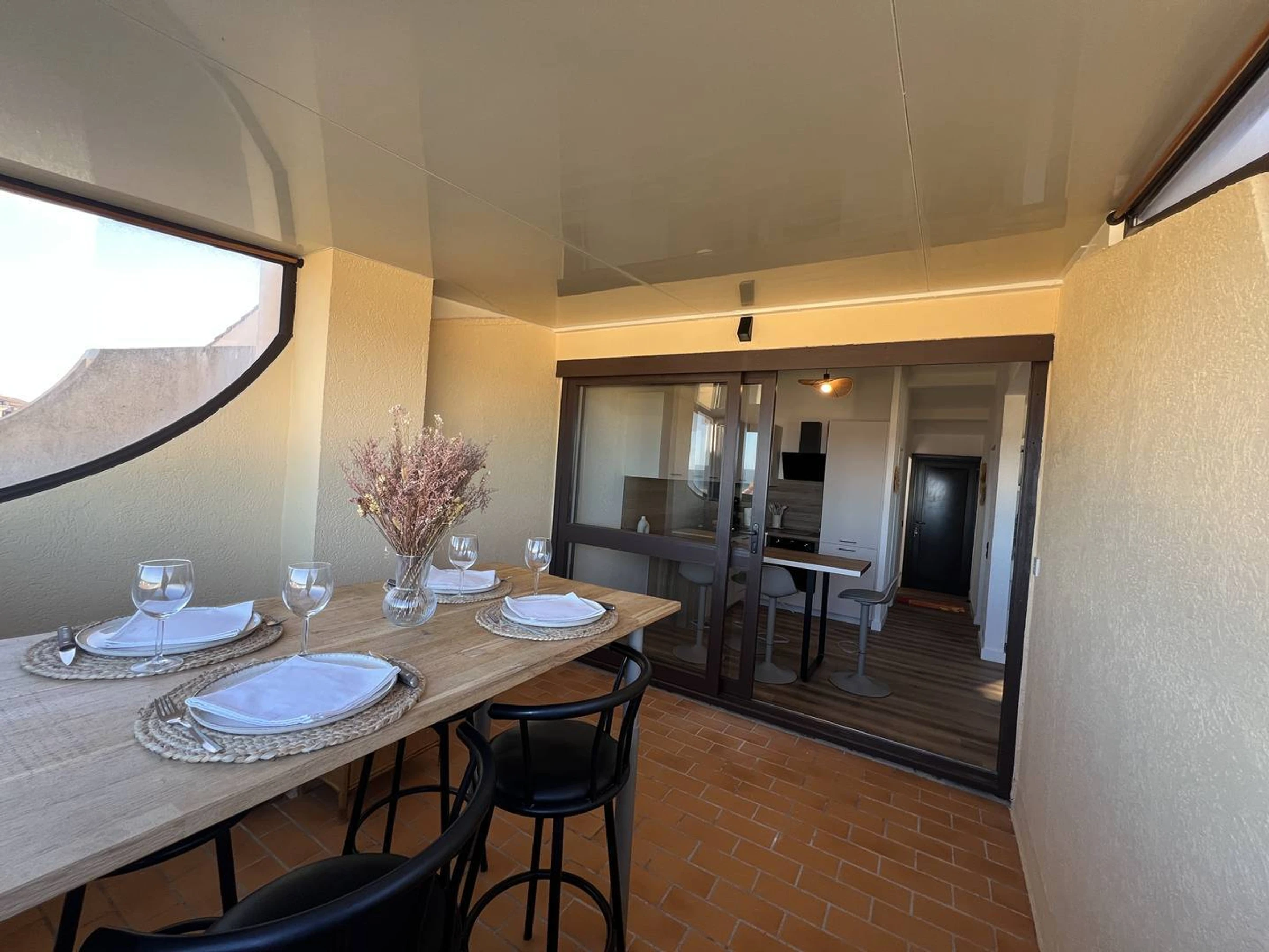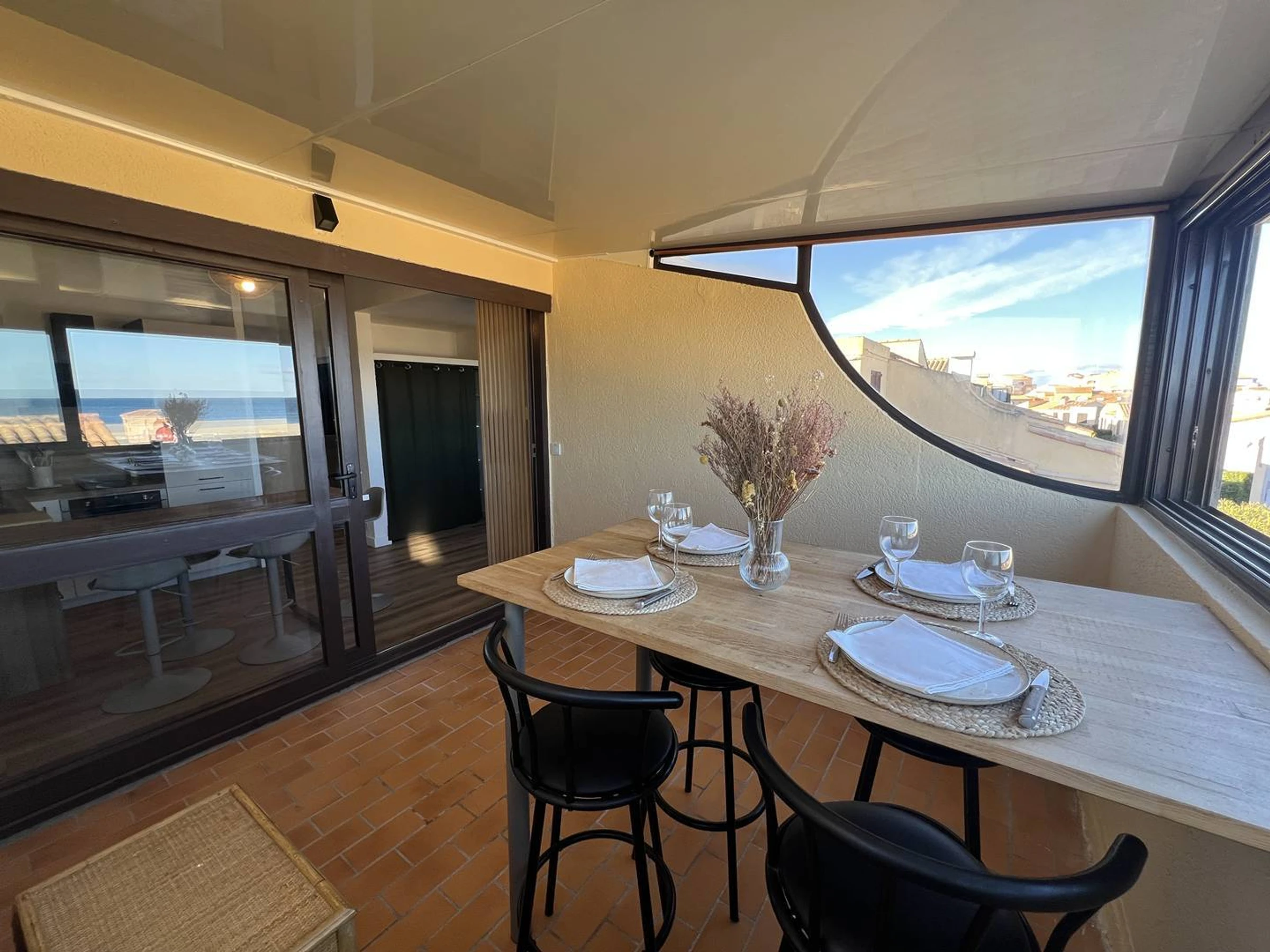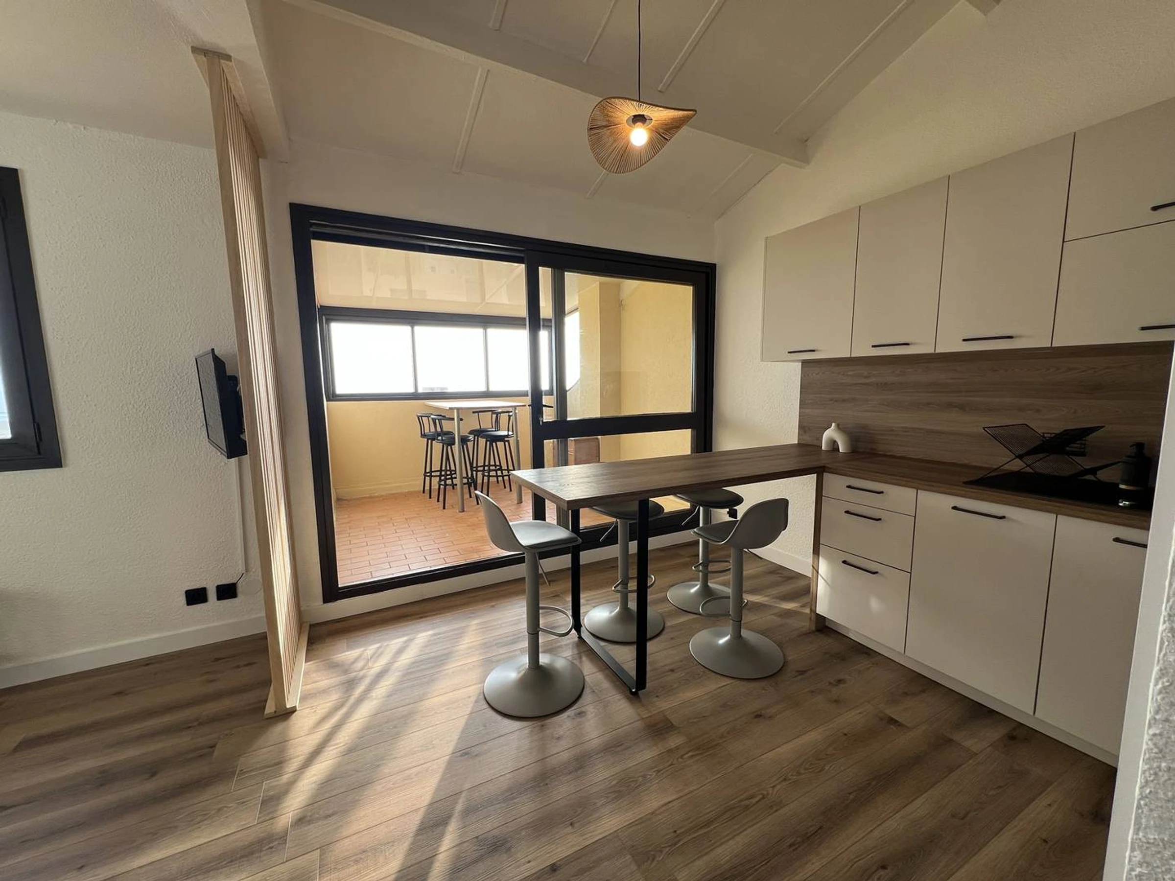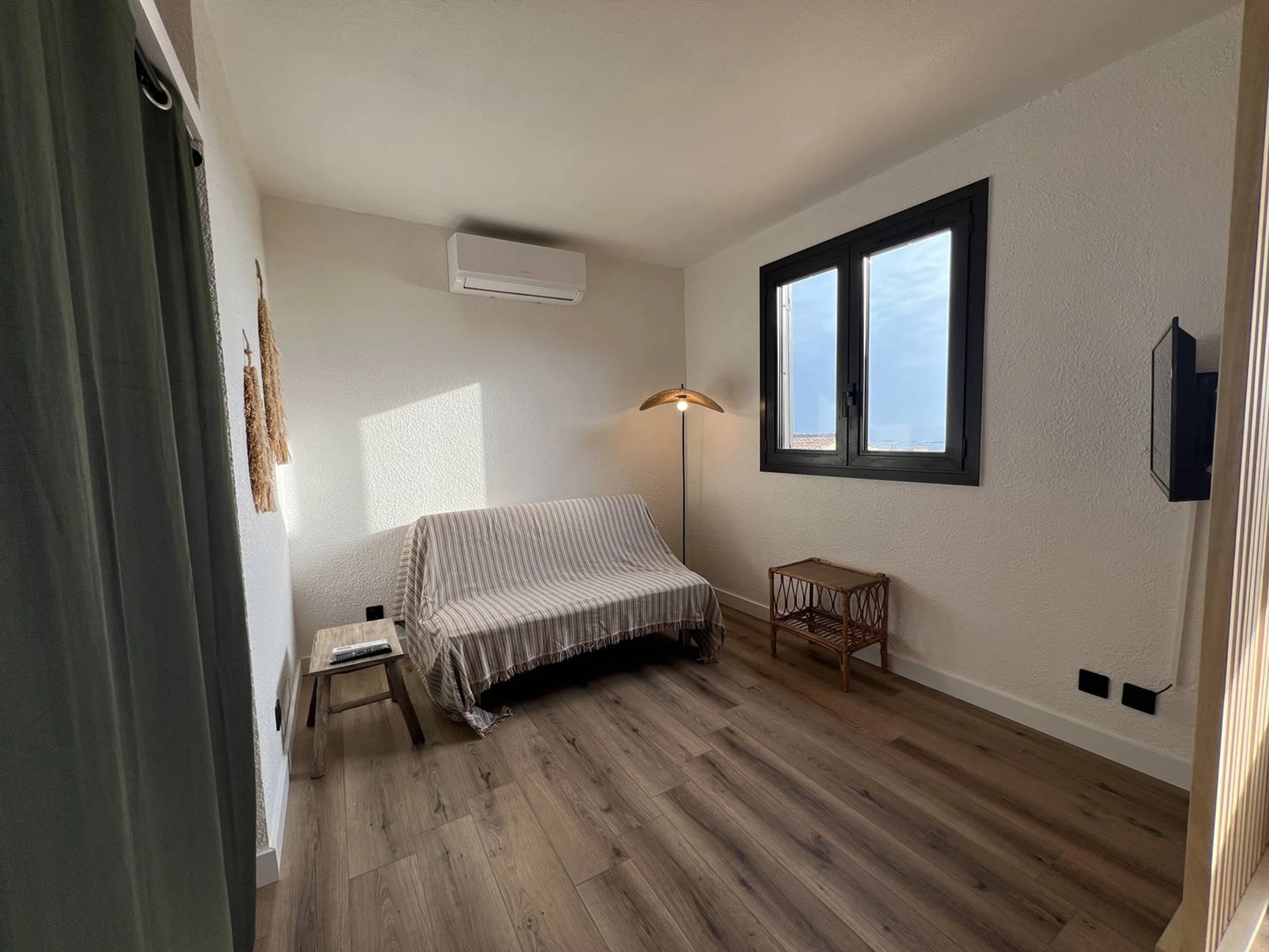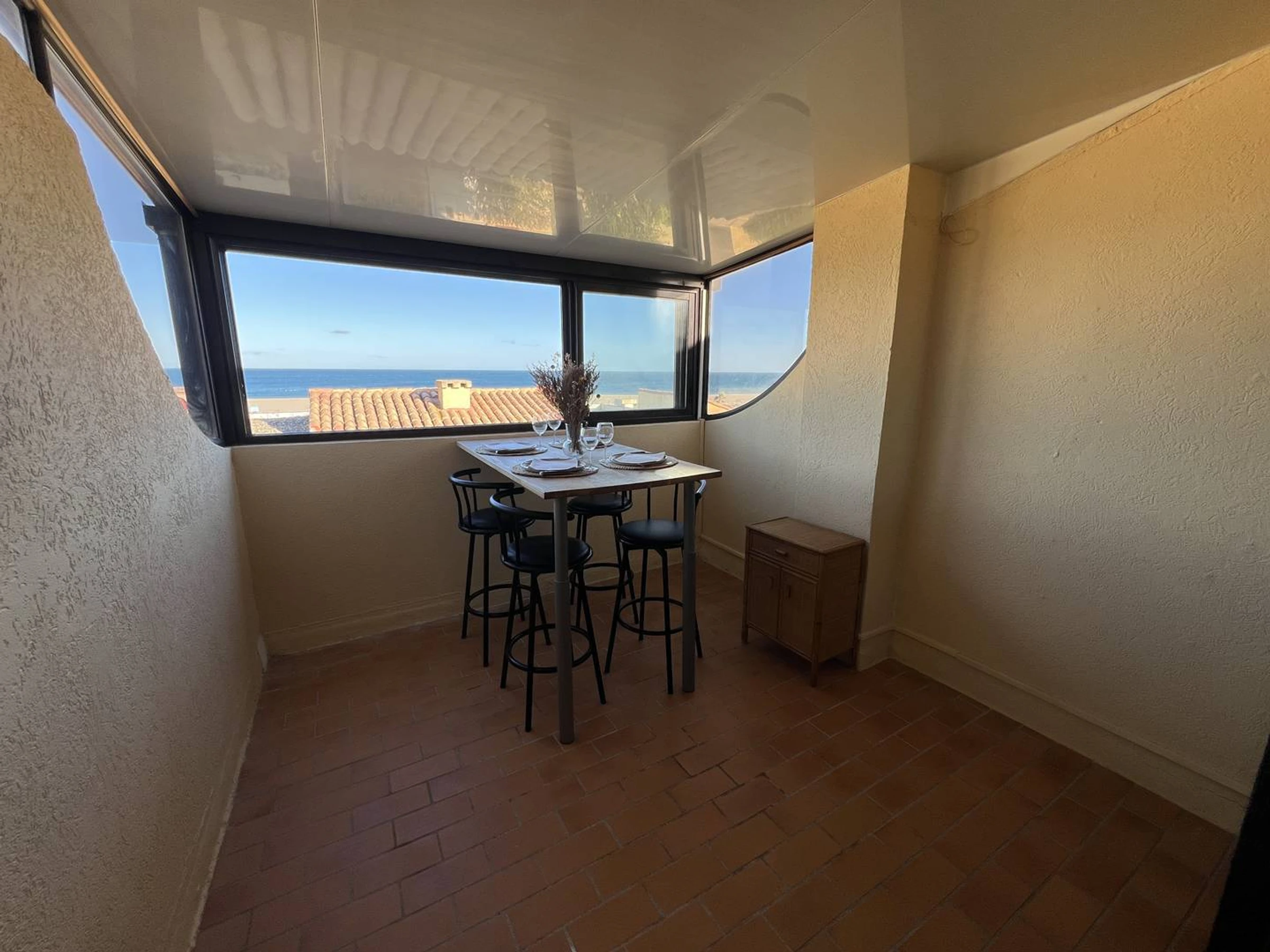 One bedroom, a shower room, a separate toilet, a living room with a kitchenette, and a terrace/loggia with sea views.