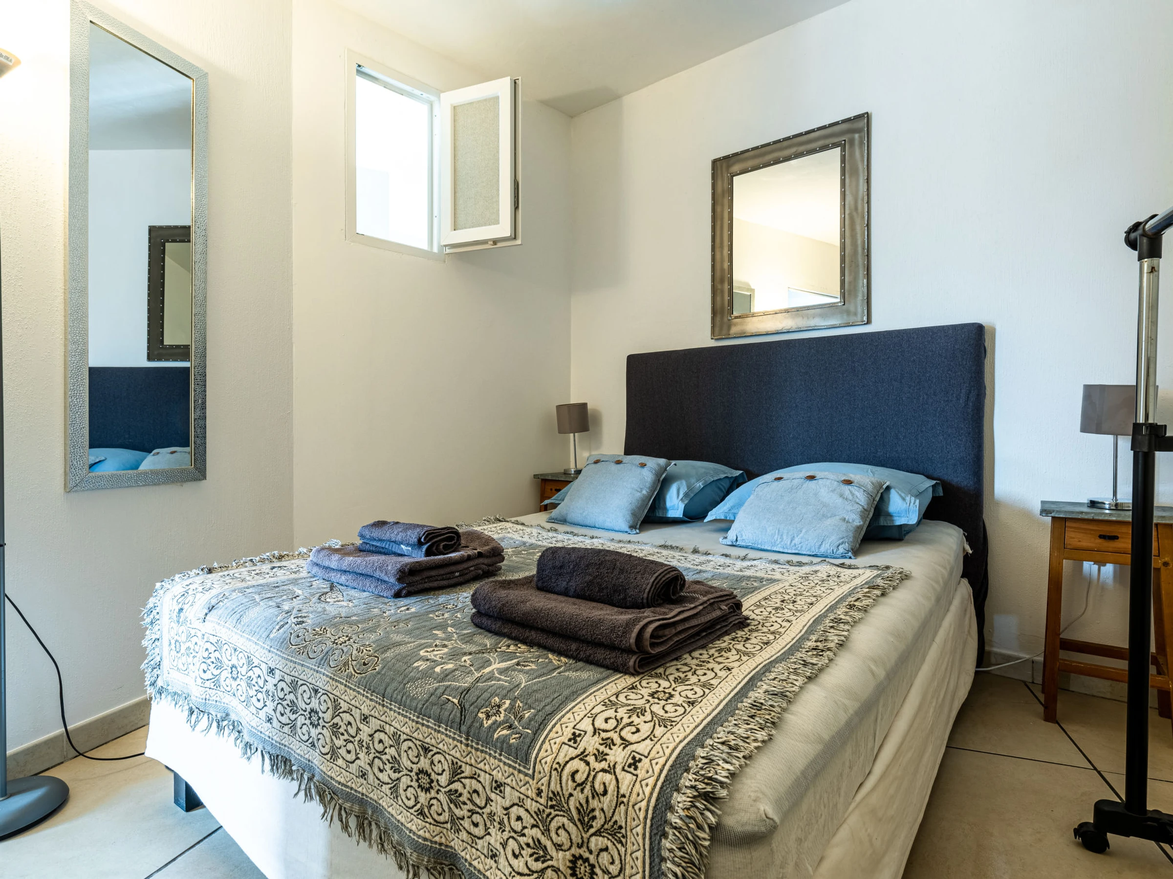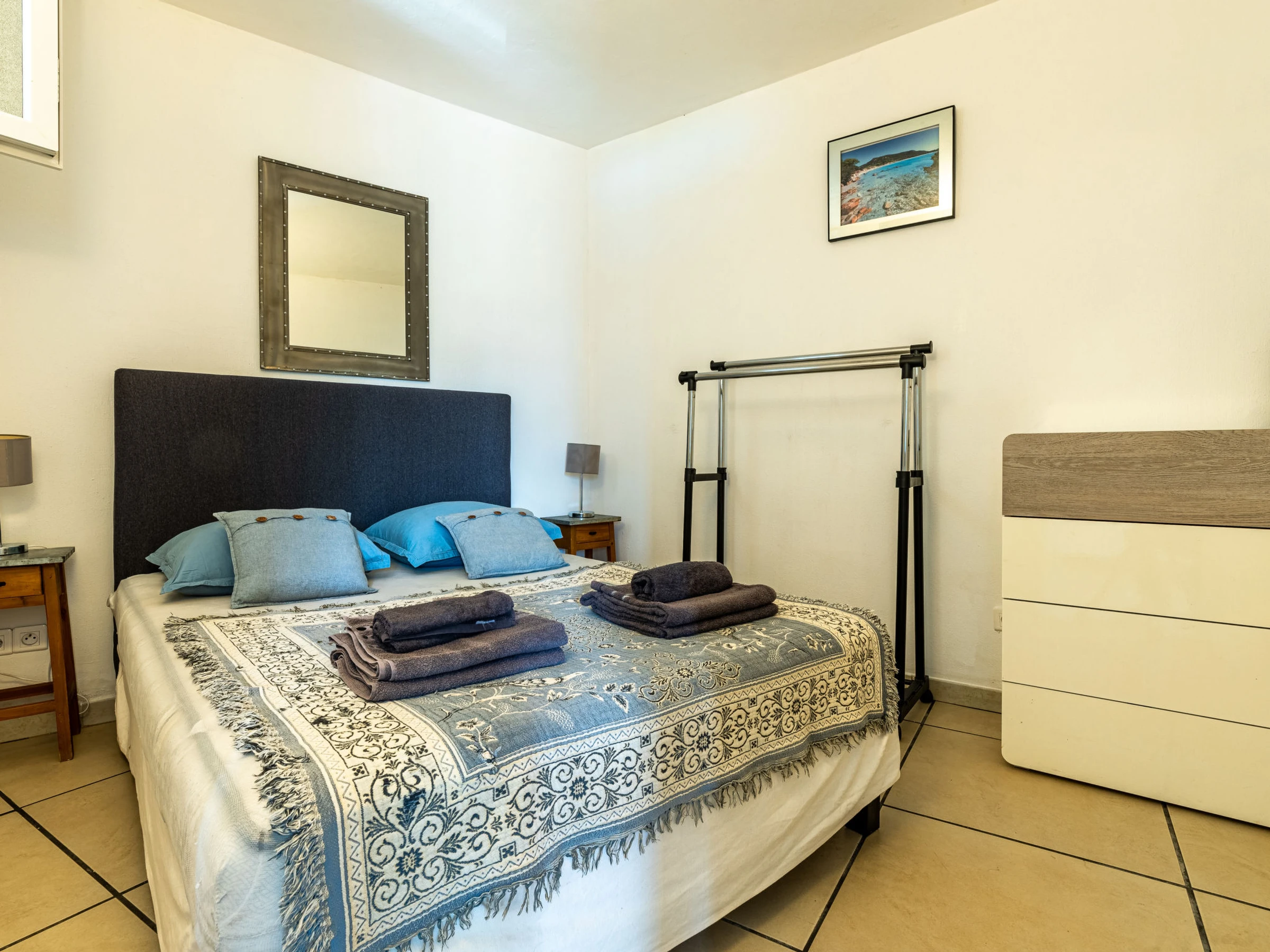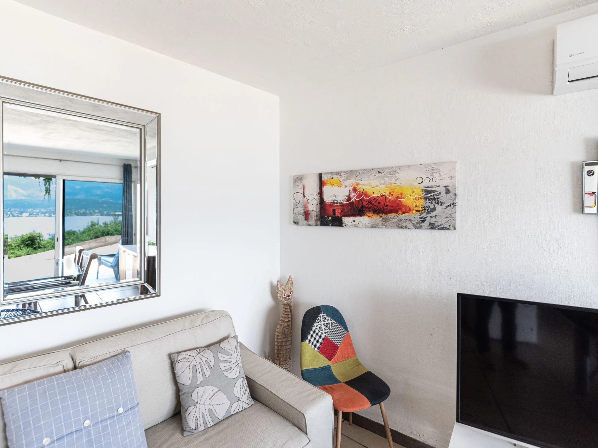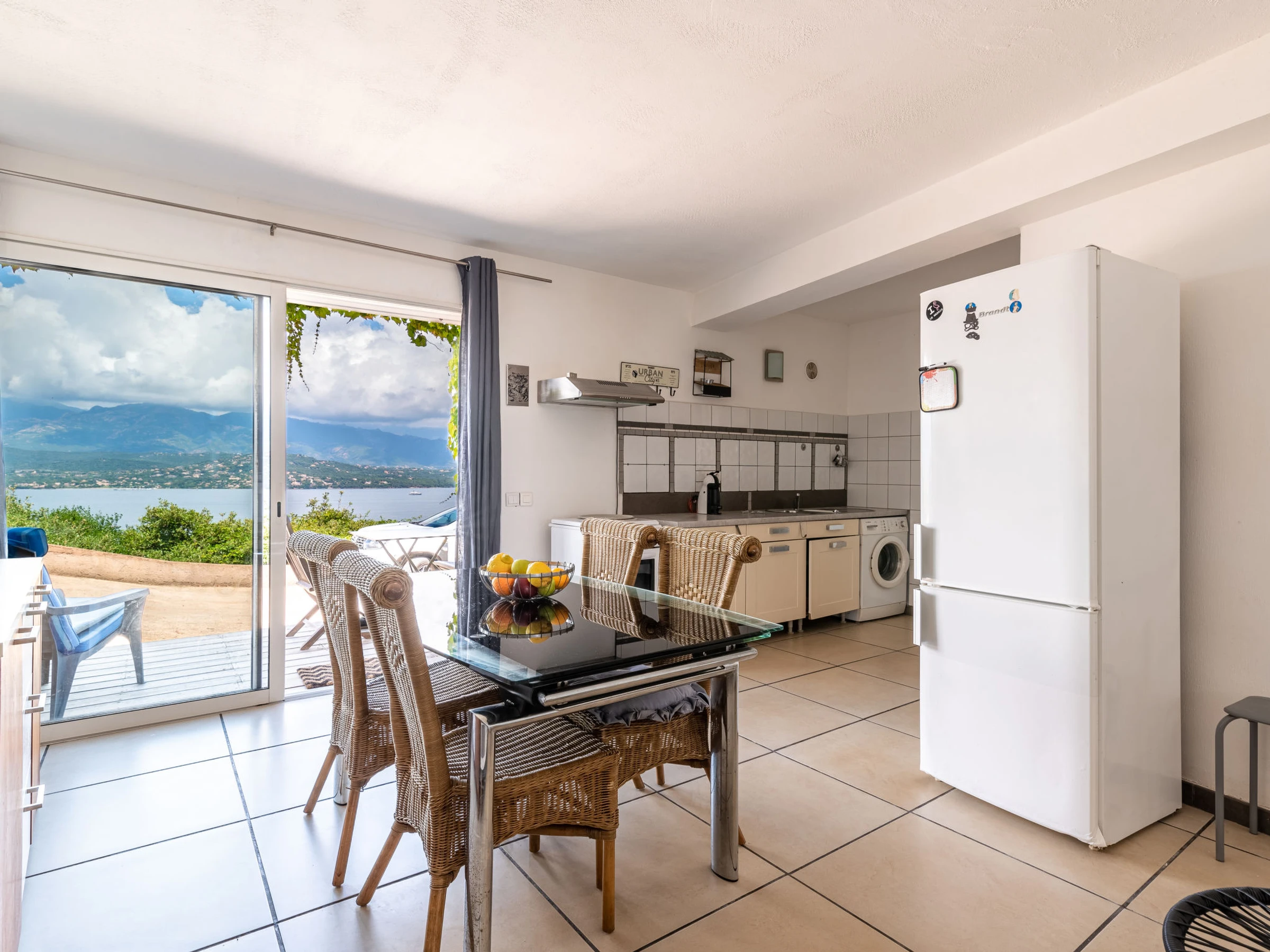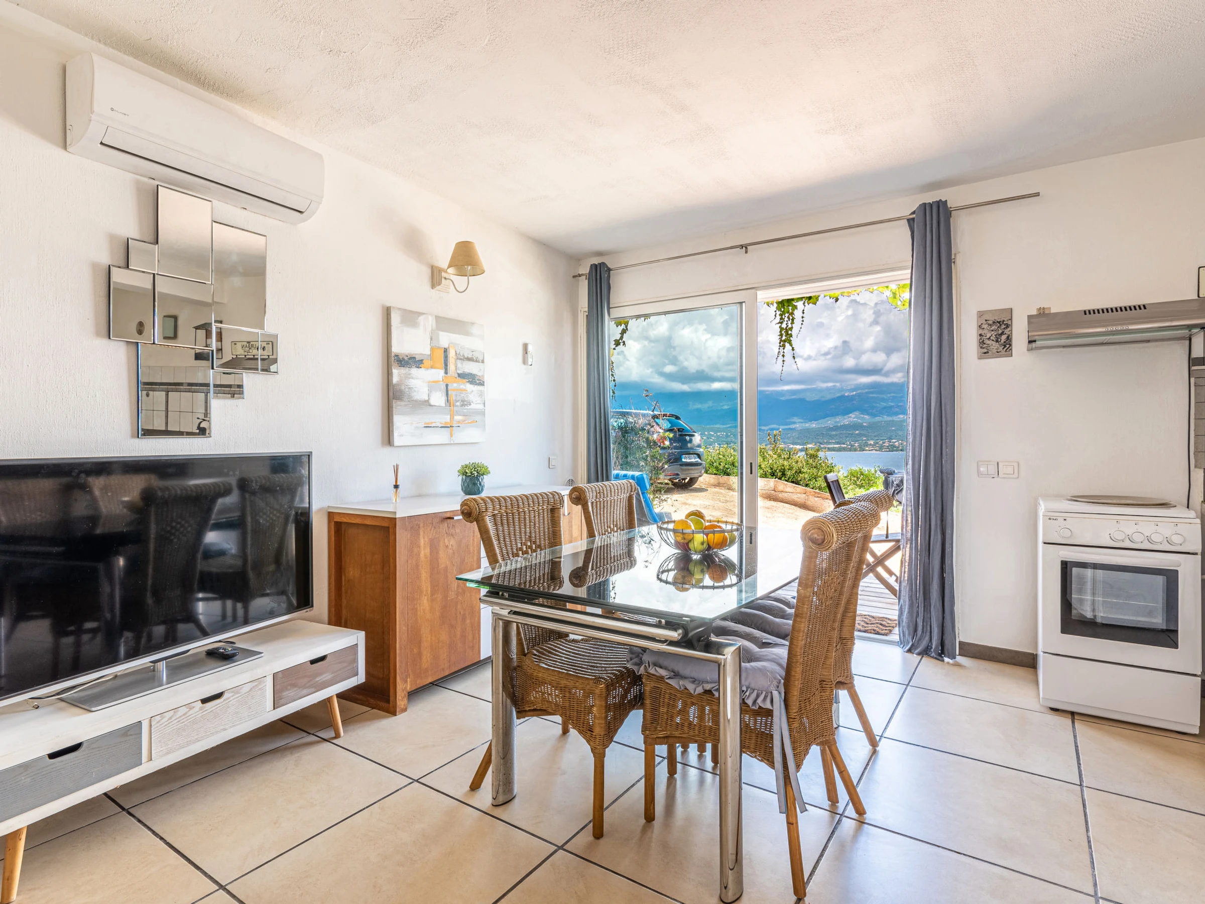 "Casa Laetitia T2", 2-room apartment 45 m2. Spacious: living/sleeping room with 1 double sofabed (140 cm, length 190 cm), dining table and TV (flat screen), air conditioning. Exit to the terrace. 1 room, window onto the living room with 1 french bed (140 cm, length 190 cm). Open kitchen (4 hot plates, toaster, kettle, microwave, electric coffee machine, Capsules for coffee machine (Dolce gusto) extra). Shower/WC. Heating. Terrace. Terrace furniture. Very beautiful view of the sea, the countryside and the bay. Facilities: washing machine. Internet (WiFi). Reserved parking at the house. Please note: non-smokers only. Smoke alarm. Offer by a private individual according to  Art. 155, IV of CGI.