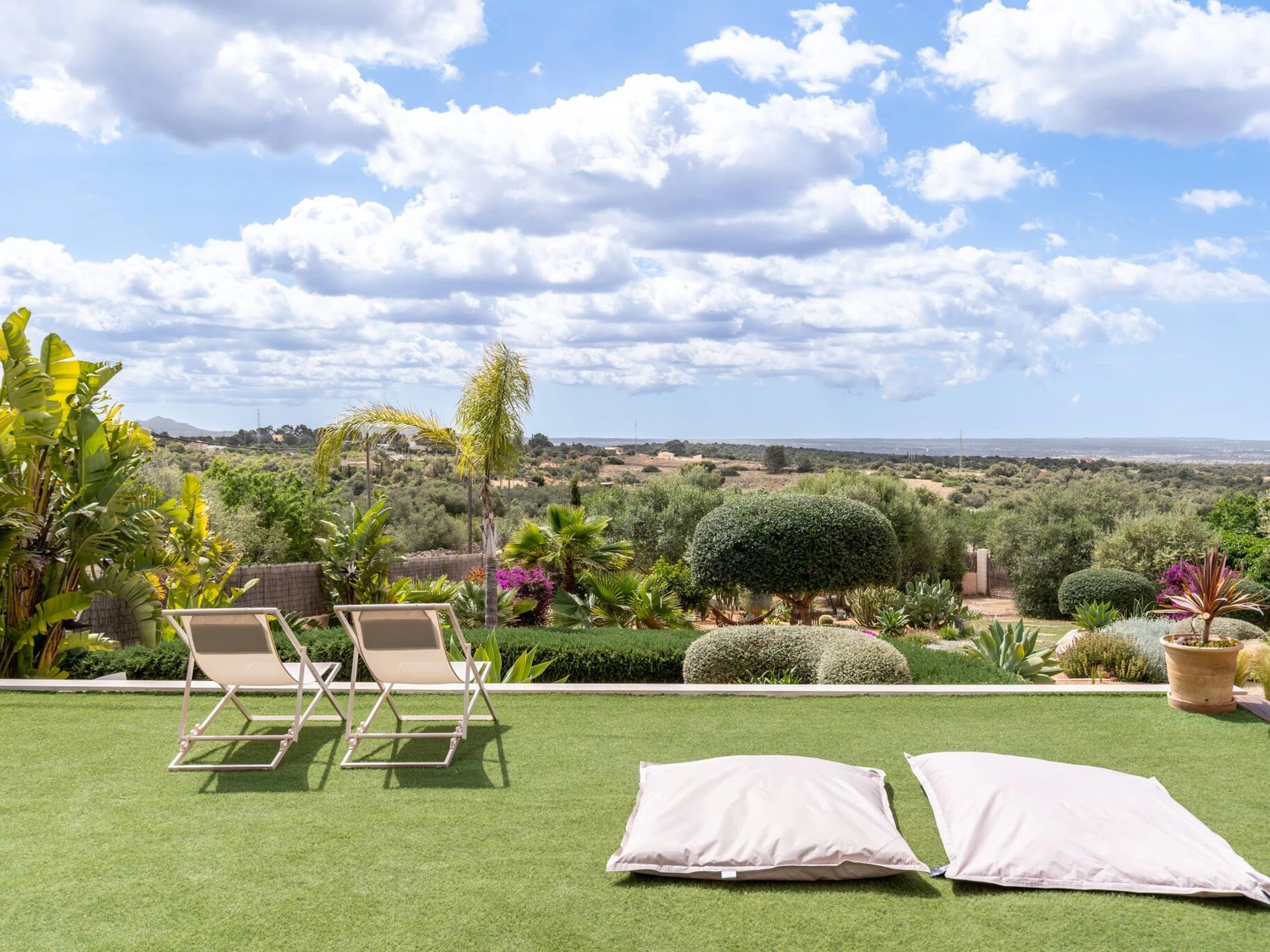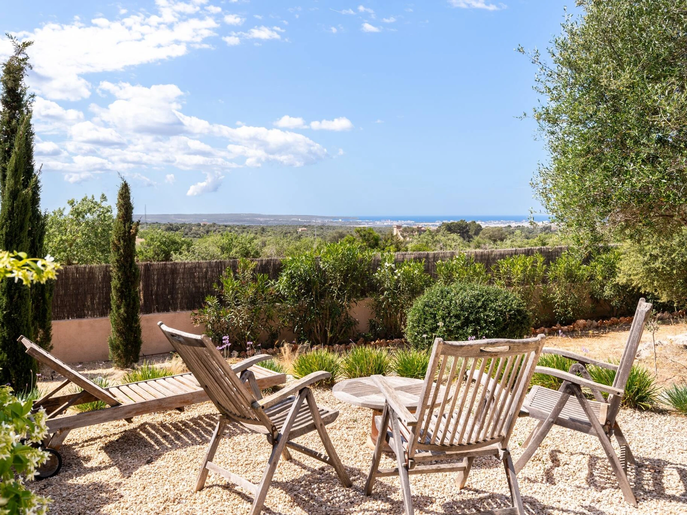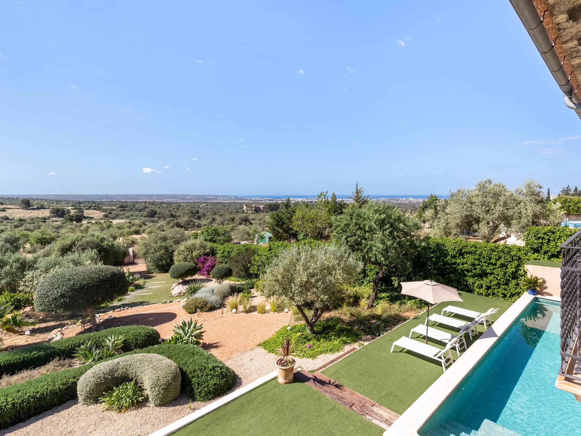 The sizeable, lush Mediterranean garden offers ample space for recreation and relaxation. Marvellous private swimming pool, with superb views of Palma Bay. Gas barbecue and also wood-fired grill, outdoor dining area. The terrace zone additionally features sunbeds and loungers.