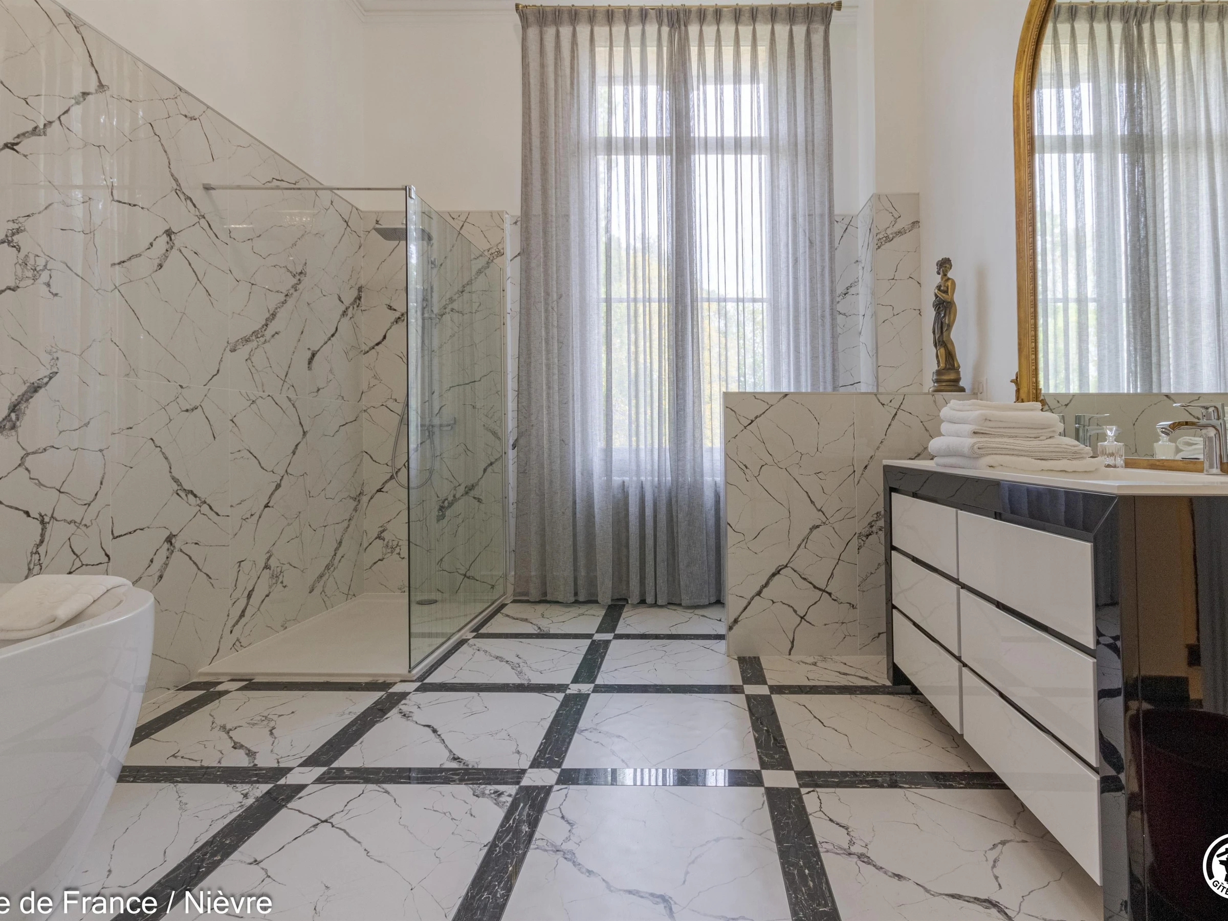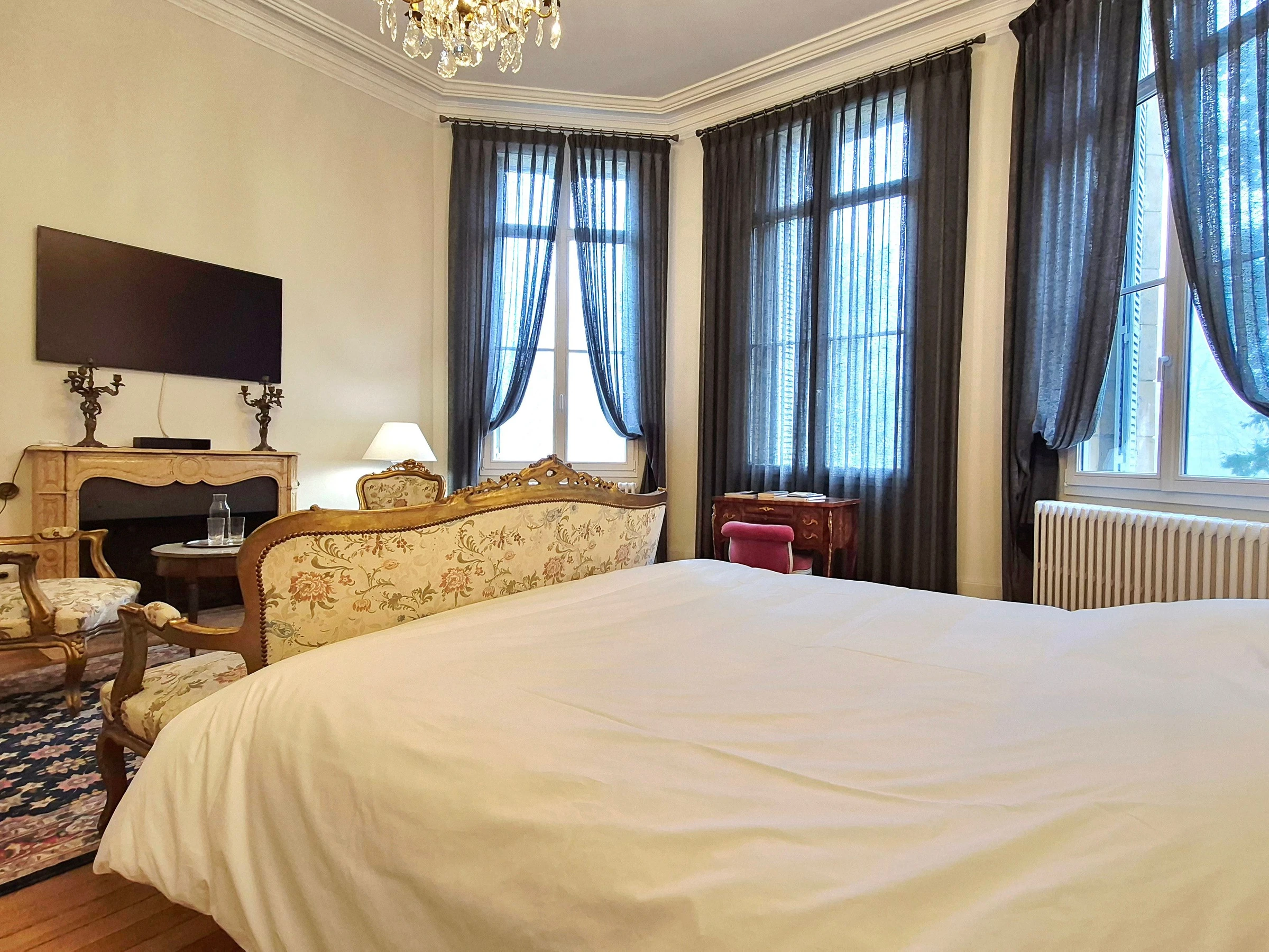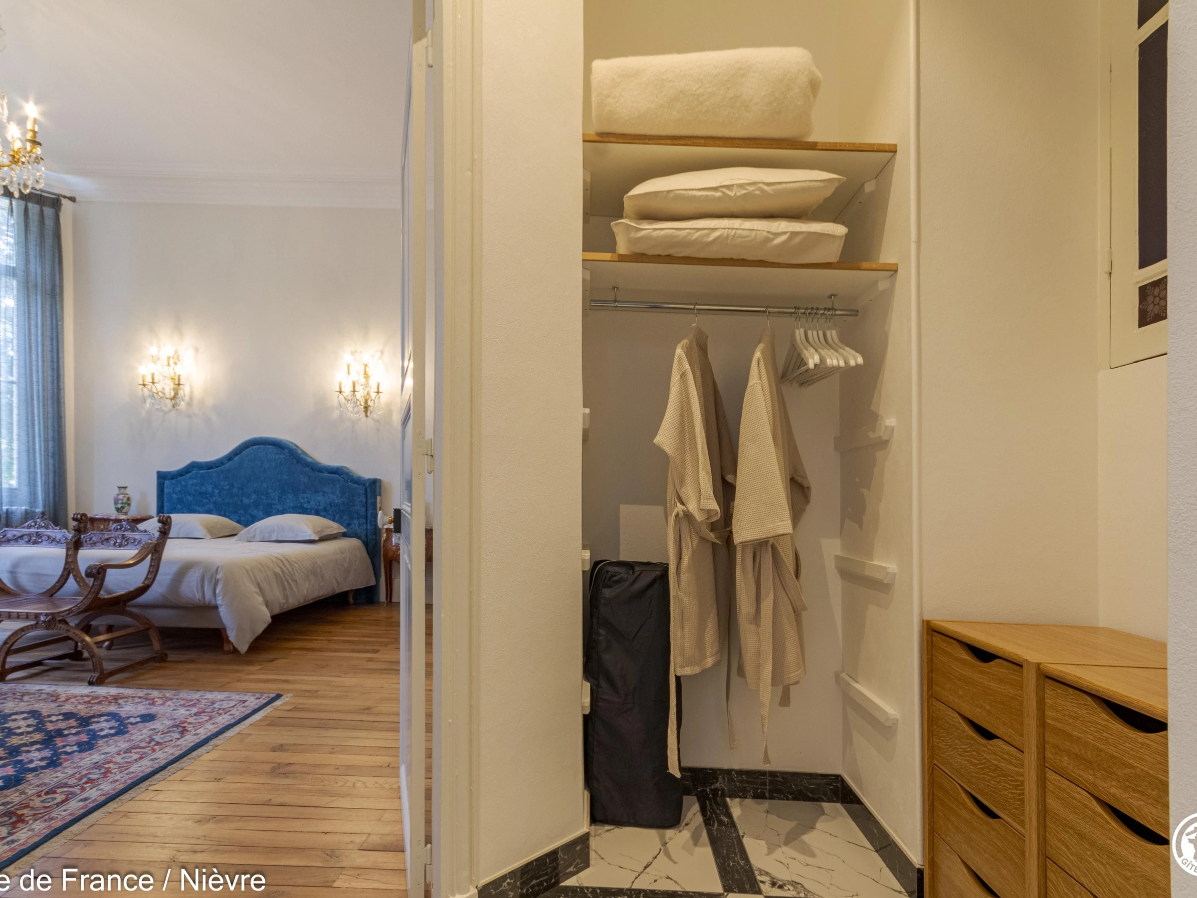 During your stay at the château, you can enjoy the proximity of the Sancerre and Pouilly vineyards, where you can taste exquisite wines and discover the charm of this renowned wine region. The Rotonde room, a haven of peace in 50 m², is located on the first floor of the Château des Métairies and offers breathtaking views of the large wooded park surrounded by historic walls. This room is decorated with antique furniture and offers modern comforts with its king-size bed (180 x 200 cm), dressing room, large-screen television, minibar, and complimentary tea and coffee making facilities. Its large private bathroom with park views is equipped with a bathtub, walk-in showers, towel warmer, double sinks, and separate WC.