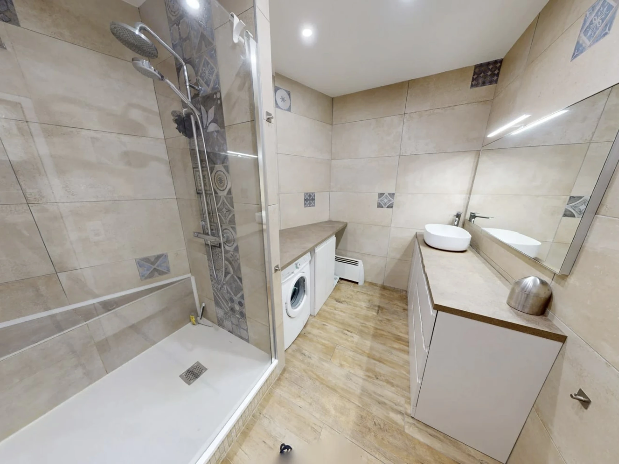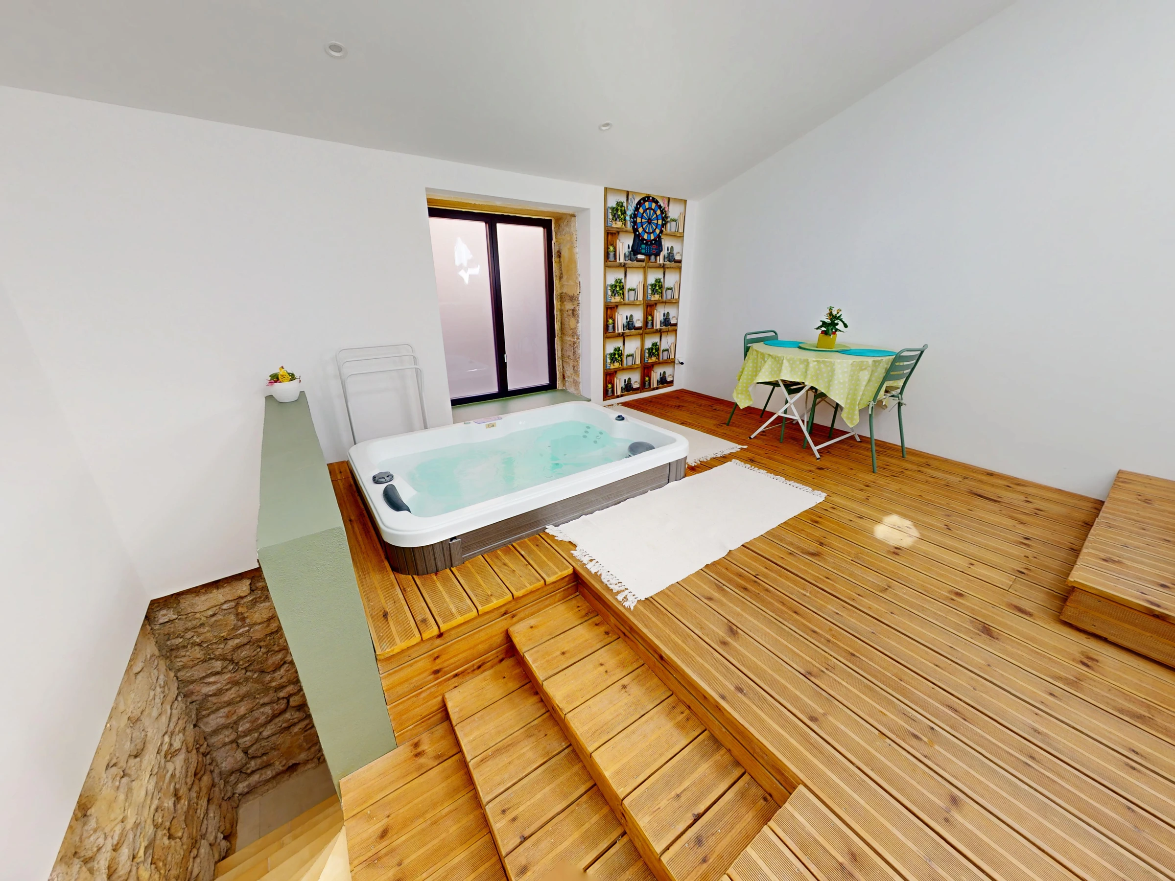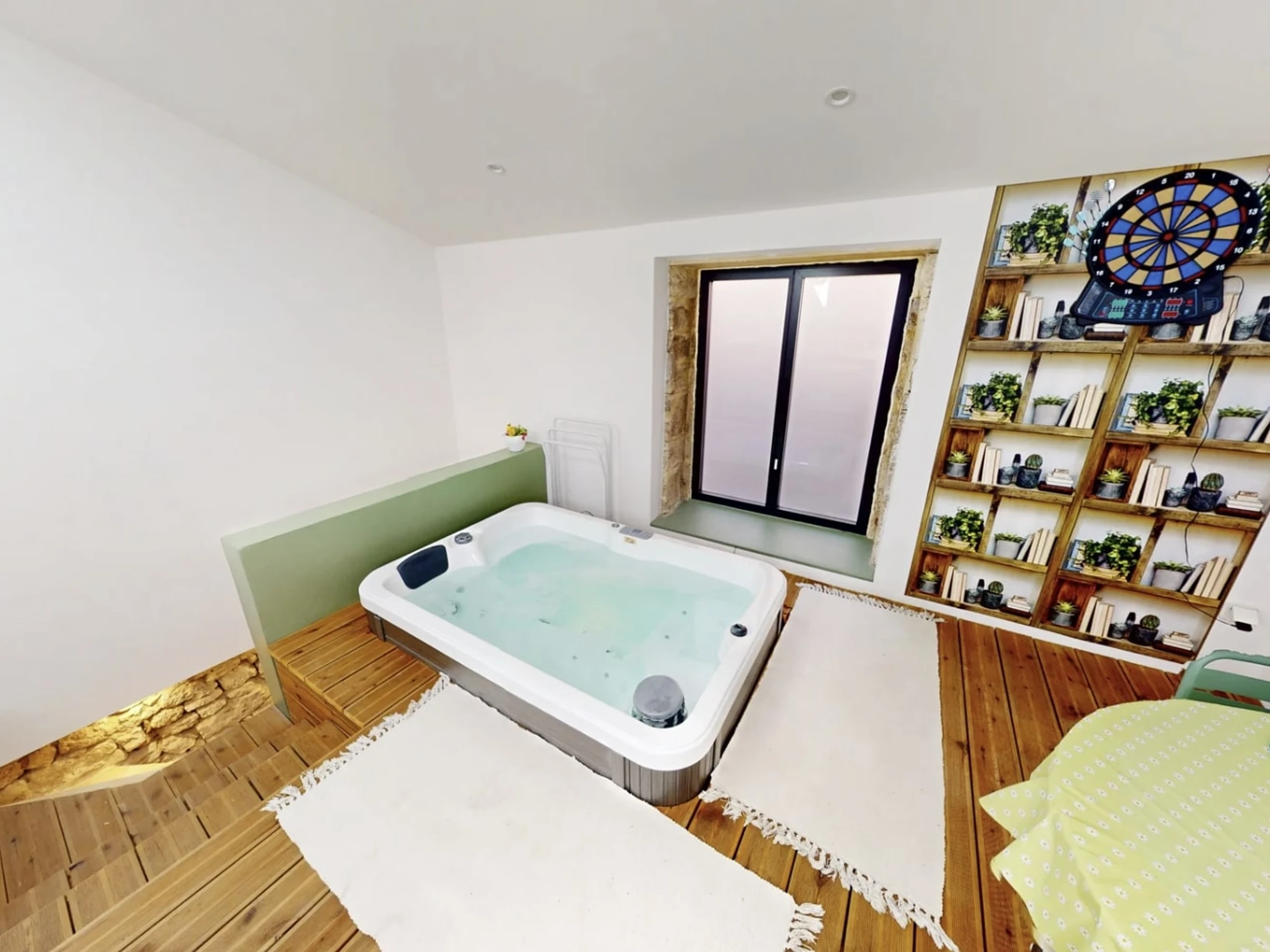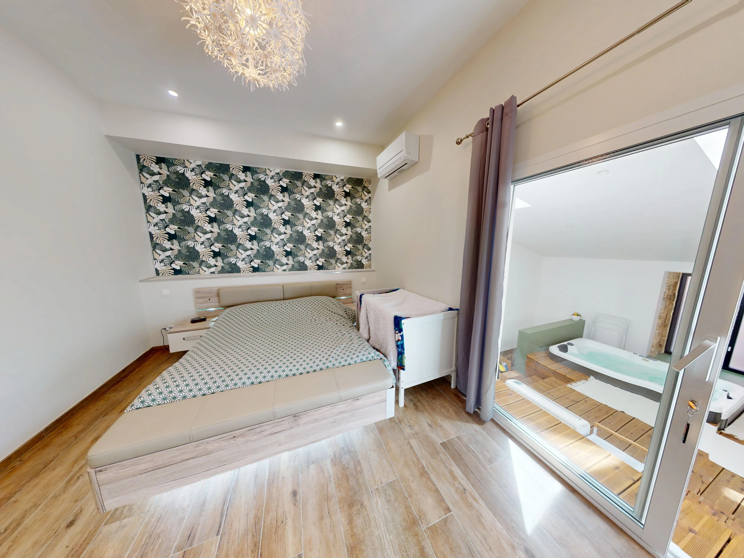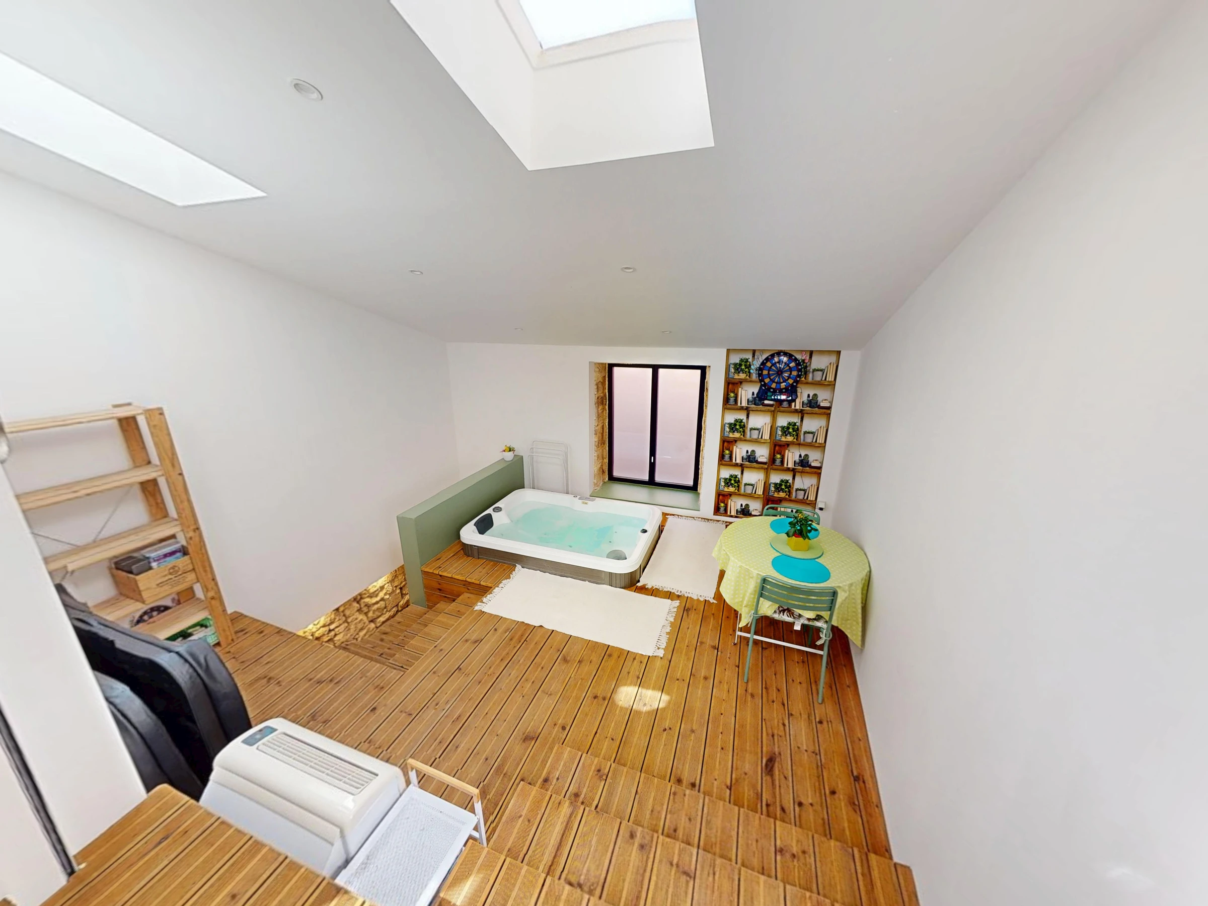 Upstairs, you'll find a second living room with a sofa and television, perfect for relaxing in the evening. A 10 m² hallway with storage separates the rooms. The 16 m² master bedroom features a 160 cm x 200 cm double bed, which is air-conditioned. A second bathroom with a shower, sink, and washing machine is also available, as well as a separate toilet. The centerpiece of this floor and the house is the 15 m² spa area with its wooden floor and jacuzzi, perfect for moments of pure relaxation.