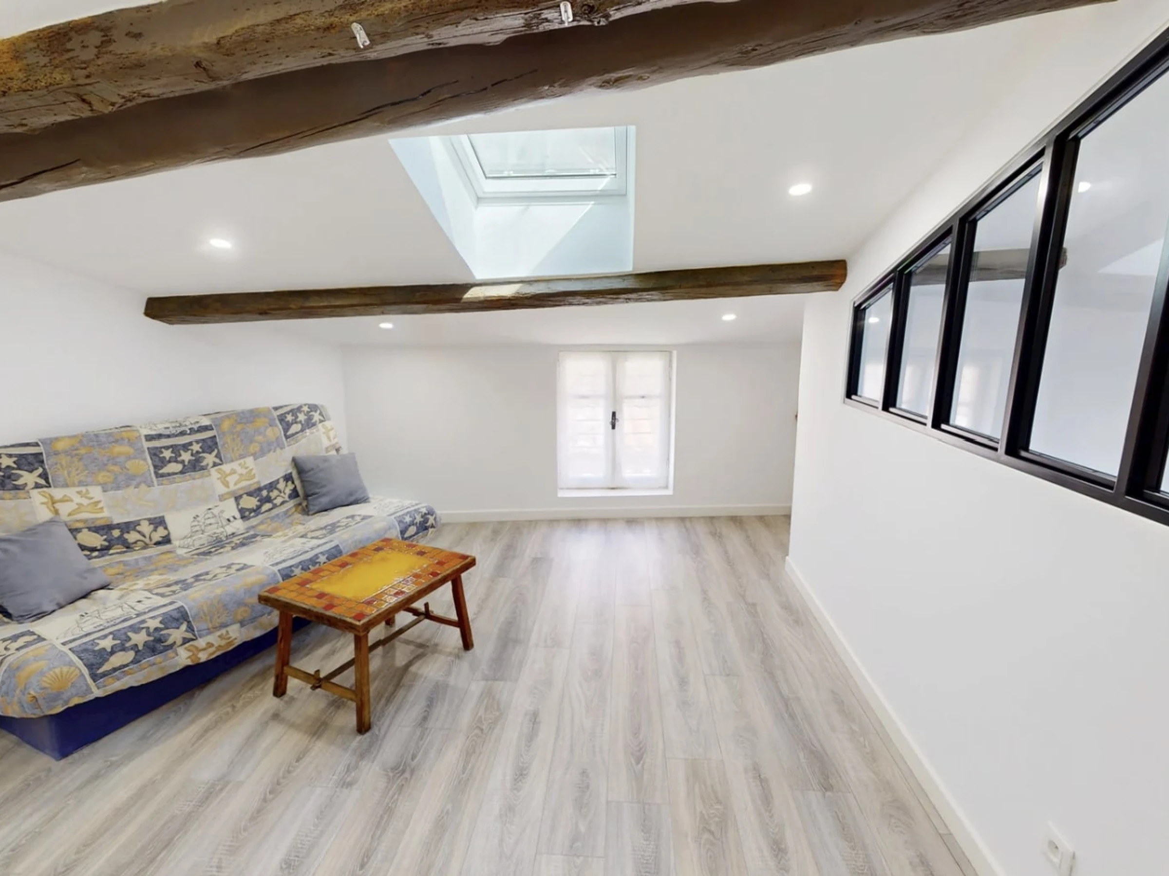 The top floor houses a 10 m² living room, bright thanks to its skylights, furnished with a 140 x 200 cm sofa bed. The bathroom is equipped with a bathtub, double sinks, and a heated towel rail. Finally, there's a 16.5 m² air-conditioned bedroom with two 90 x 200 cm single beds.