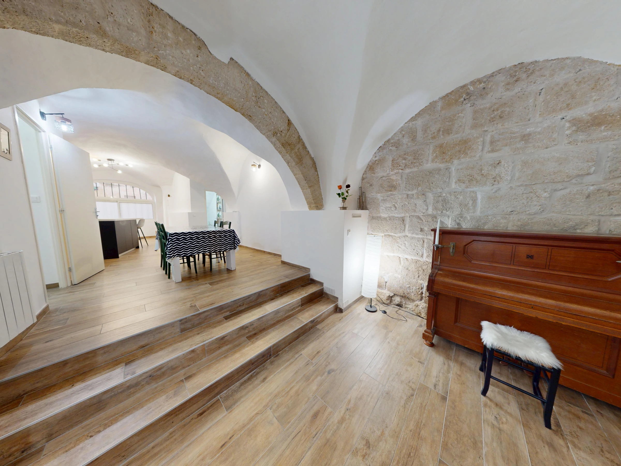 On the ground floor, you enter a large, approximately 10 m² hall, a welcoming space with vaulted ceilings and exposed stone. The bright, 25 m² kitchen is equipped with an oven, a fridge-freezer, a Tassimo coffee machine, a central island with bar stools, and a large dining table and chairs. Adjacent to this, the 15 m² living room offers a relaxation area with a 160 x 200 cm sofa bed, storage space, and a piano. A bathroom with a shower and sink, as well as a separate toilet, complete this level.