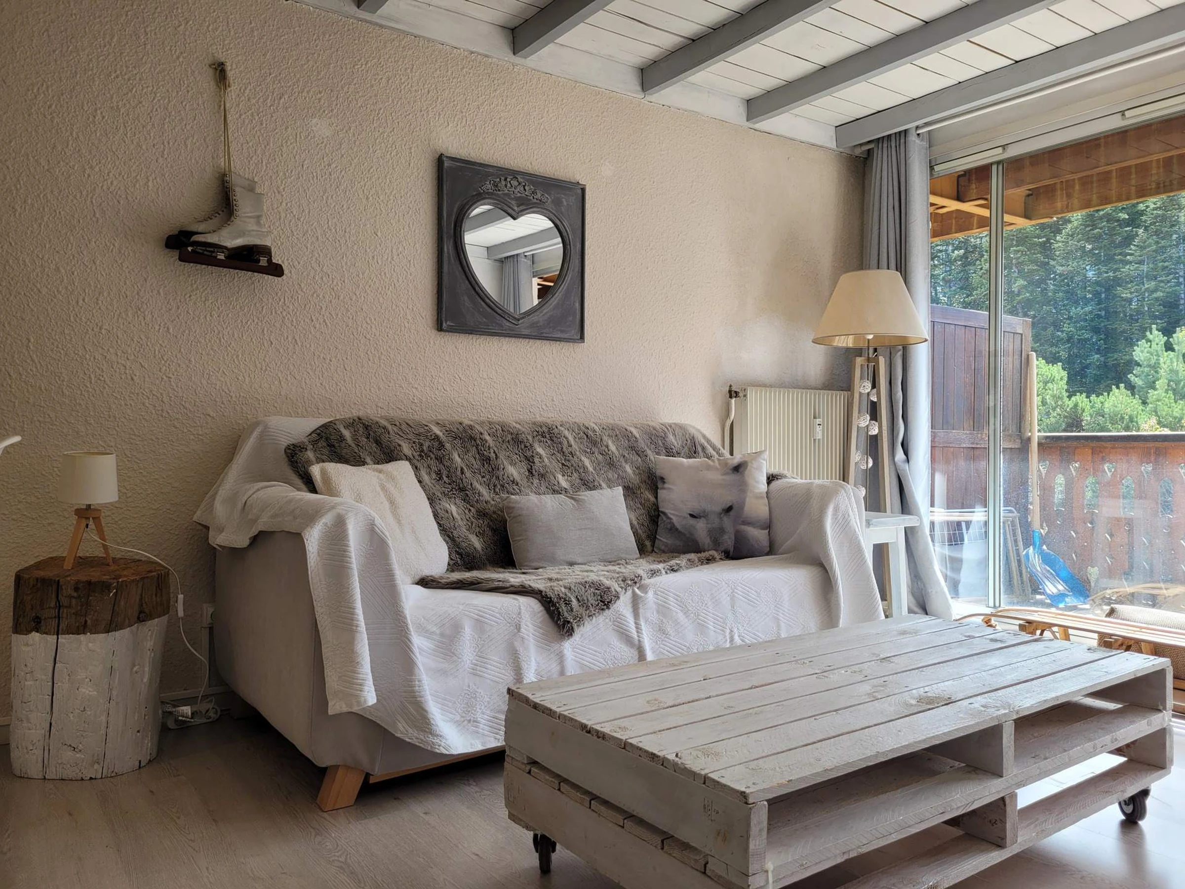 * Living room : double sofa bed, [hidden] set, balcony access, spacious
