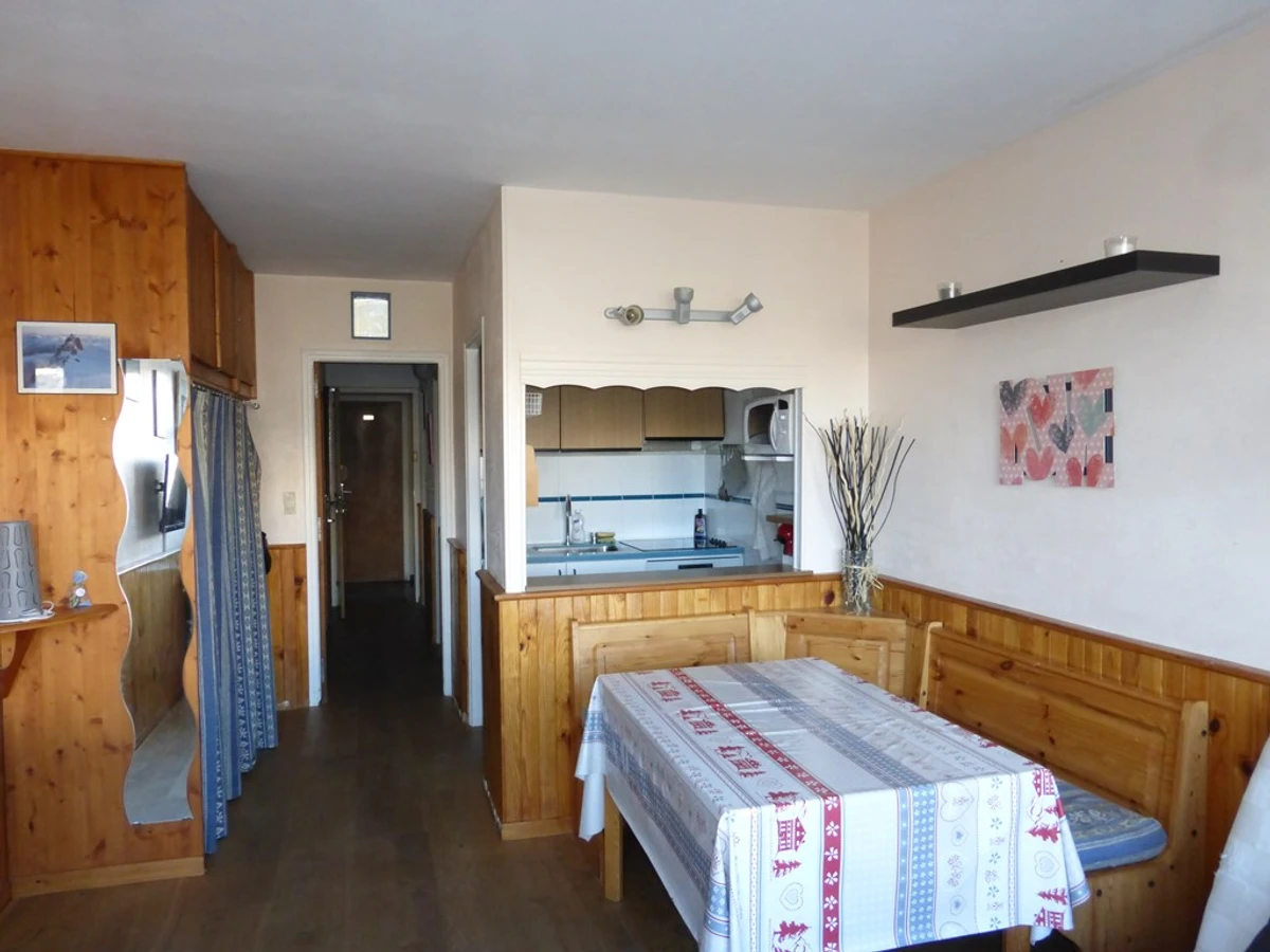 Pra Loup 1600 resort, studio apartment in the LA SAPINIERE condominium, located on the 1st floor with elevator, 32 m², northwest facing, comprising: entrance alcove with two single beds (bunk beds), living room with a double sofa bed, kitchenette, bathroom, separate WC, no balcony.
