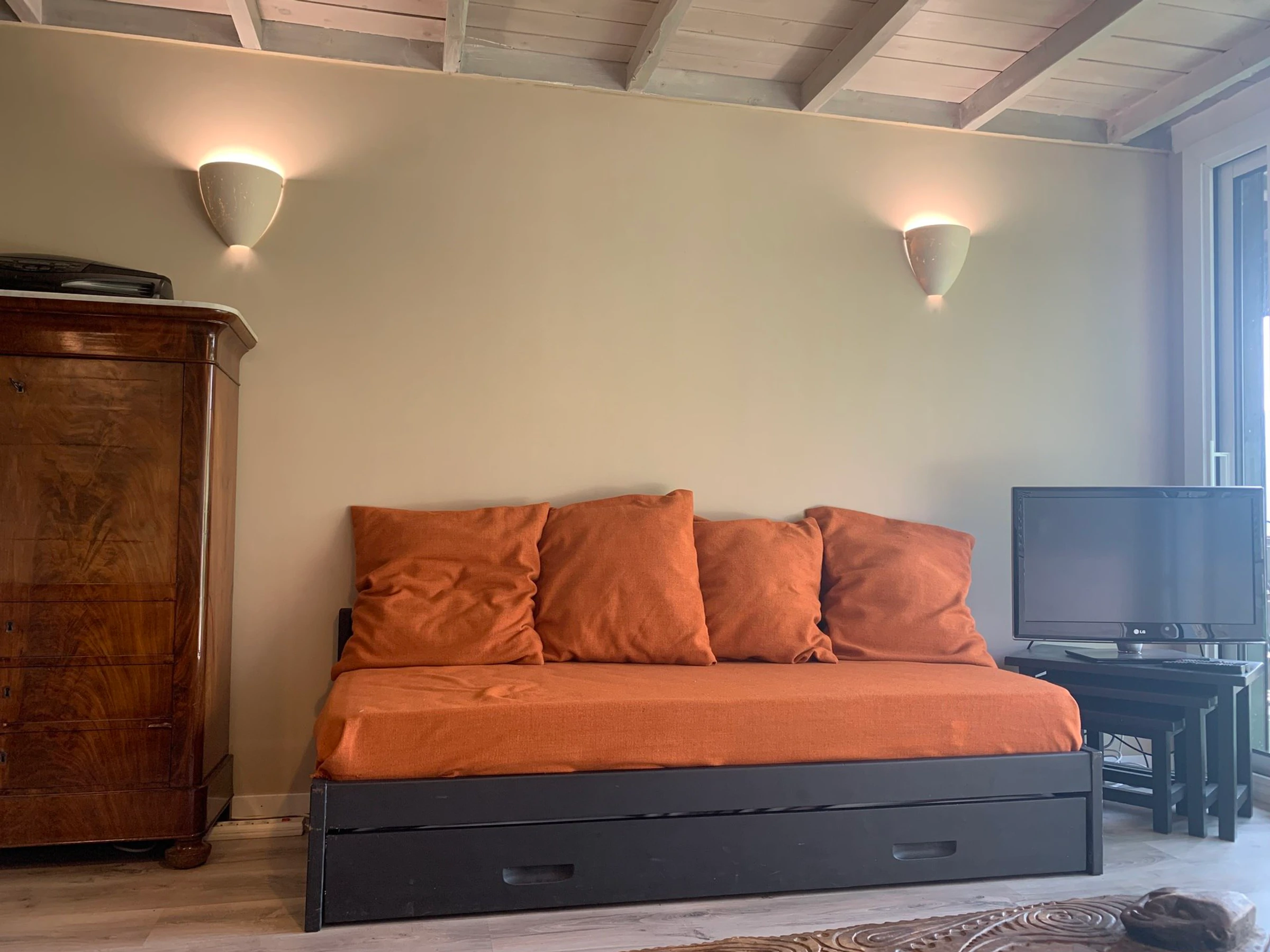 * Living room: 2 single beds, 1 pull-out bed, TV set, cupboard, balcony access, bright, spacious;