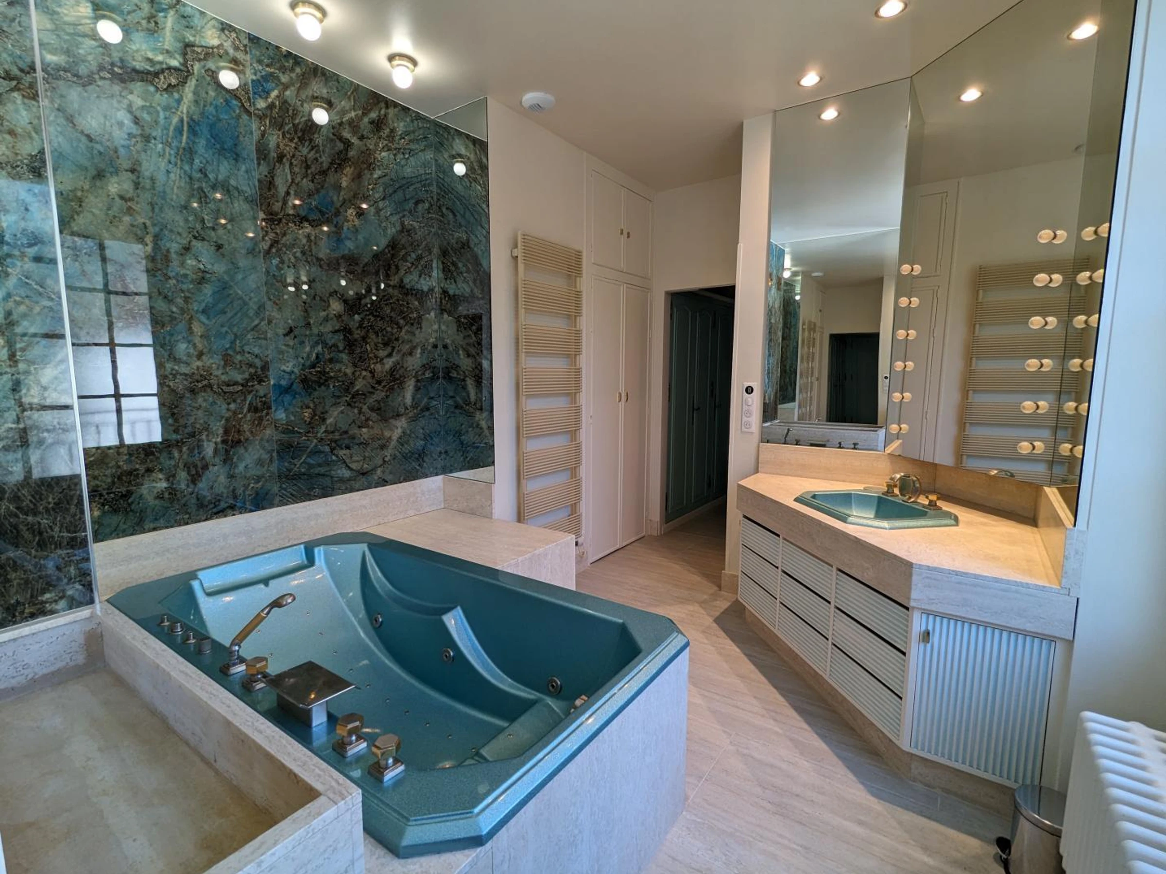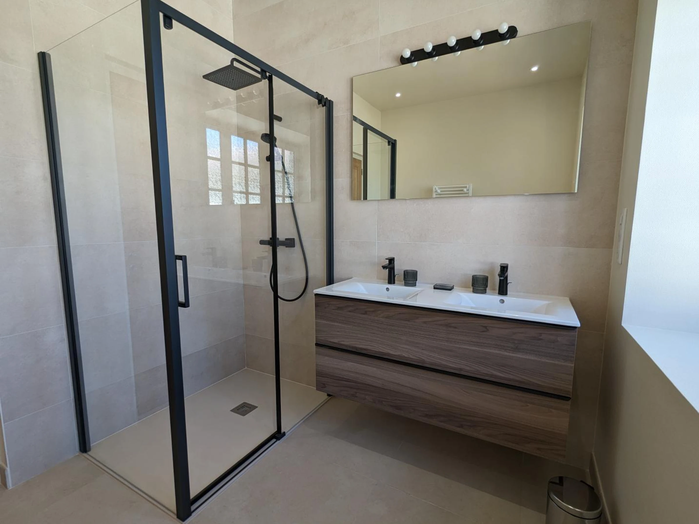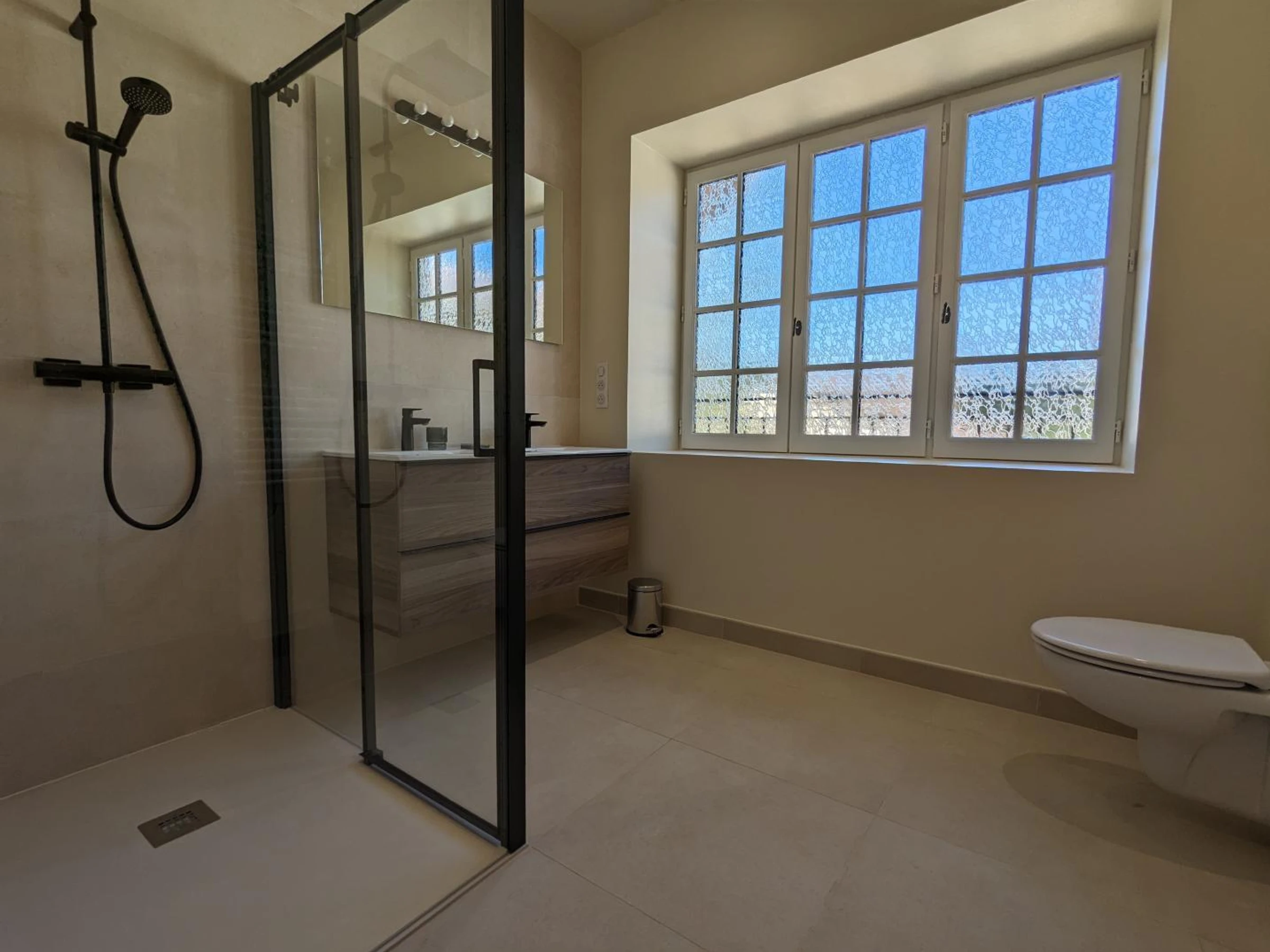 Upstairs: 2 bedrooms with 160x200 cm beds (or 2 80x200 cm beds), 1 suite with 2 90x210 cm beds and 1 180x200 cm bed (or 2 90x200 cm beds), a bathroom with a whirlpool bath, WC, a shower room with WC, 1 bedroom with 160x200 cm bed (or 2 80x200 cm beds) private shower room and WC. Fiber optic Wi-Fi. Baby equipment available upon request: crib, bathtub and high chair.