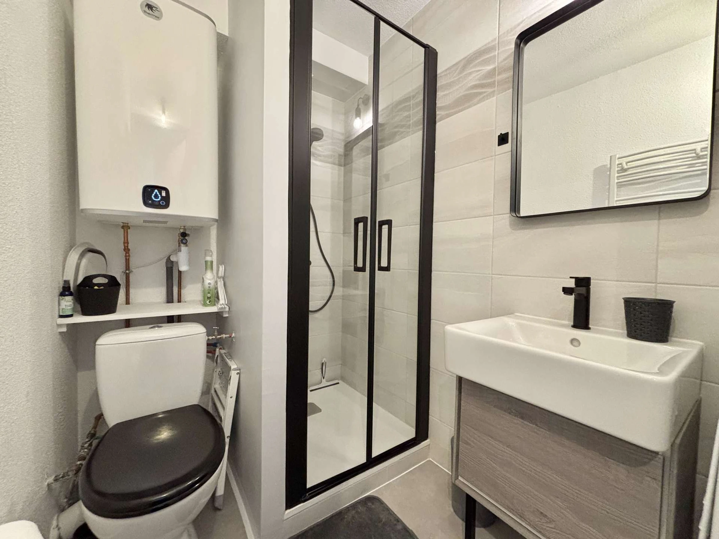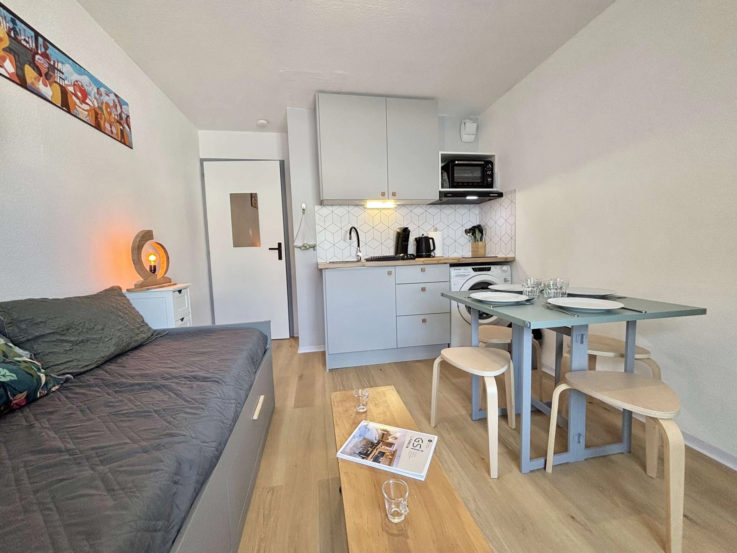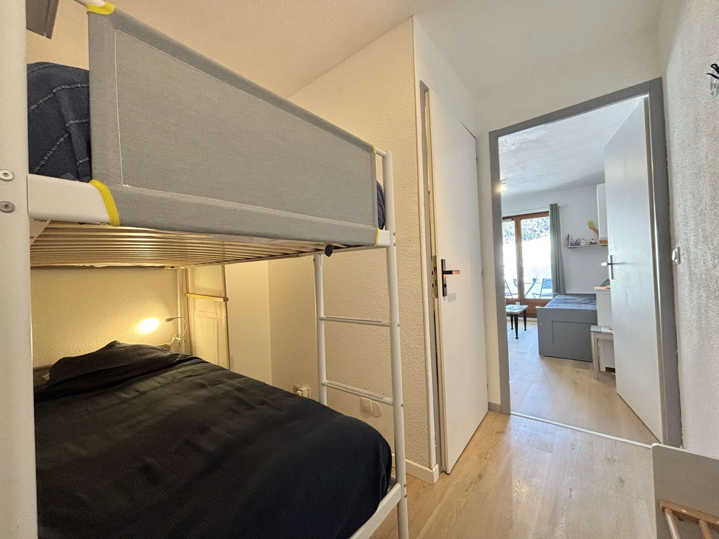 This holiday apartment, located on the ground floor of the residence, comprises an alcove with two single bunk beds (NB: the top bunk is not suitable for children under 6 years old), a living room/lounge with a 160 cm sofa bed, a fully equipped kitchen, and a bathroom with shower and toilet.