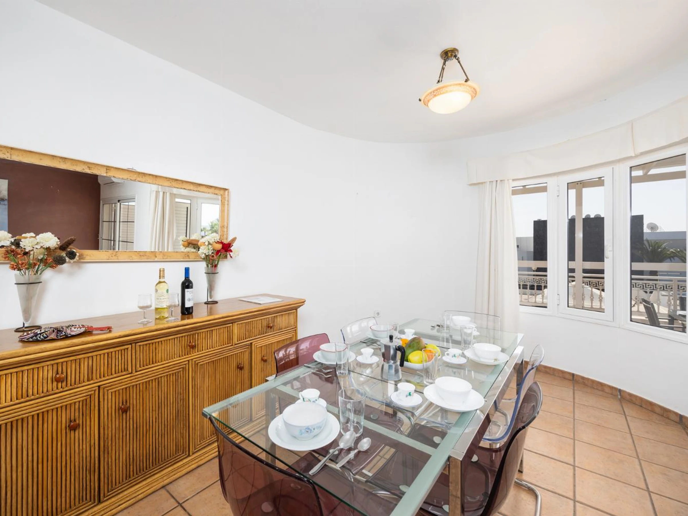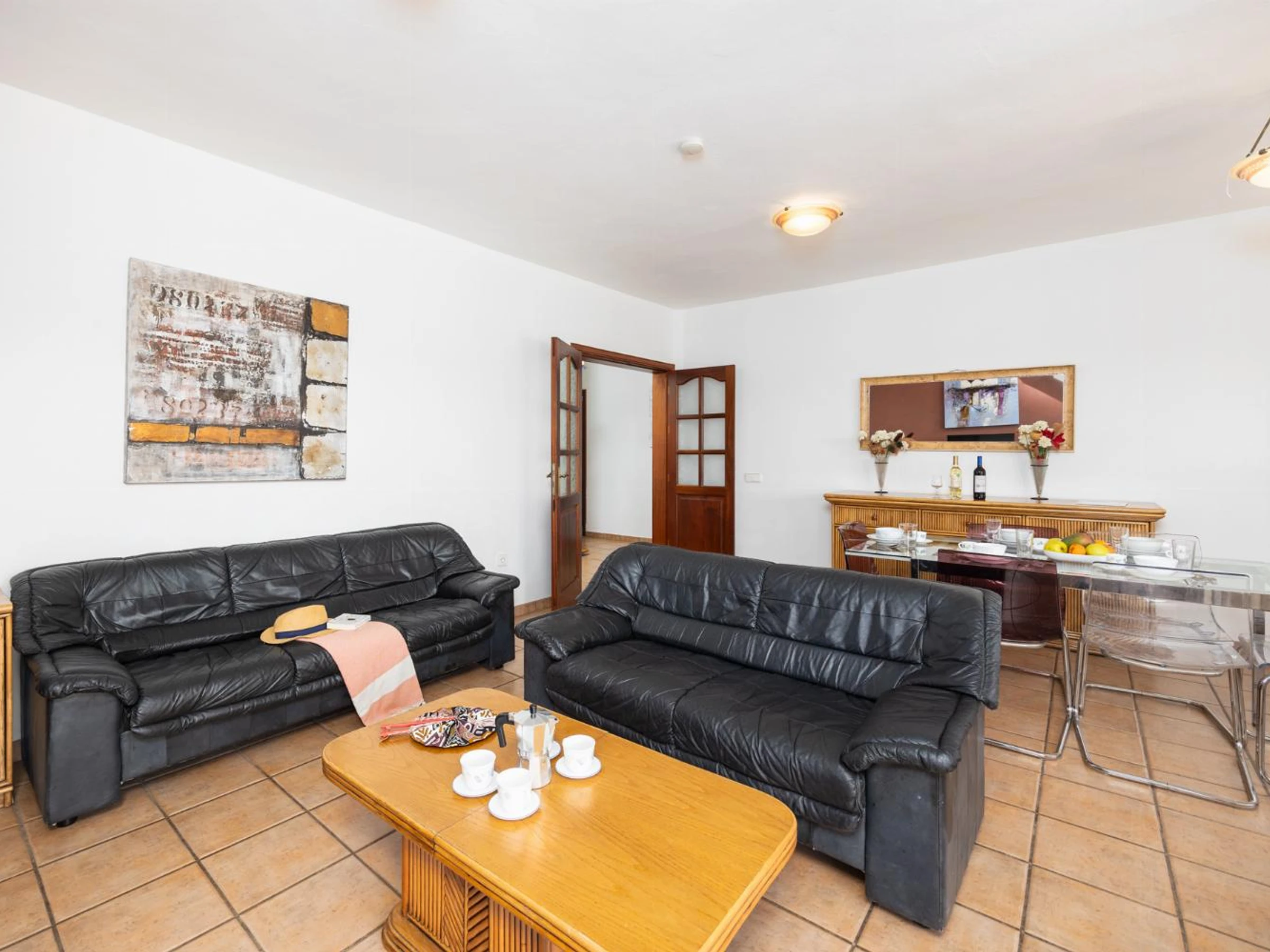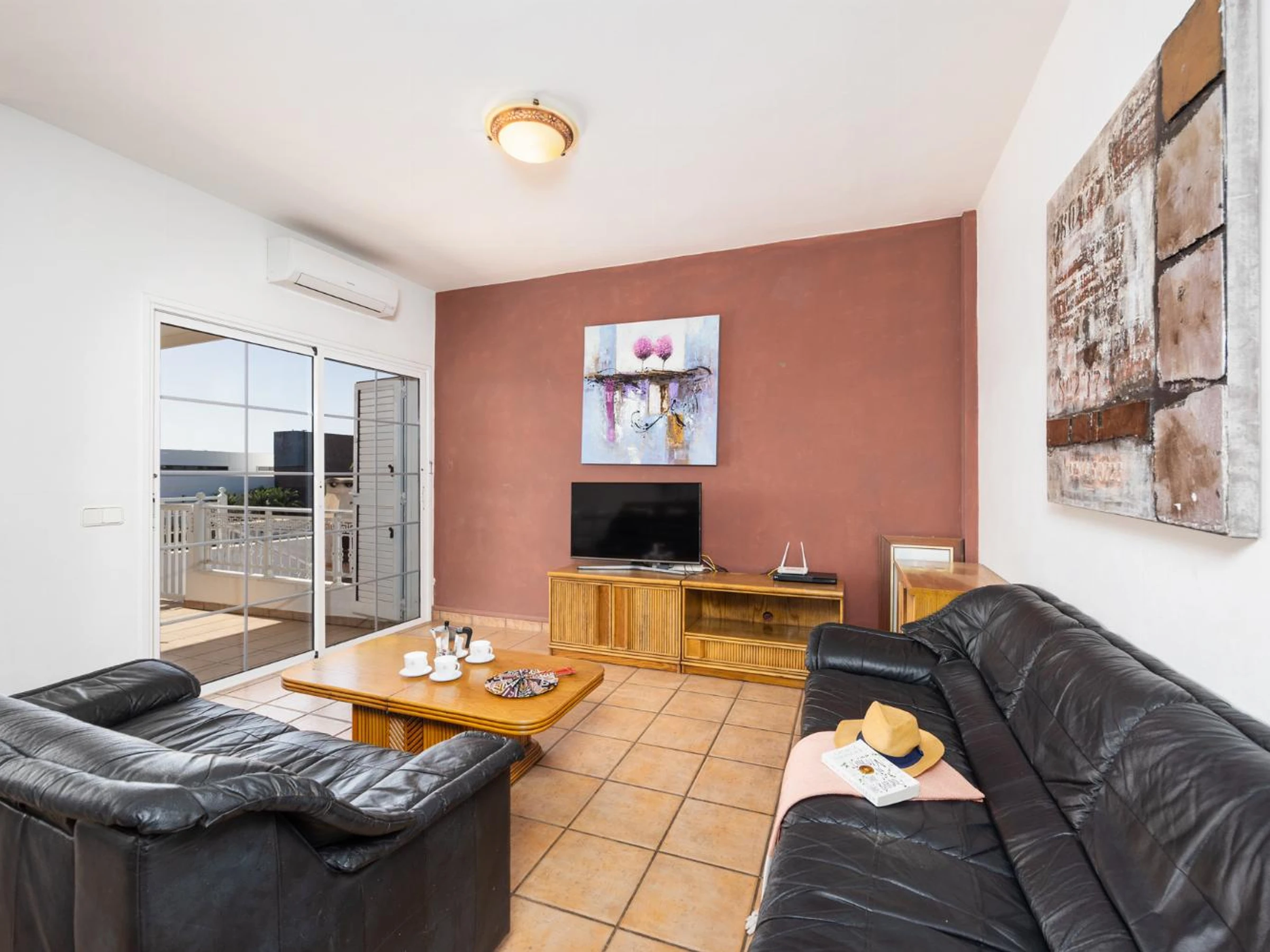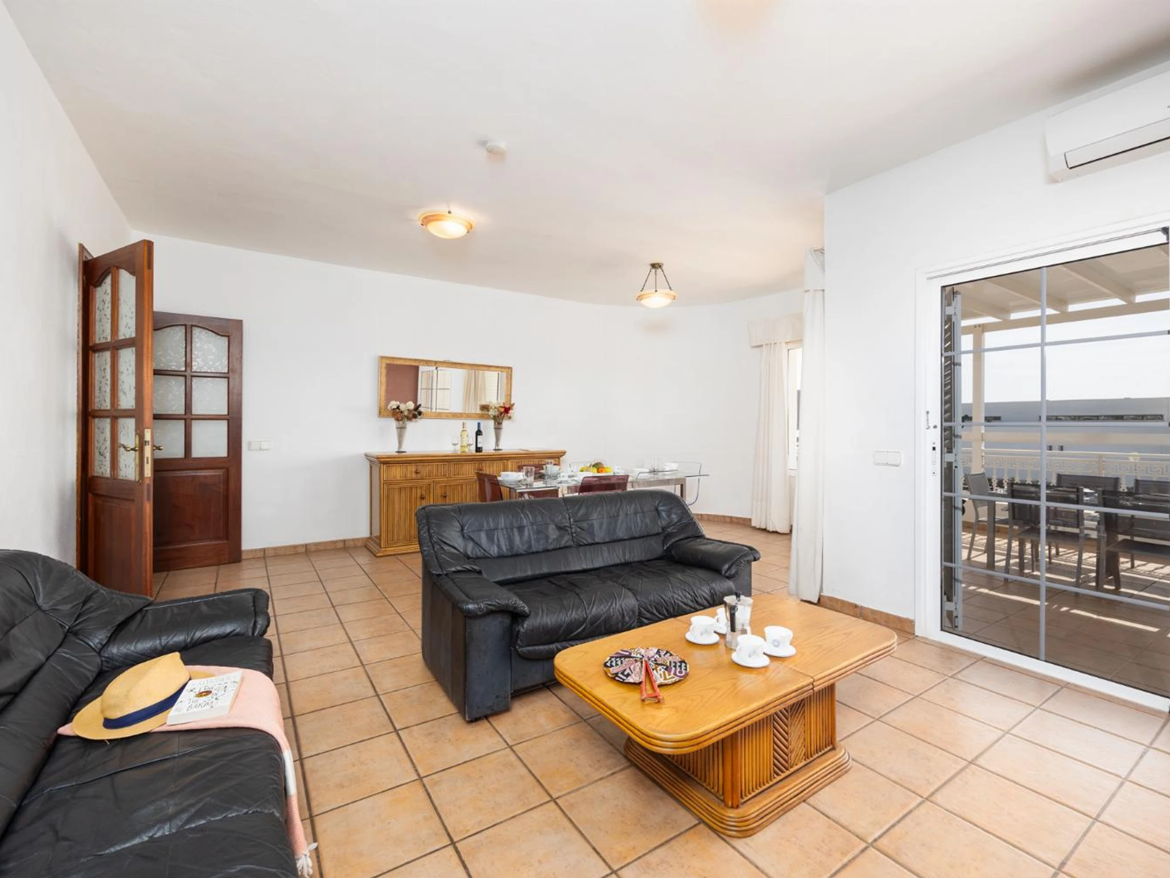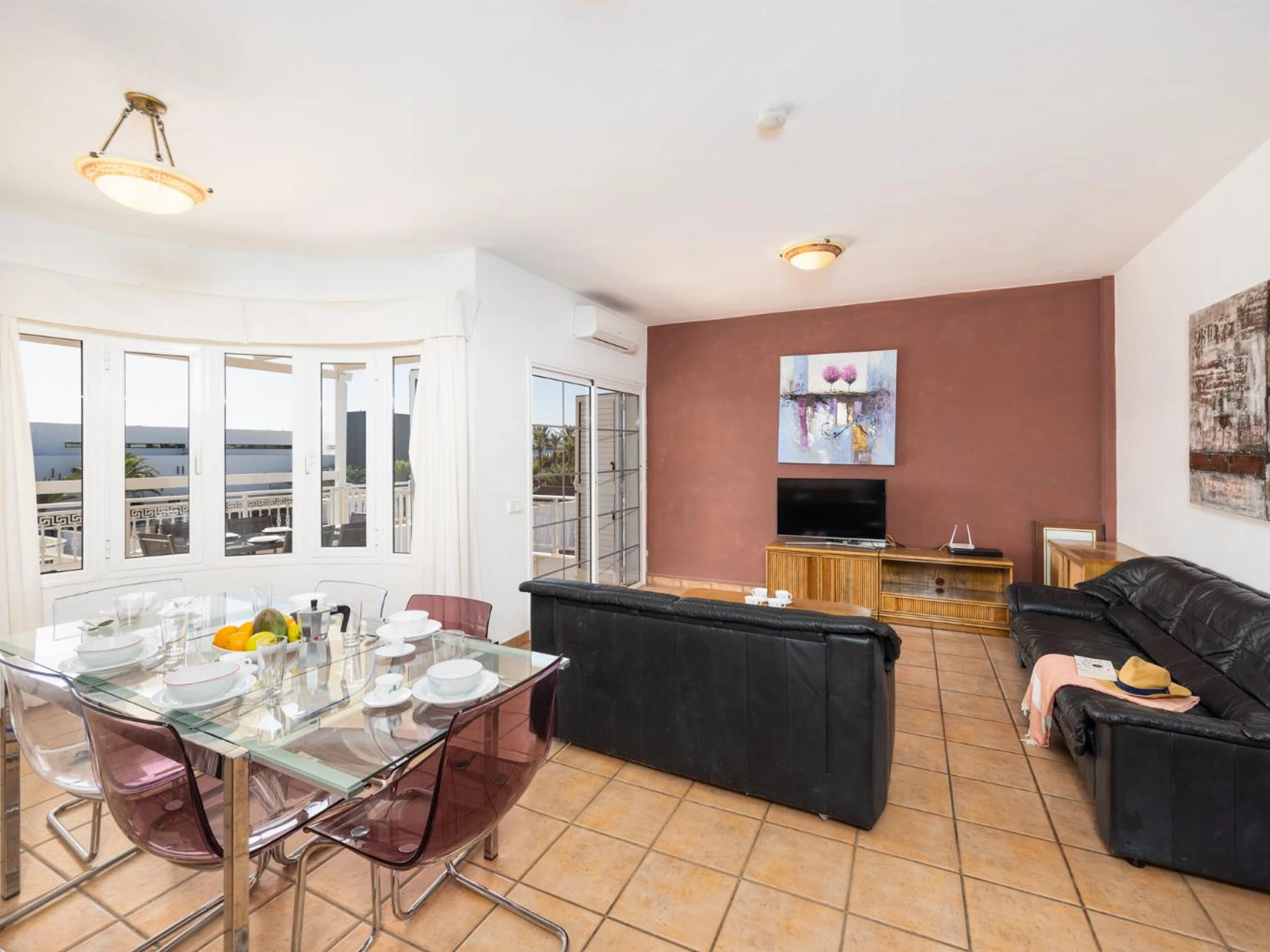 The living room is air-conditioned and has a dining area, comfortable
