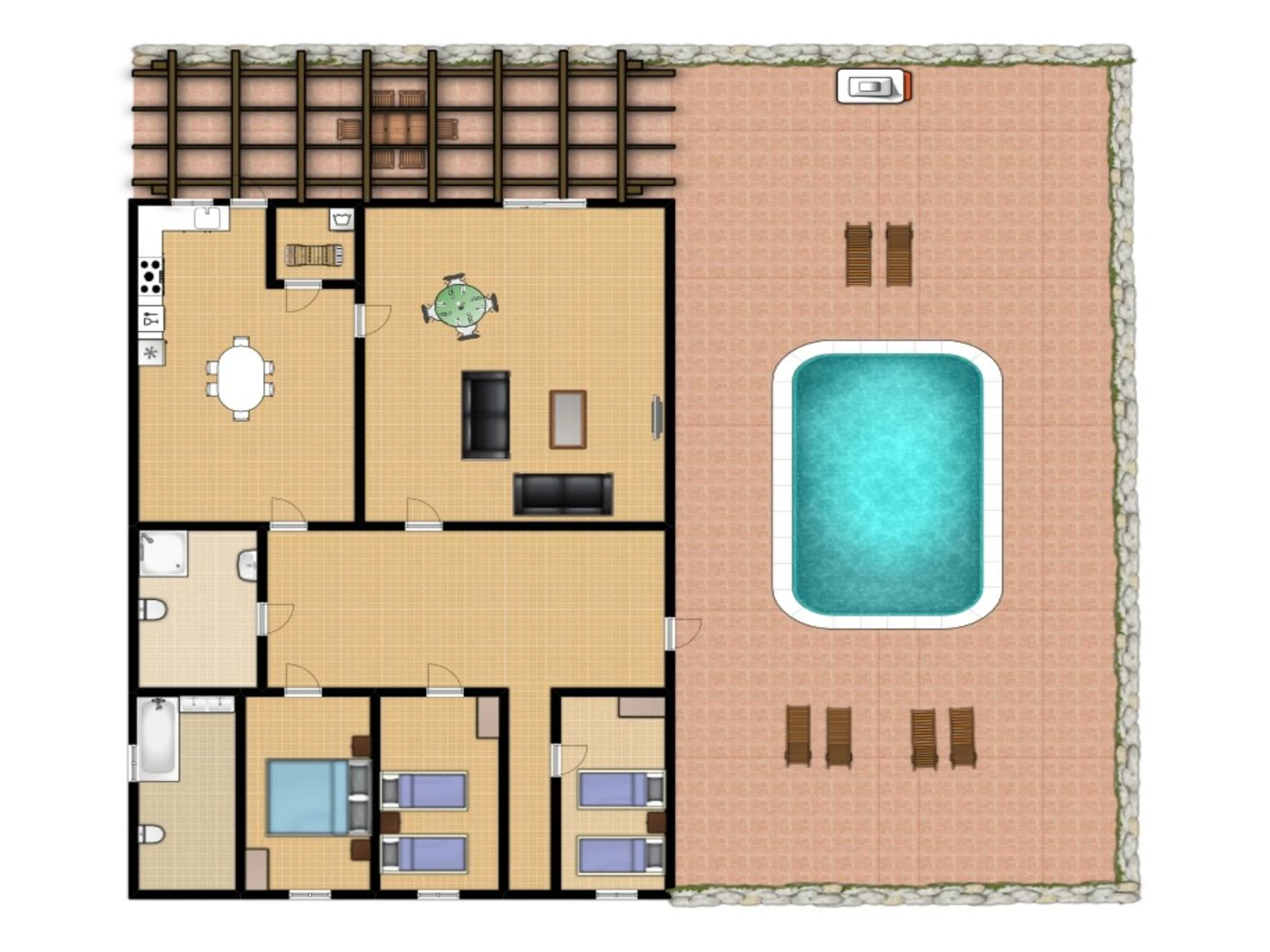 up to 6 people with 3 Bedrooms and 2 Bathrooms. There is a private pool