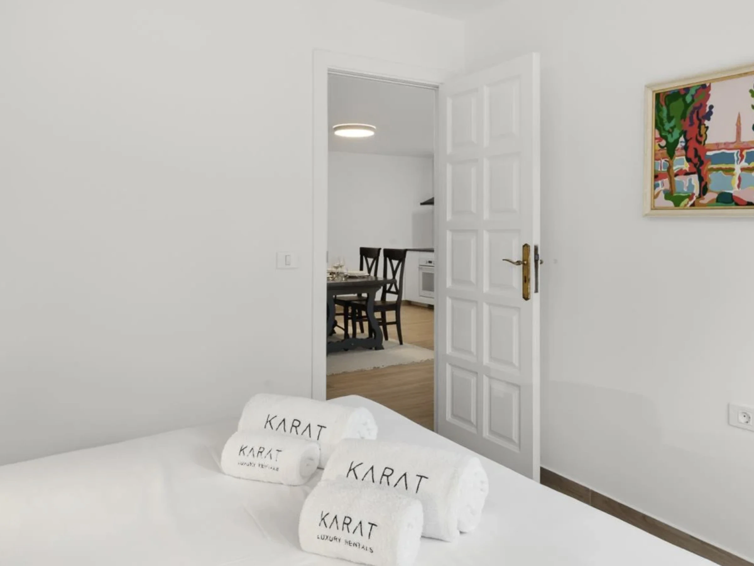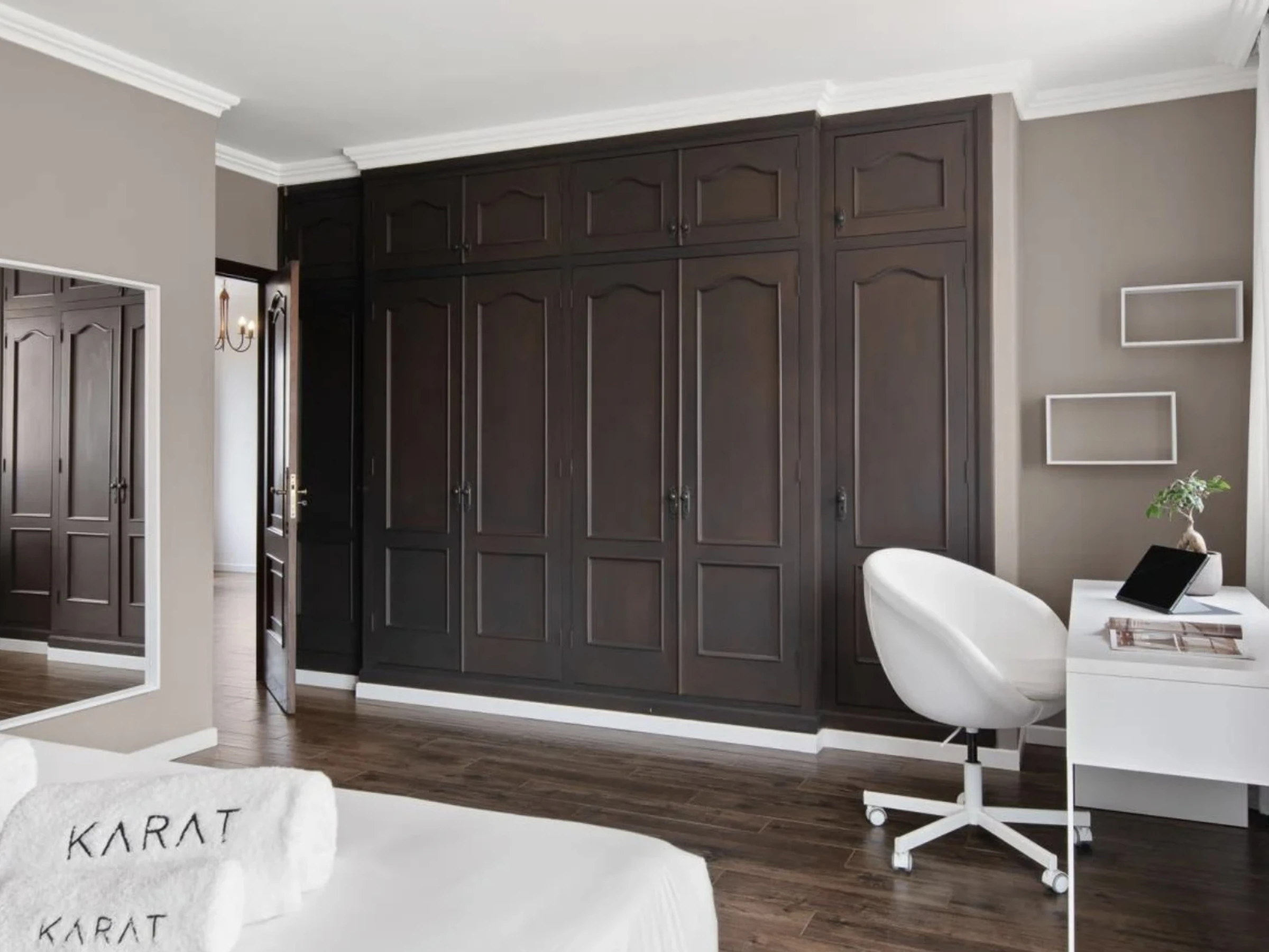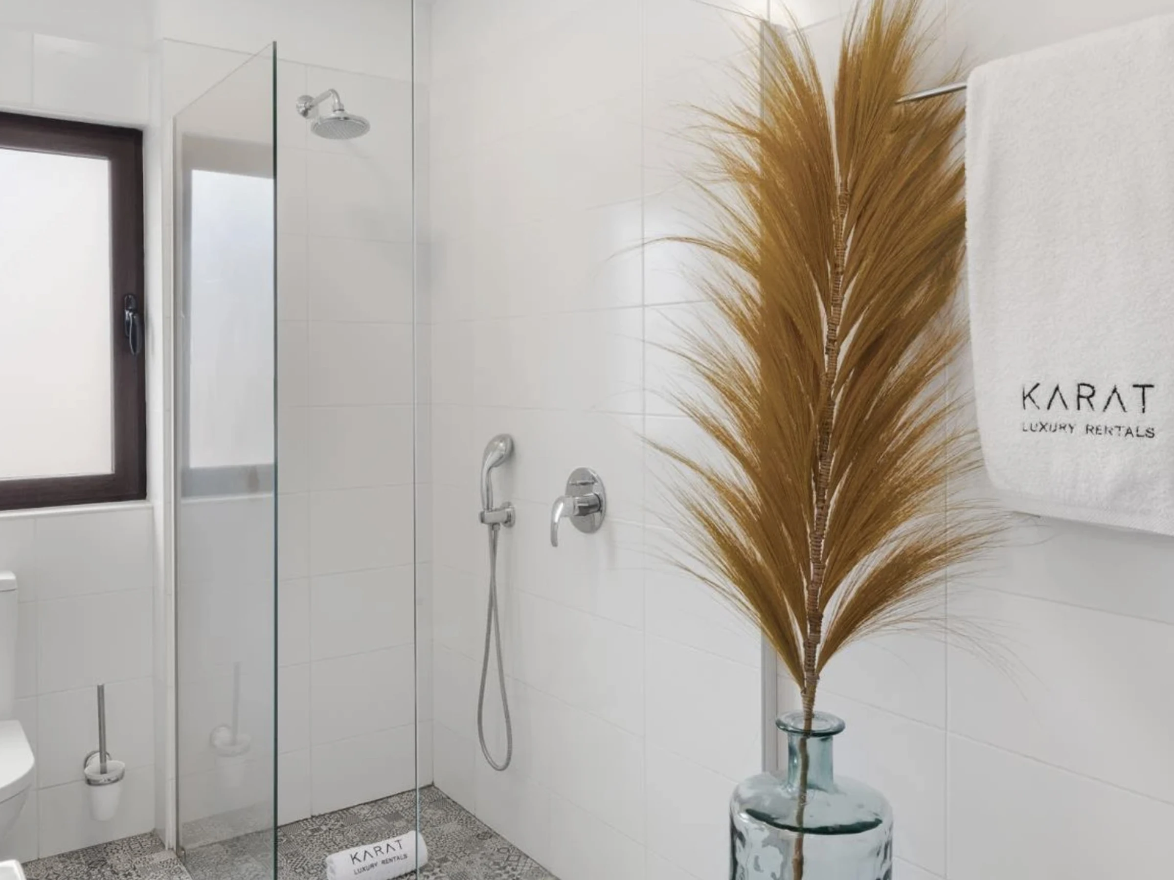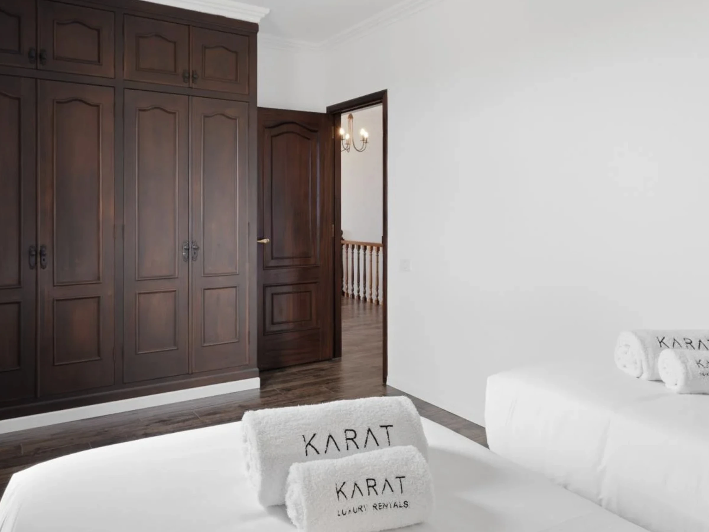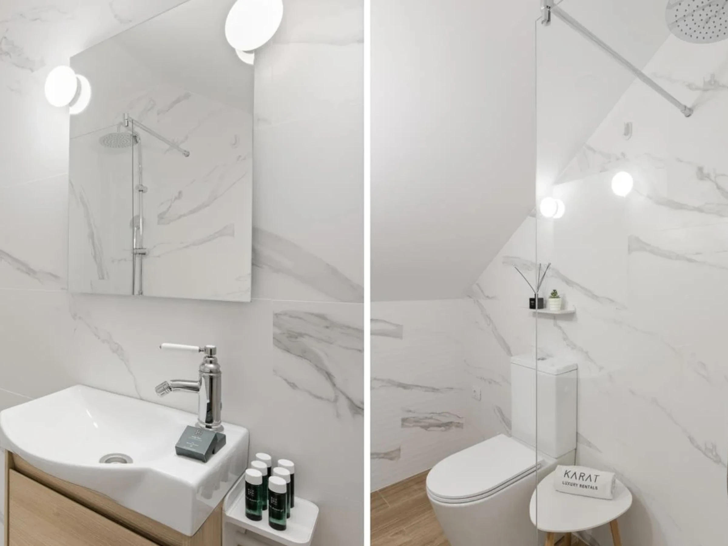 The upper floor is dedicated to rest and serenity. It features four elegant bedrooms: a majestic suite with a double bed (160x200 cm), a second double bedroom of the same size, and two additional rooms, each with two single beds (90x200 cm). There’s also an additional bathroom with a shower.