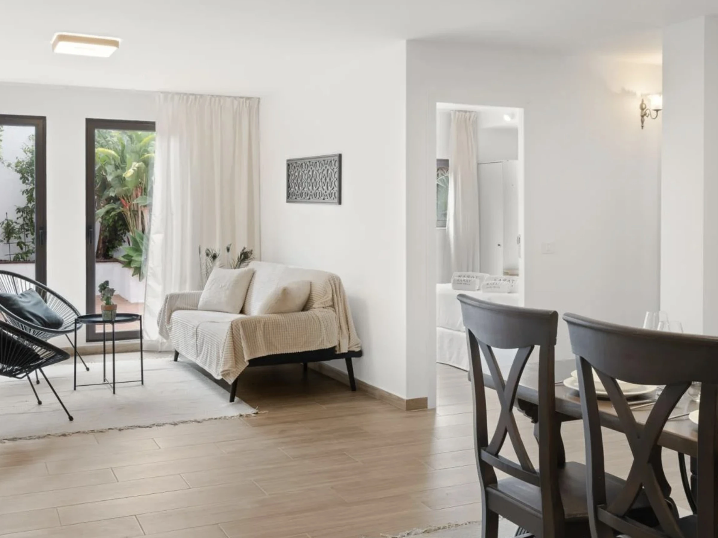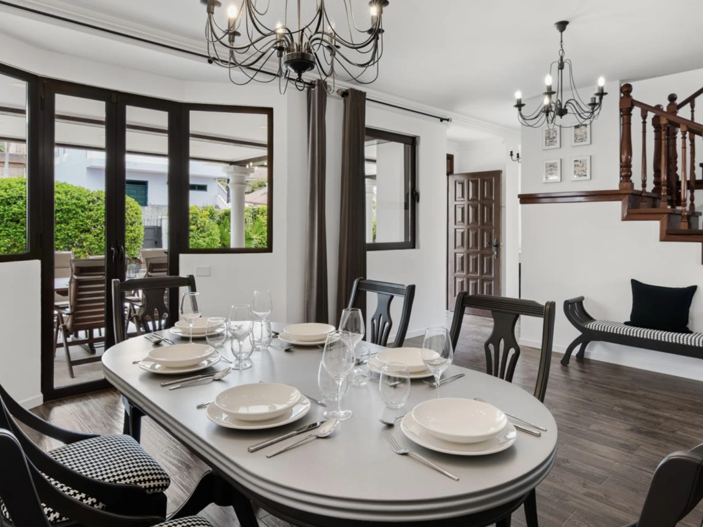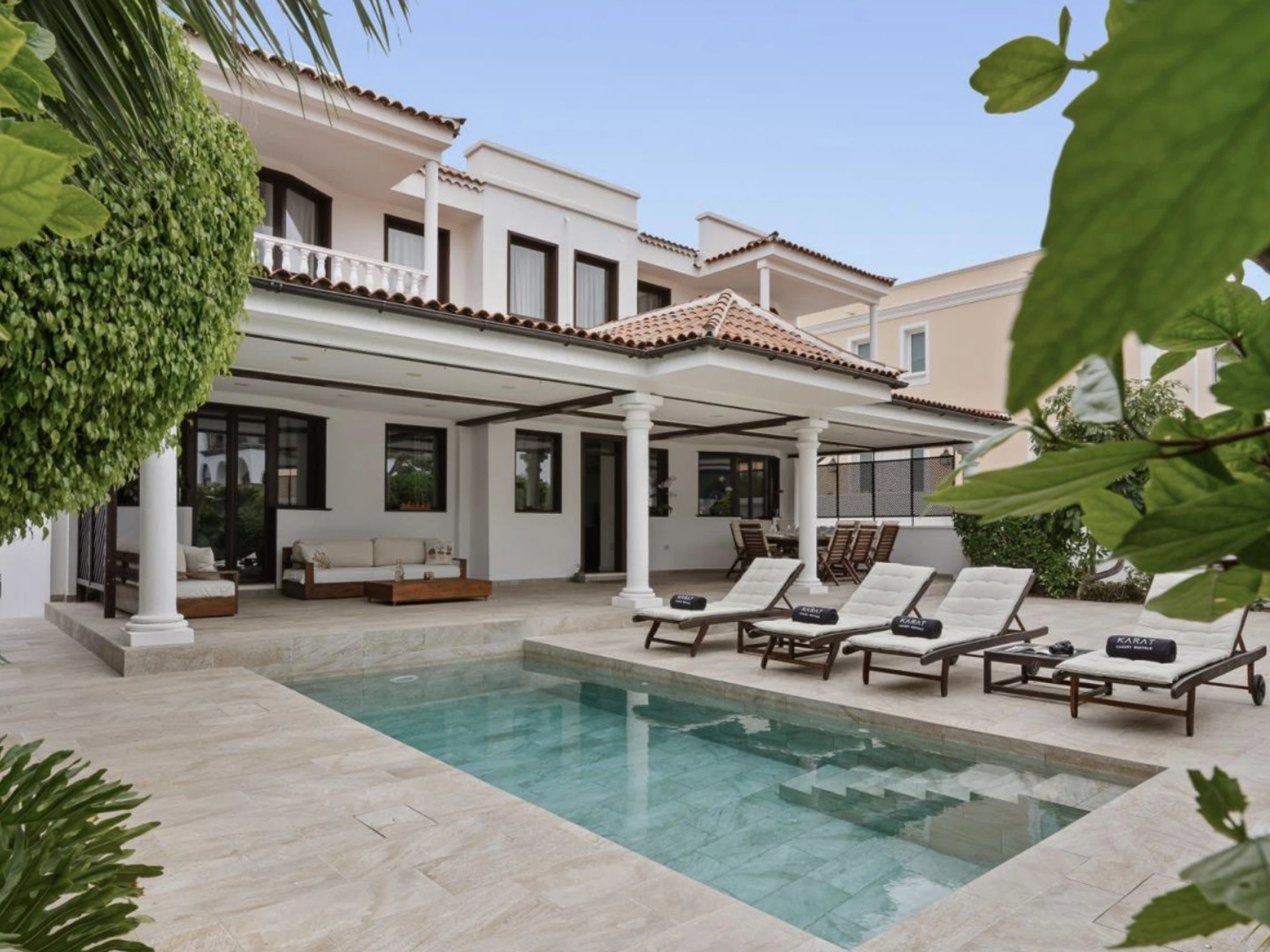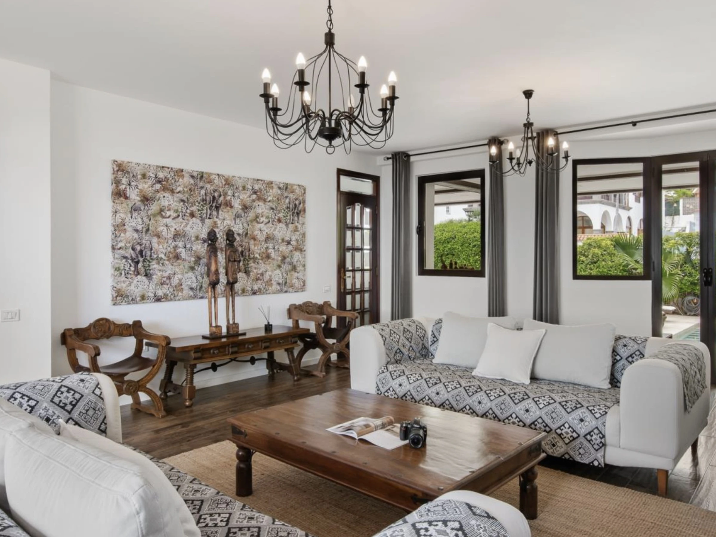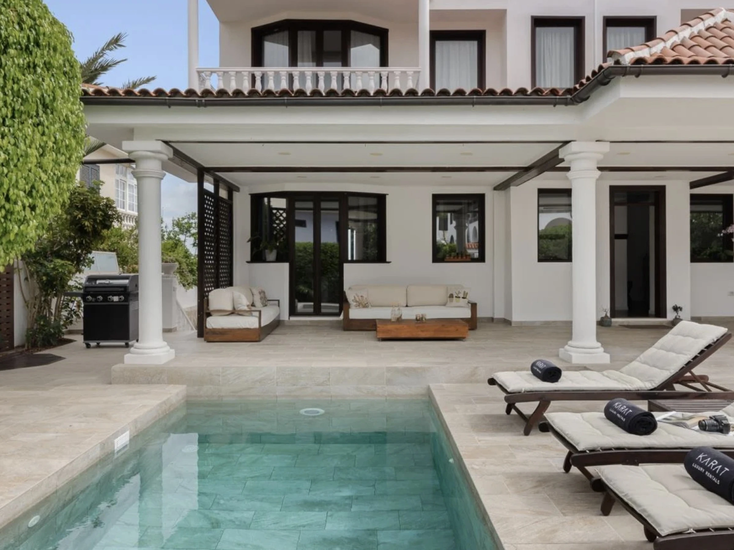 The exterior of the villa is a true relaxation oasis. The rear terrace is equipped with a stylish pergola, a table for eight guests, and a ping pong table. On the main terrace, the jewel of the property: a spectacular heated pool with counter-current and a gradual depth (130-170 cm), ideal for both swimming and exercise. Next to it, a furnished porch with noble wood pieces, a charming chill-out zone, and a large solarium with designer hammocks and auxiliary tables invite you to unwind completely.