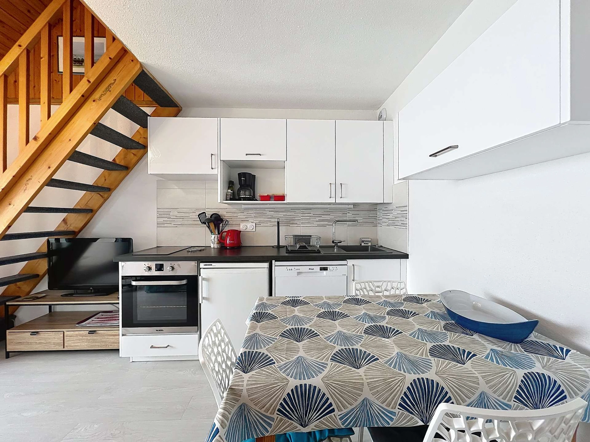 - an equipped kitchen area (ceramic hob, electric oven, refrigerator with freezer, dishwasher, kettle, coffee maker, toaster)