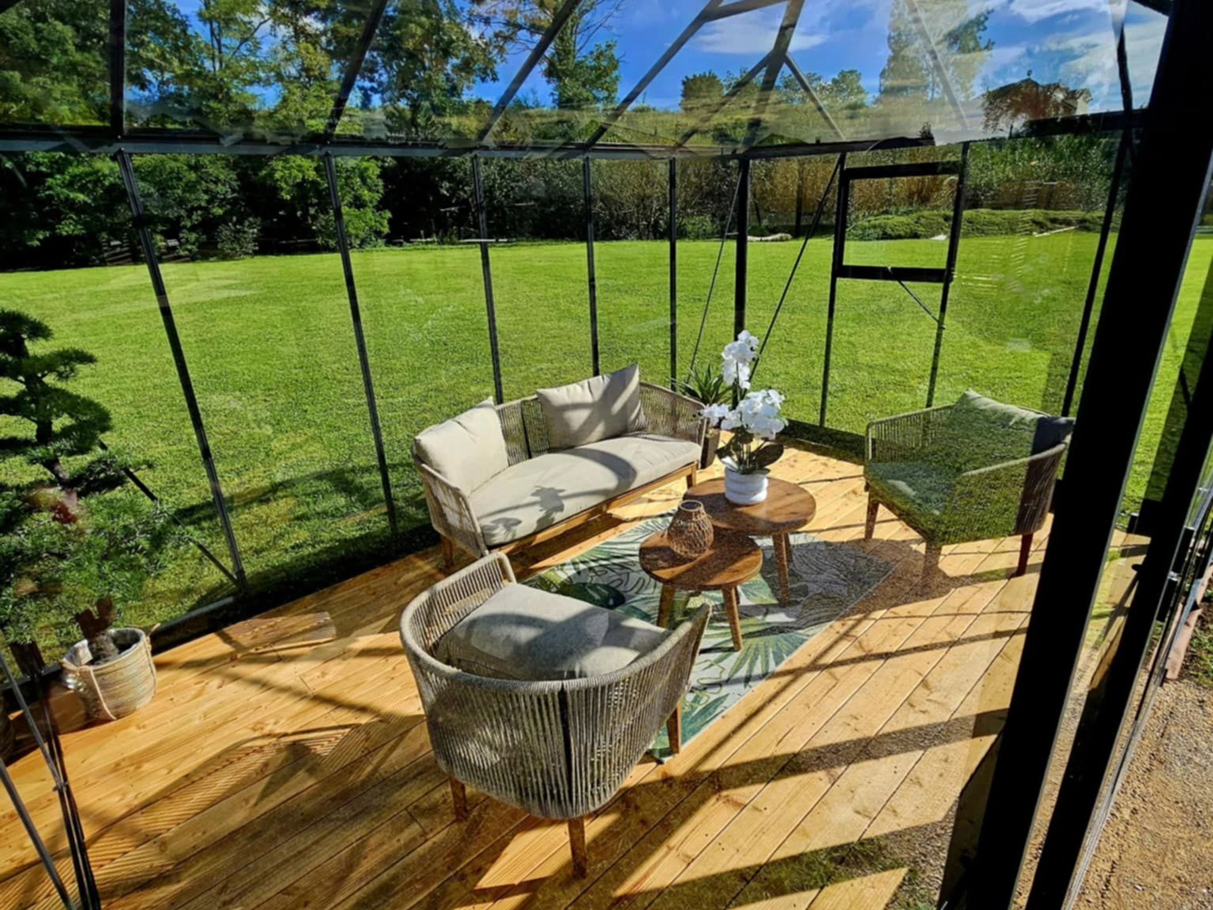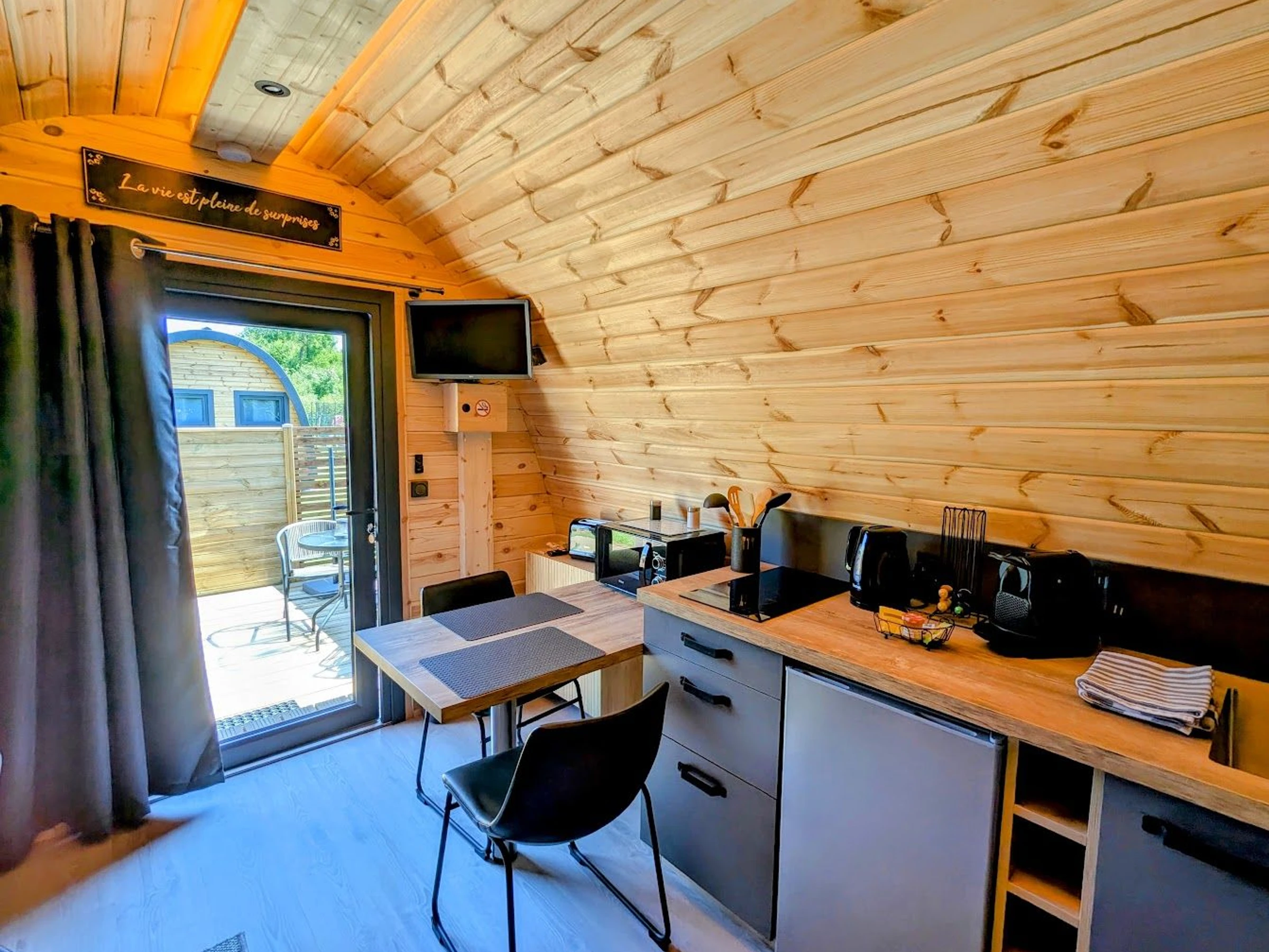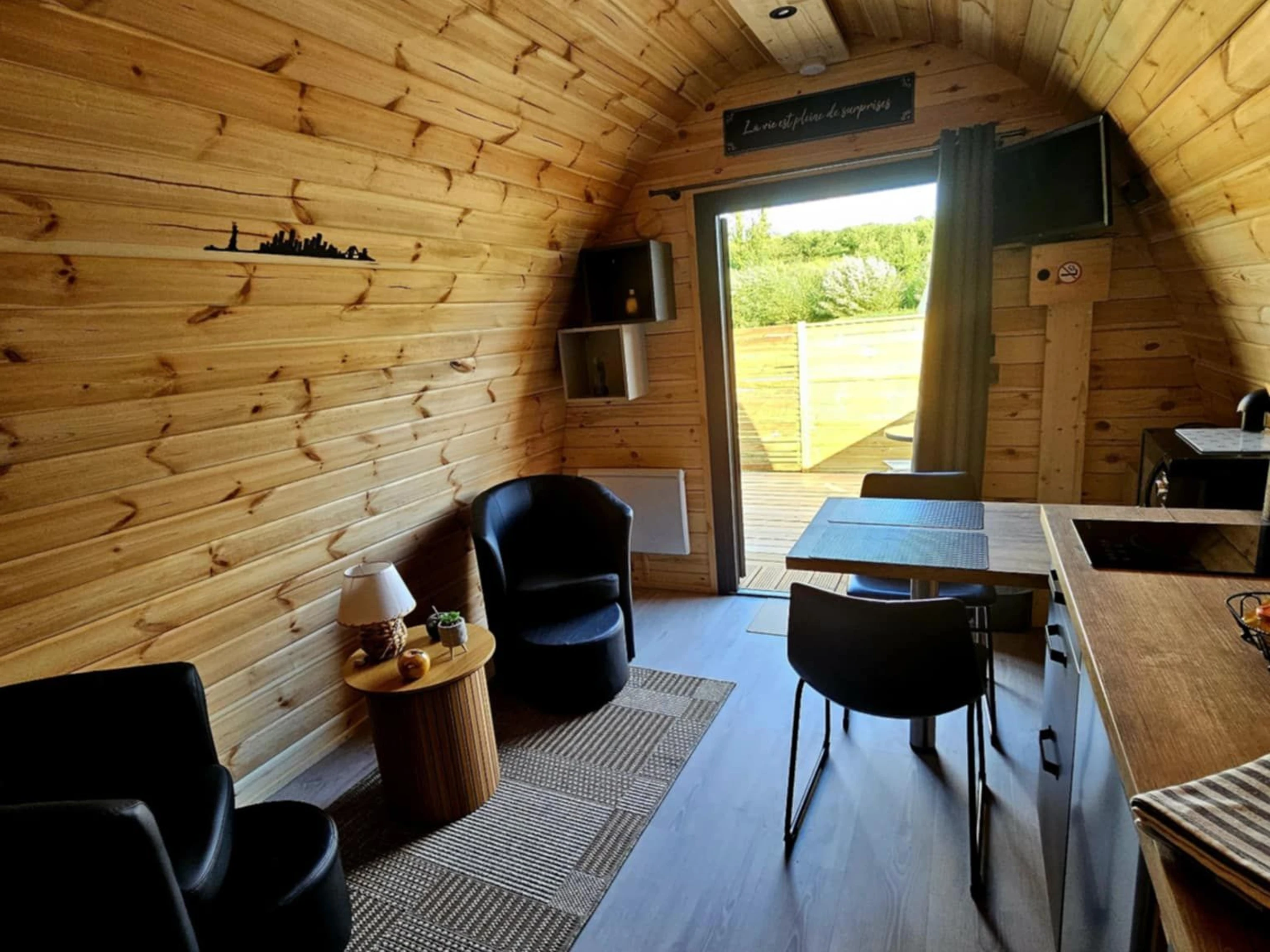 Welcome to an unusual stay in the heart of the village of Rainville. Our "Charme" Pod, a warm and elegant wooden cabin with flowing curves, combines Scandinavian design and natural elements with modern comforts. The Charme Pod can accommodate two people.