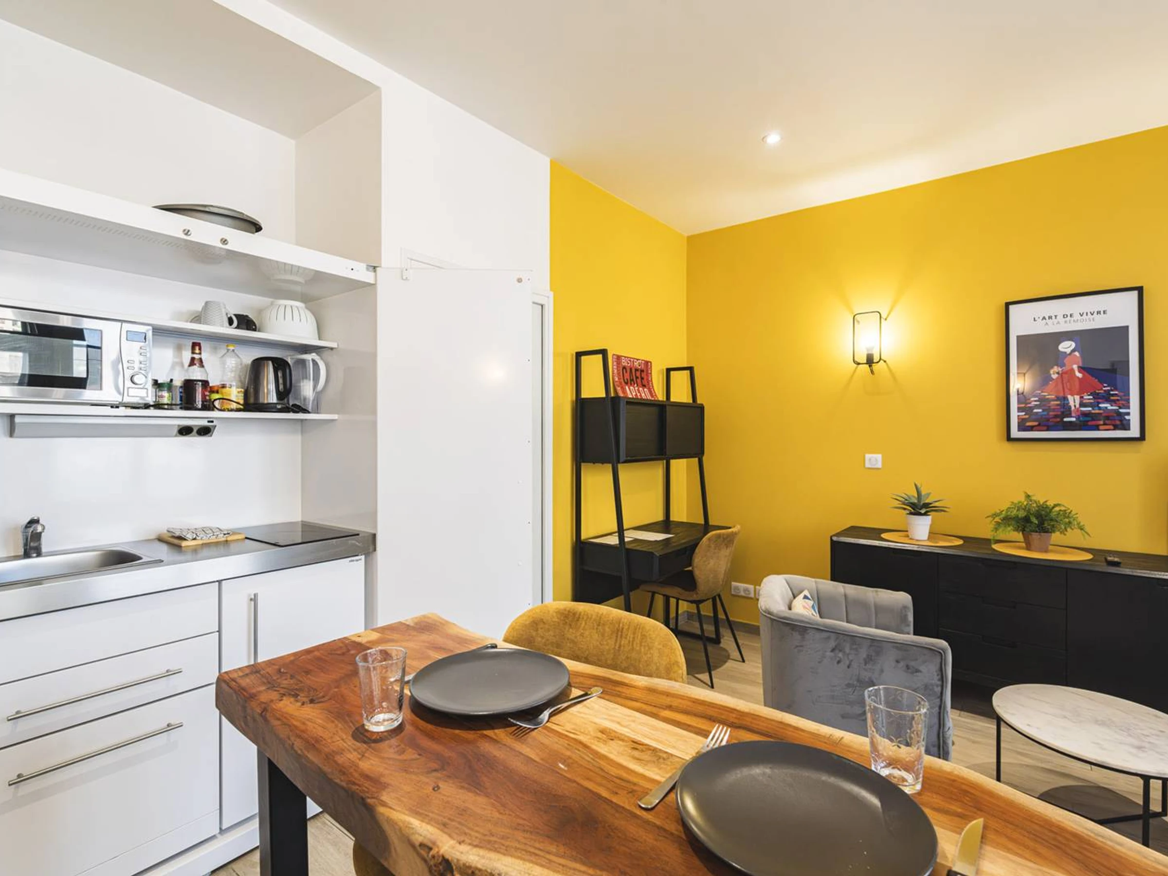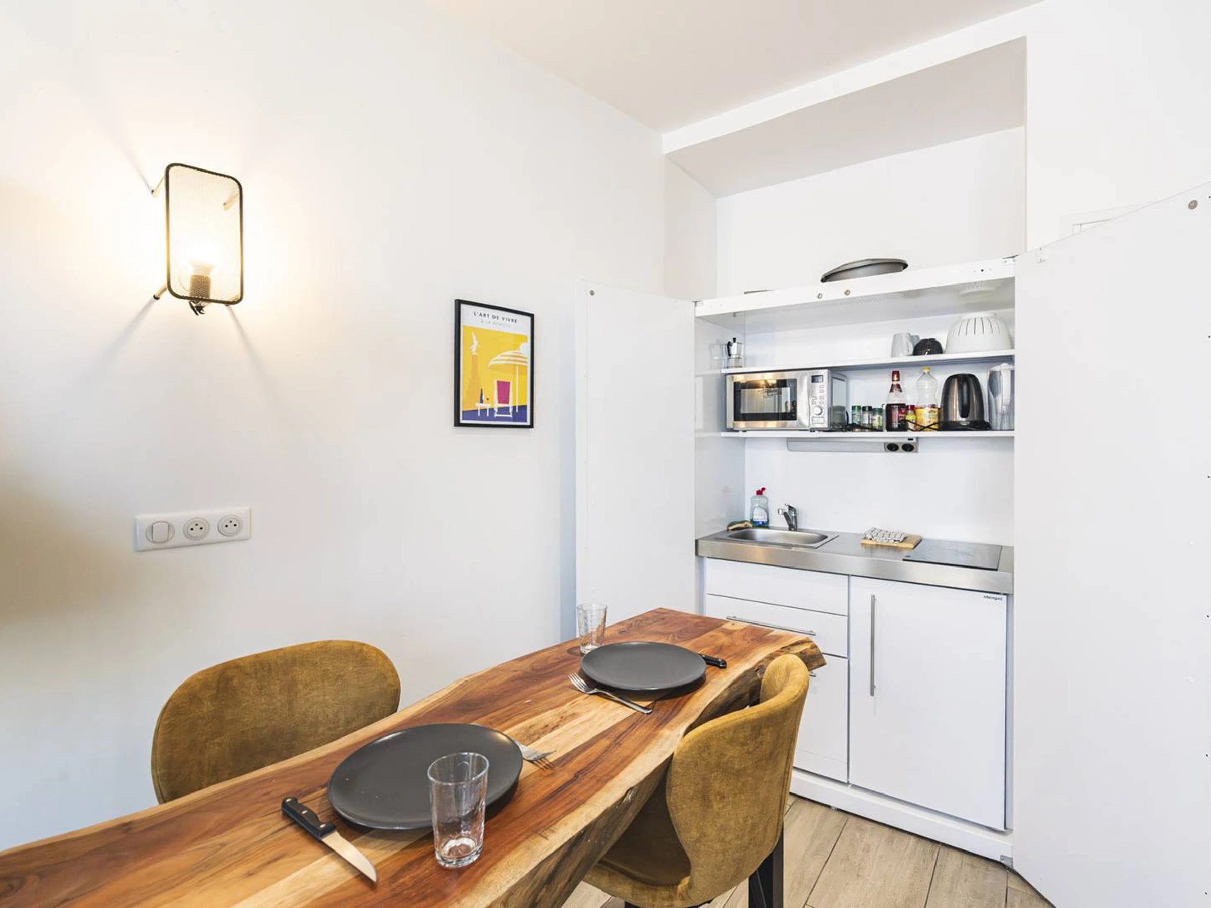 The open kitchen is designed to meet all your cooking needs. It is equipped with a microwave, a stovetop, and various kitchen utensils, allowing you to prepare meals with ease. The kitchen’s design blends harmoniously with the rest of the apartment, creating a friendly and practical atmosphere.