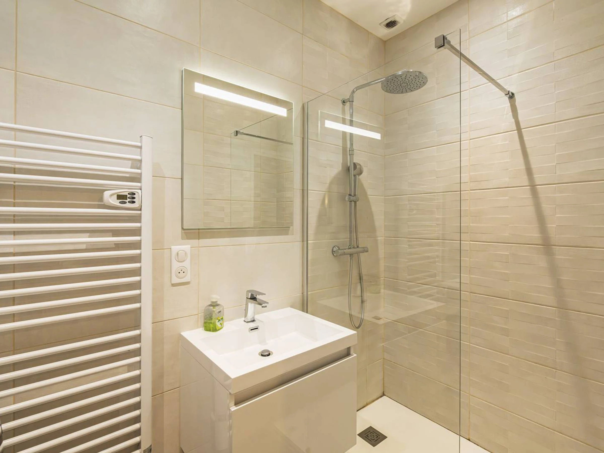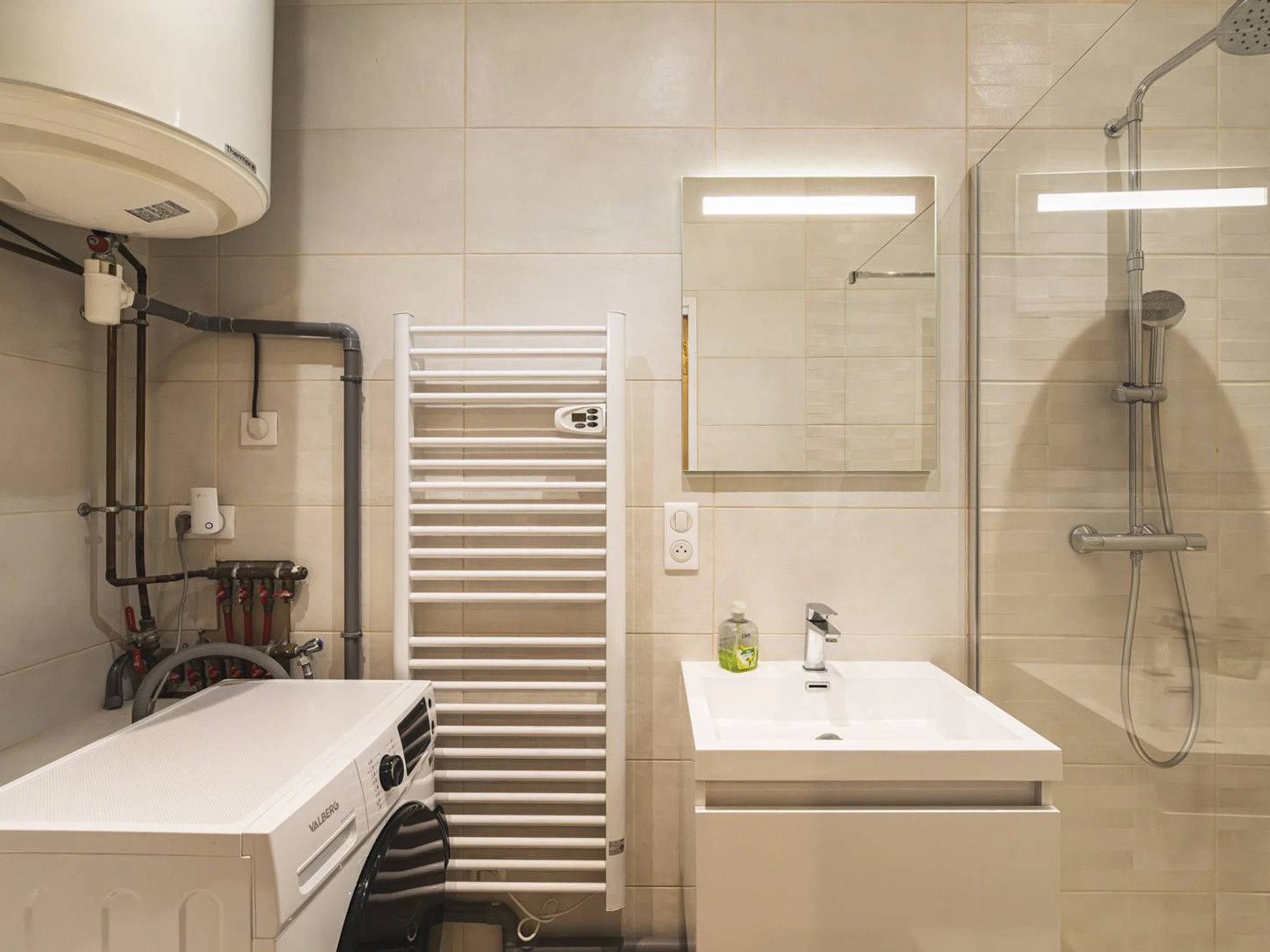 The modern and spacious walk-in shower room offers a relaxing shower experience. You will also find a washing machine for your everyday convenience.