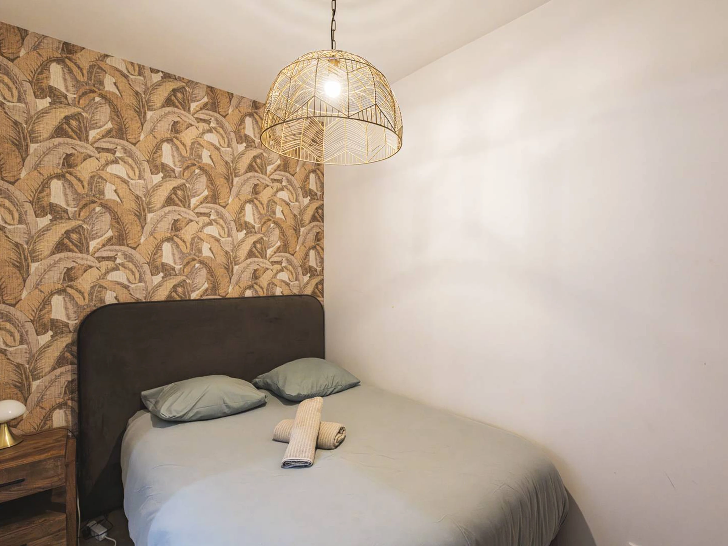 The apartment features a cozy bedroom equipped with a wardrobe with hangers and storage space for your personal belongings. This sleeping area is both functional and comfortable, ideal for resting after a busy day.
