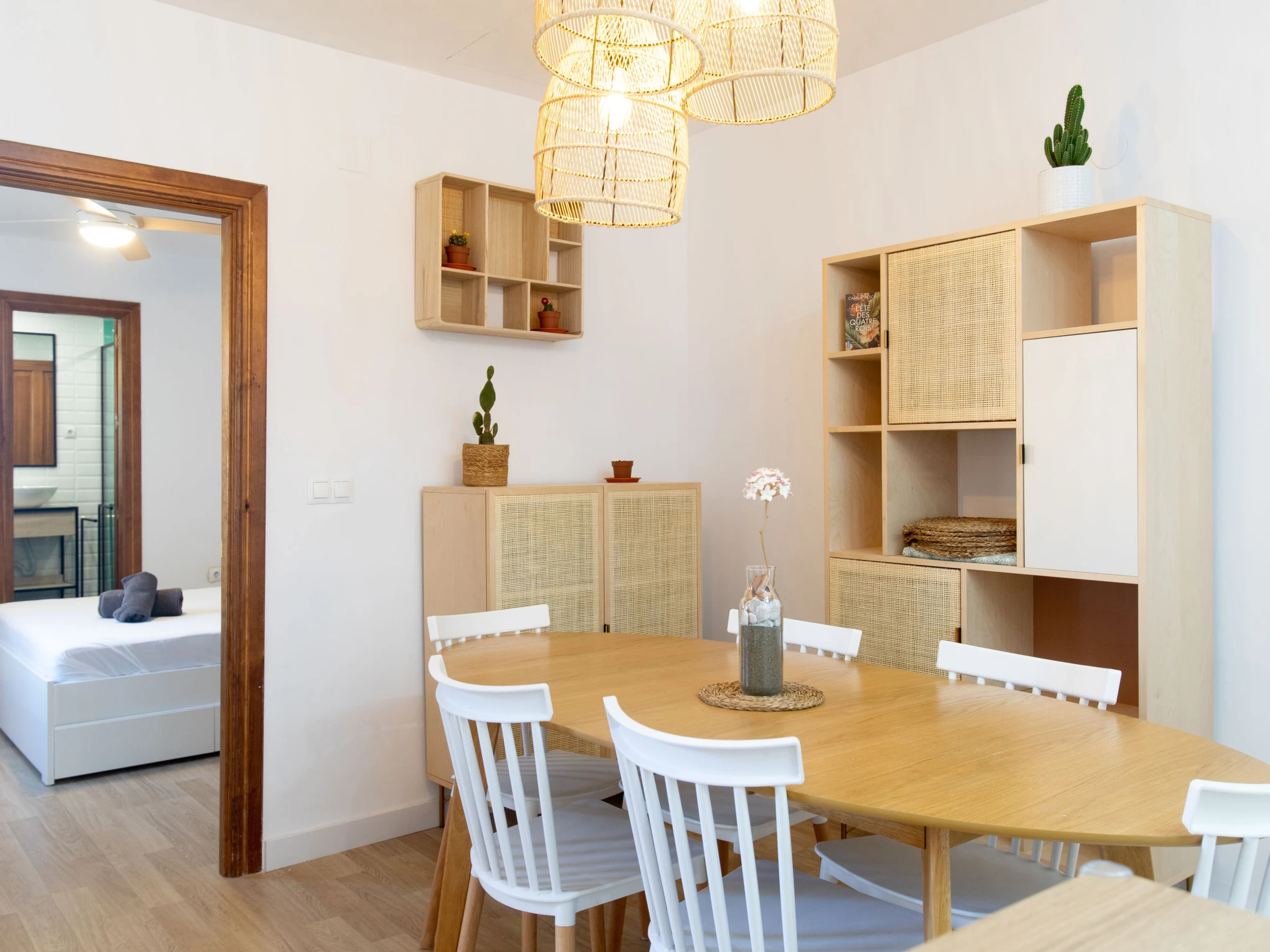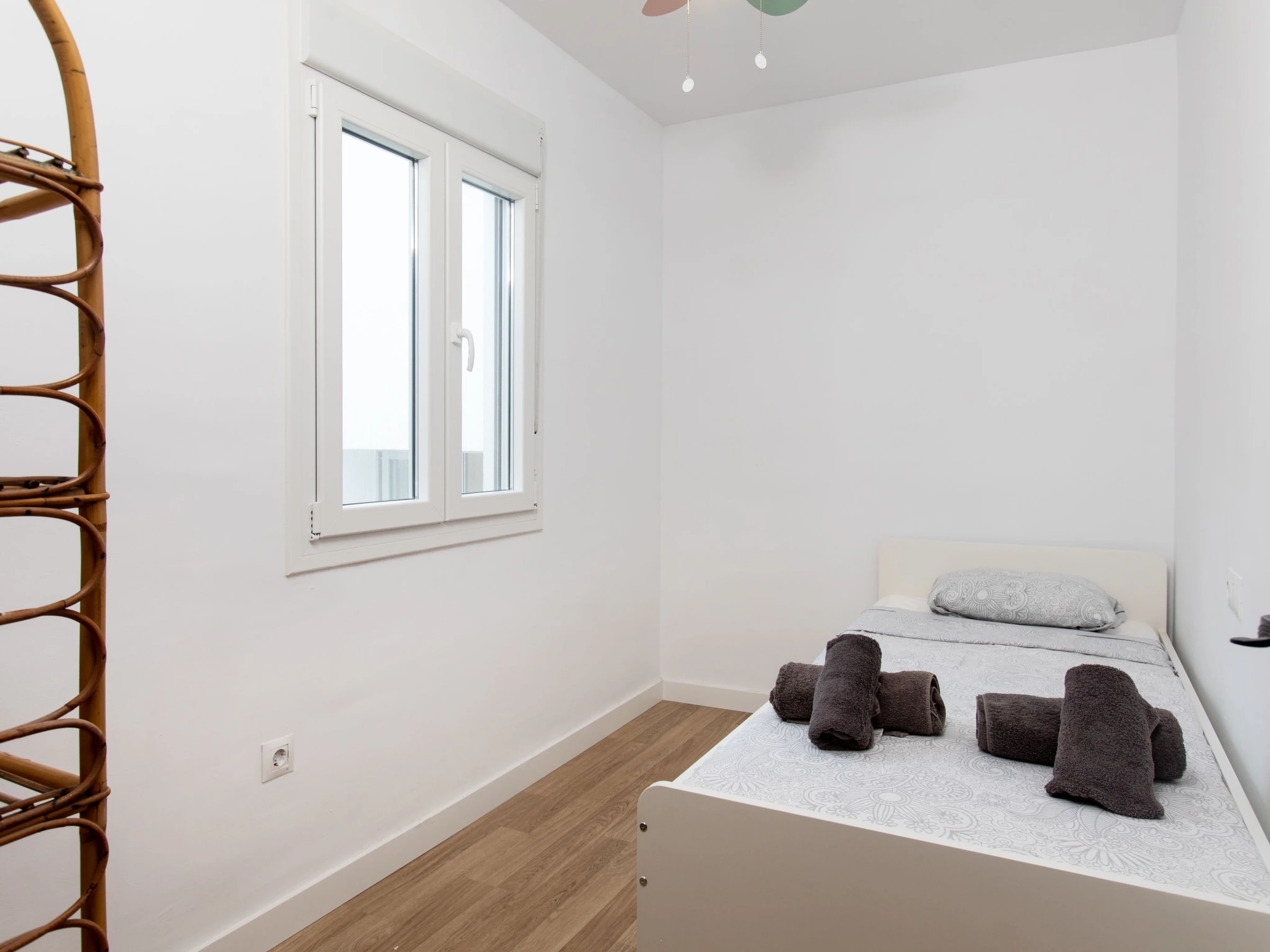 "Constitución Square", 3-room apartment 66 m2. Object suitable for 4 adults + 2 children. Fully renovated in 2019, practical and beautiful furnishings: 1 room with 1 french bed (1 x 160 cm, length 190 cm), shower/WC, double hand-basin and air conditioning. 1 room with 1 french bed (1 x 140 cm, length 190 cm). 1 room with 2 beds (90 cm, length 190 cm), air conditioning. Living/dining room with dining table, digital TV and air conditioning. Exit to the terrace. Open kitchen (oven, dishwasher, 4 ceramic glass hob hotplates, toaster) with bar. Shower/WC. Small terrace. View of the resort. Facilities: washing machine, iron, children's high chair, baby cot (extra), hair dryer. Internet (WiFi, free). Please note: suitable for families. TV only ES. [hidden] // Reg. Nr.: ESFCTU0000290250003678040000000000000000[hidden]4