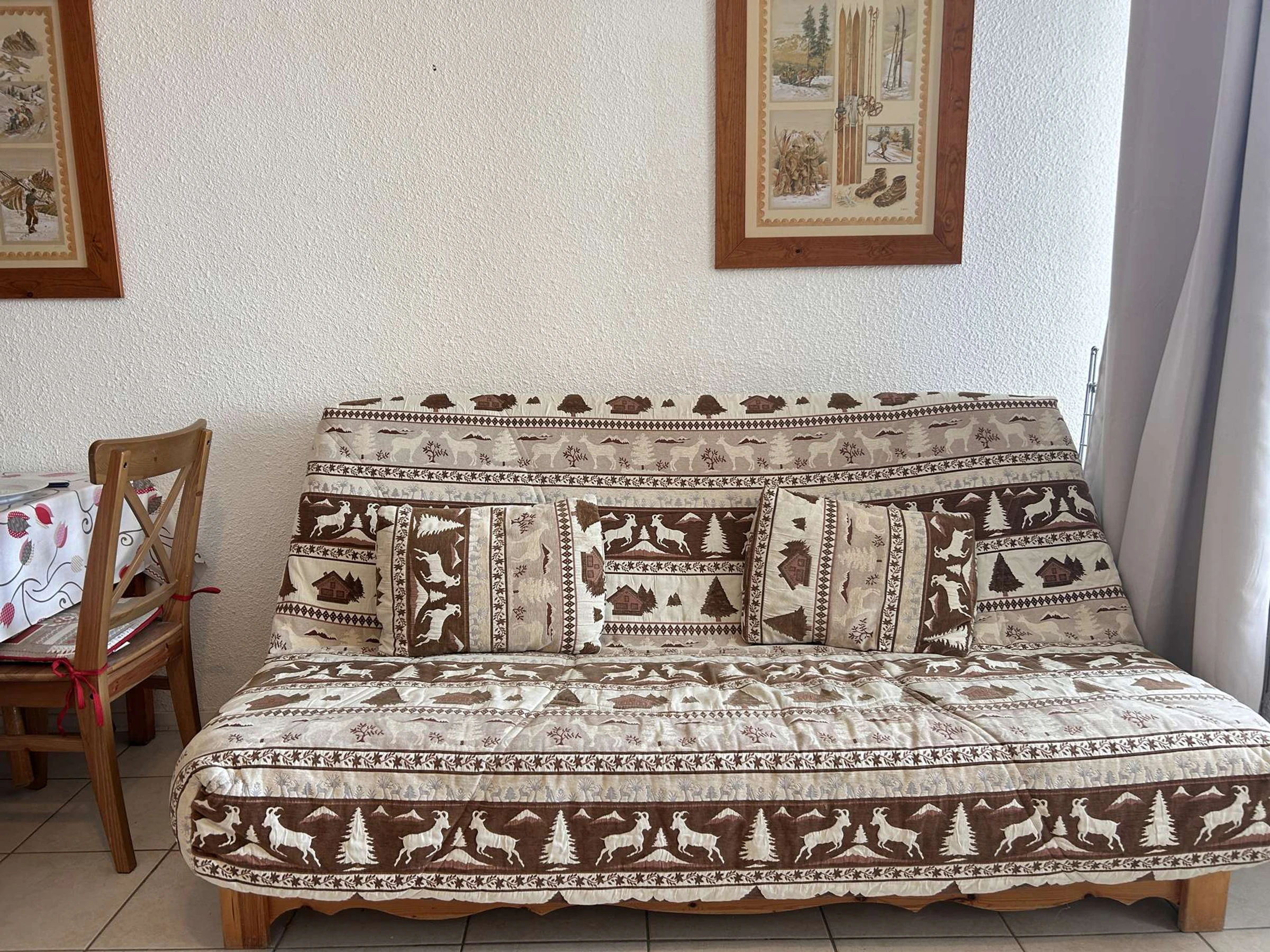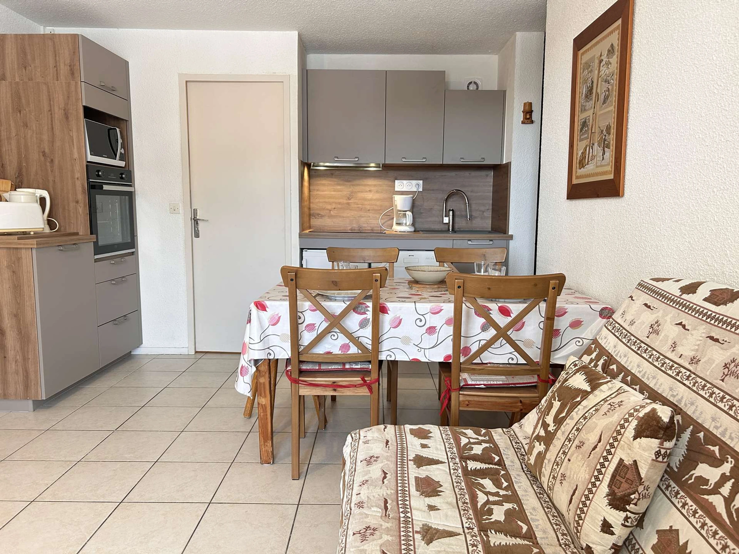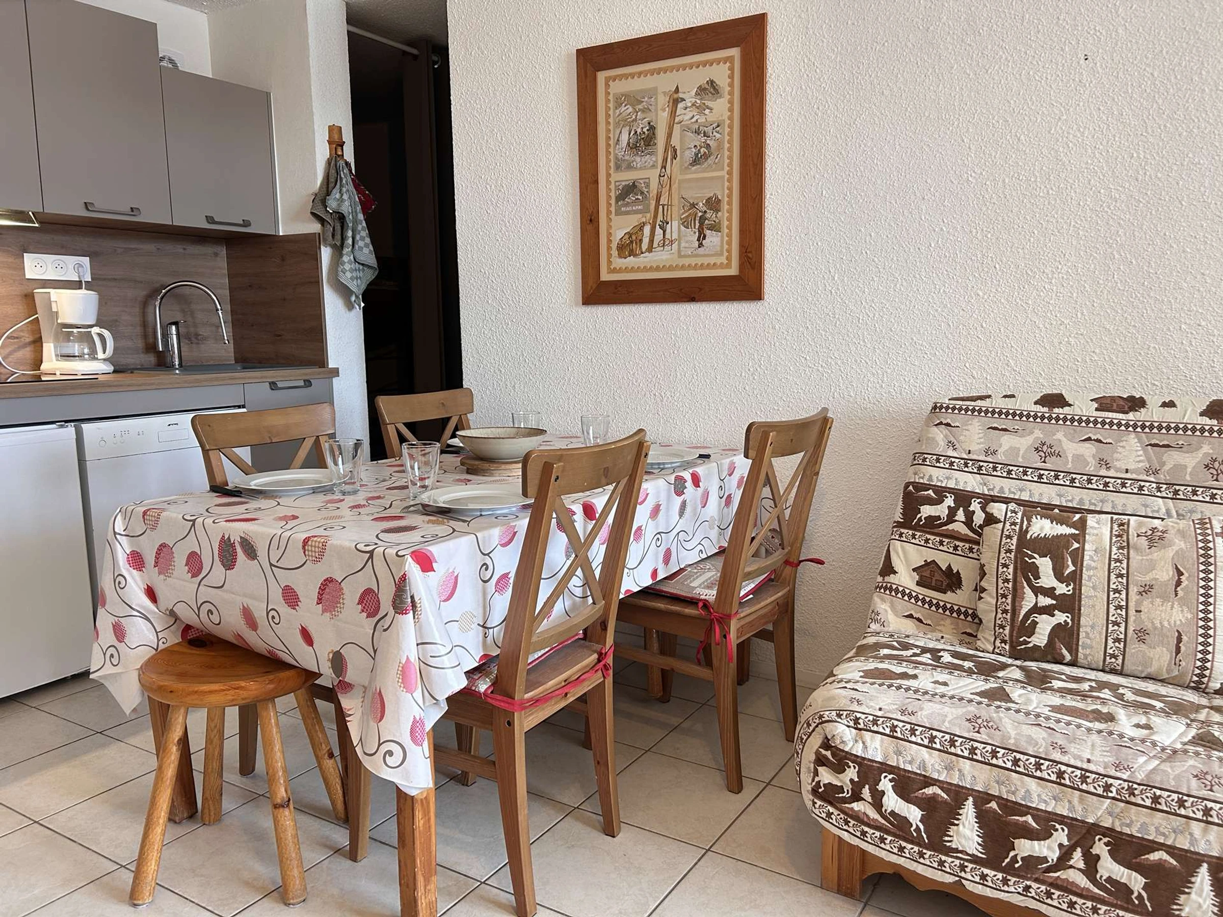 Located in the eastern sector of the resort, this vacation rental, on the 4th floor with elevator, features a sofa bed in the living room, a bedroom with a double bed (140 cm), and two bunk beds in a mountain corner.