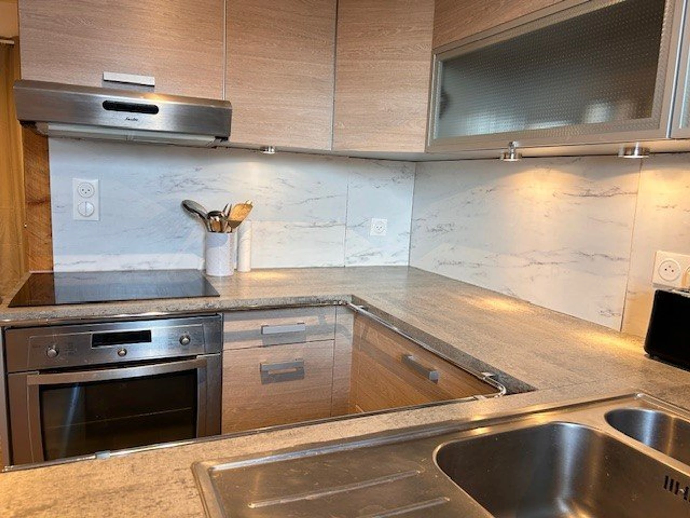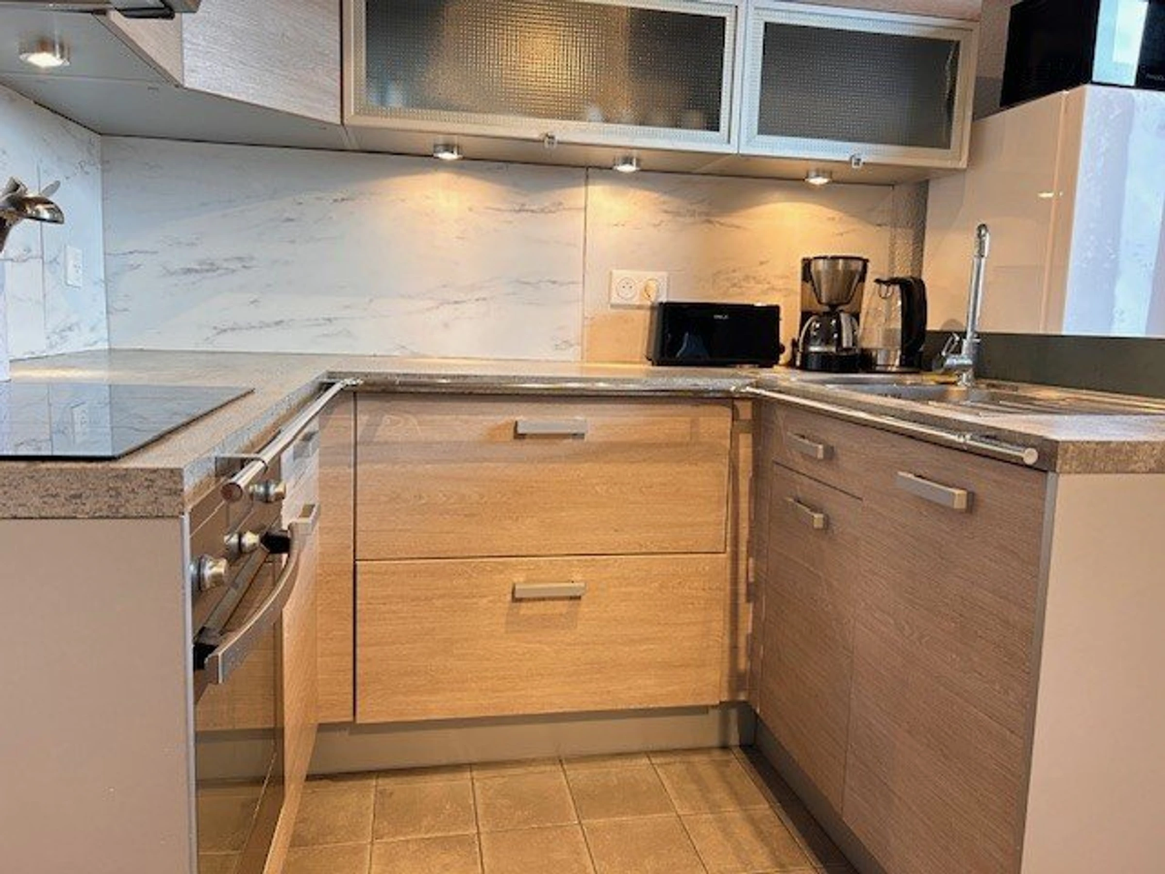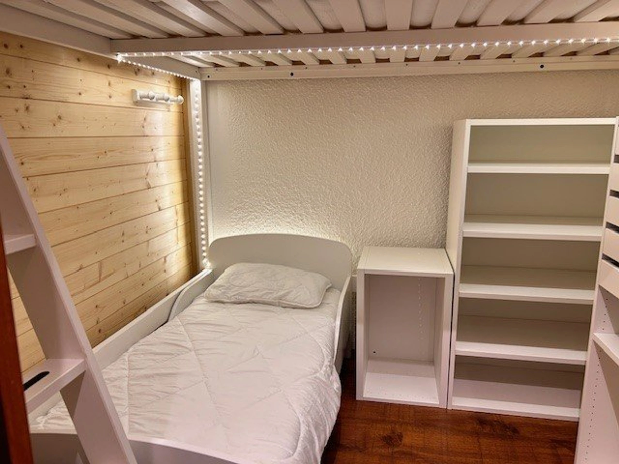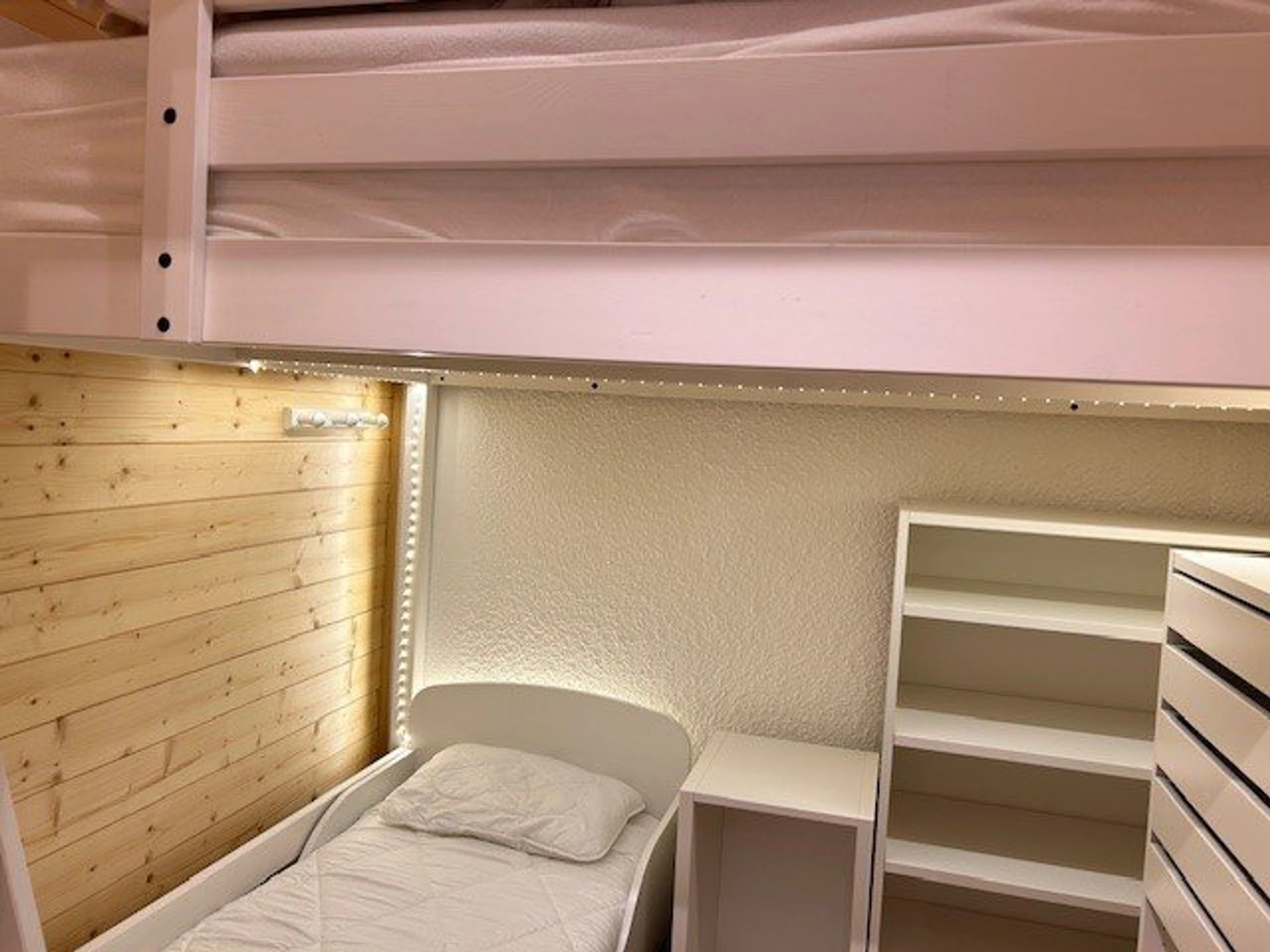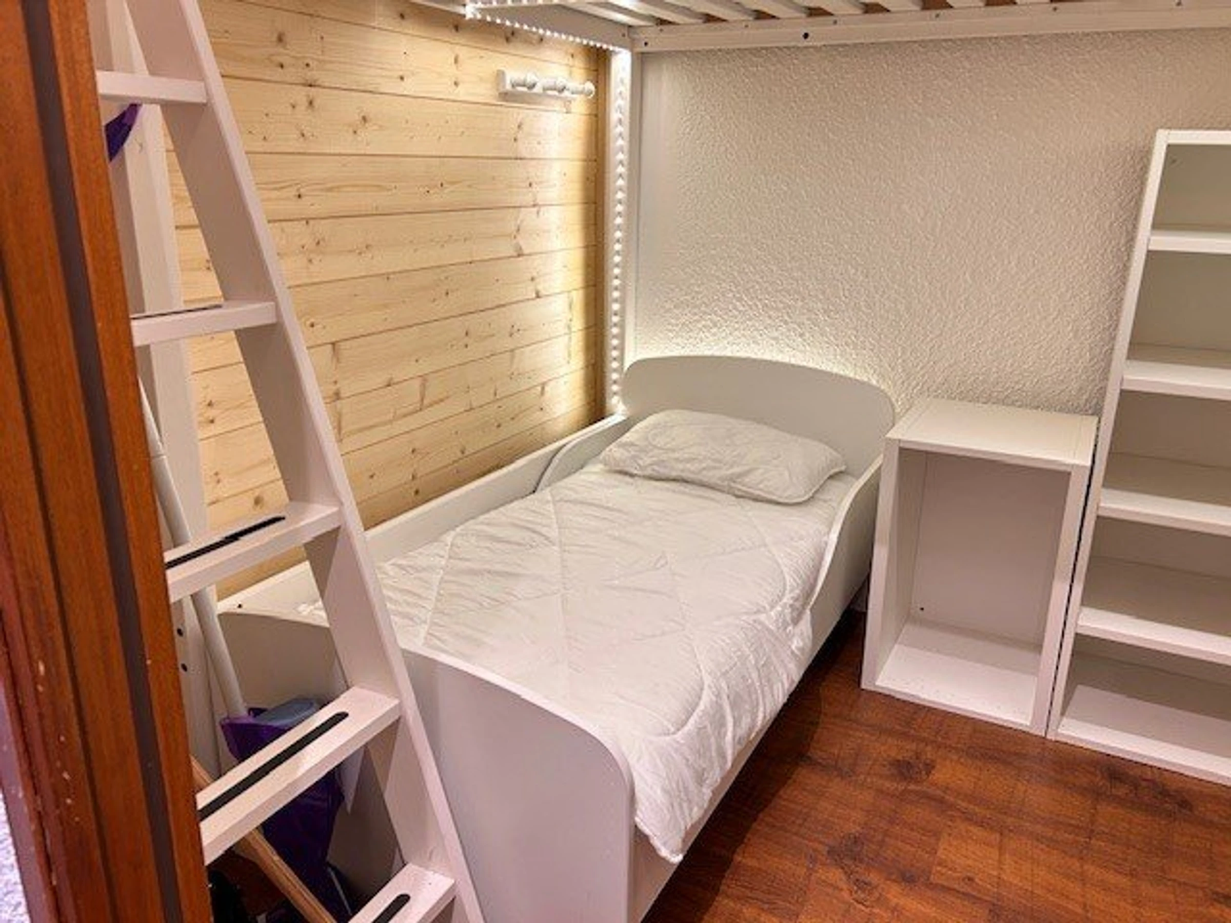 The apartment features a living room with a Rapido sofa and a large, well-equipped kitchen. It has a sleeping alcove with a double mezzanine bed and a 70 cm child's bed. There is also a bathroom with a shower and a separate toilet.