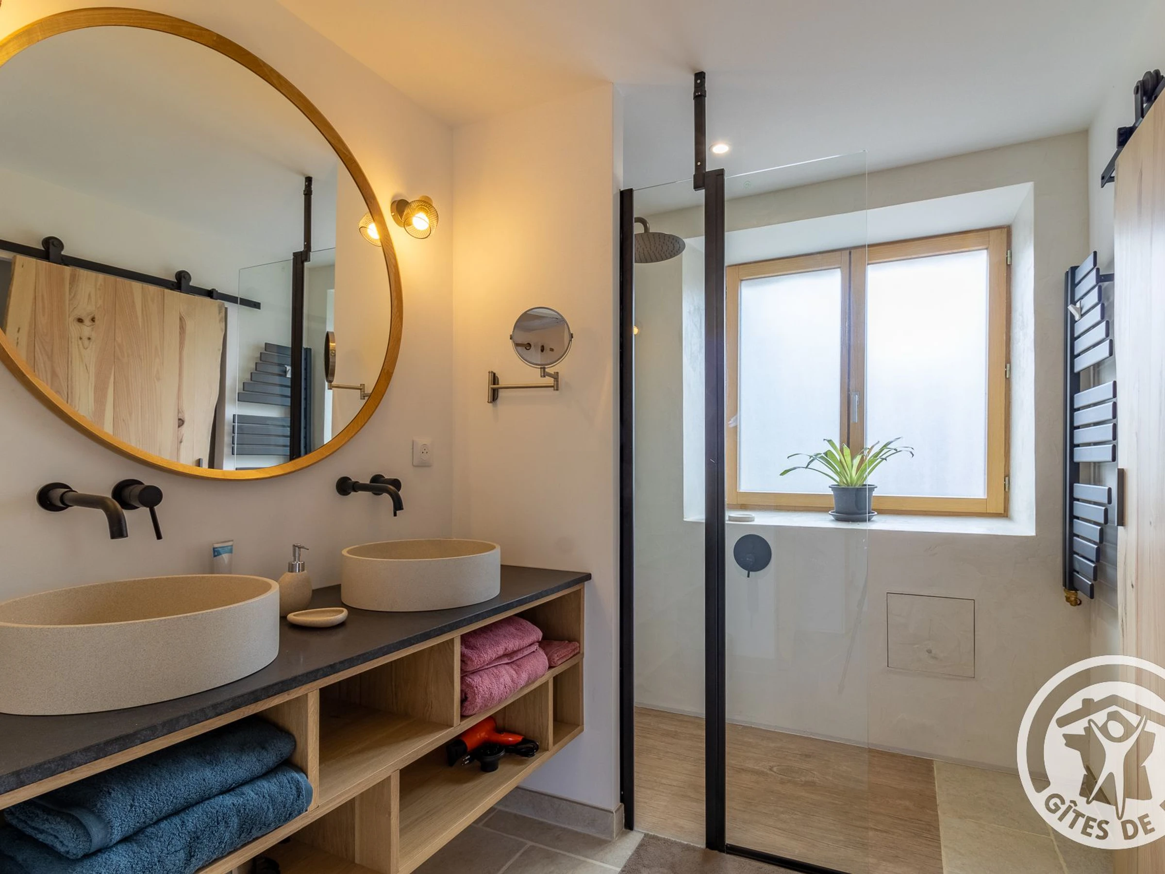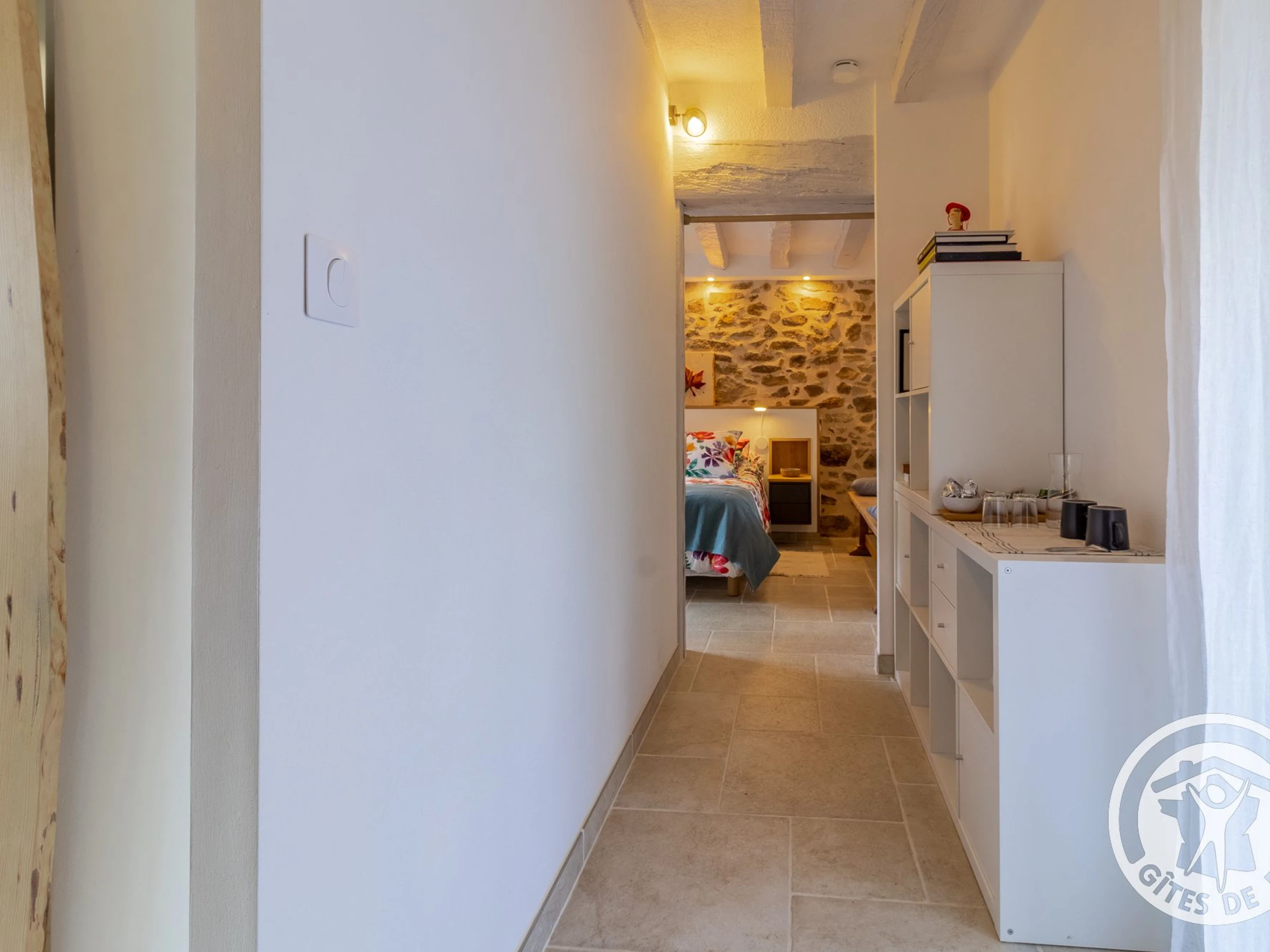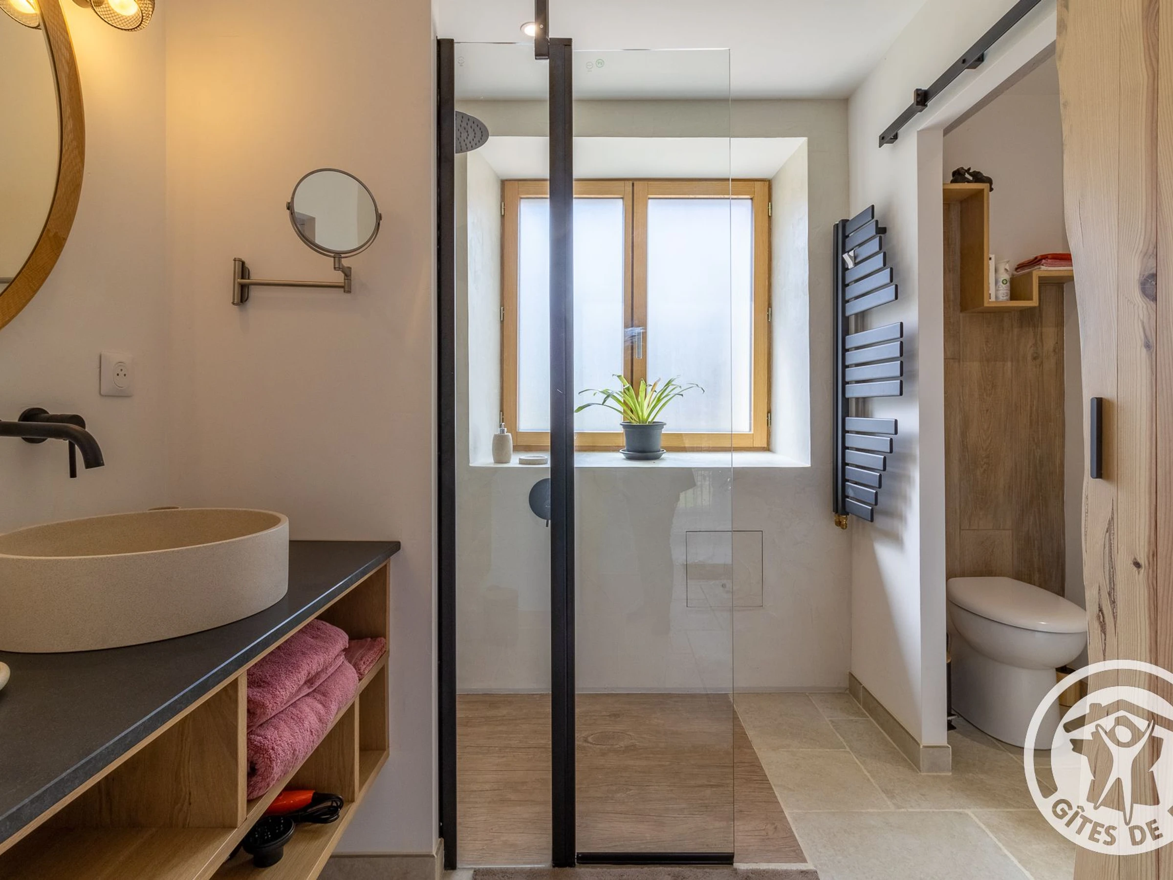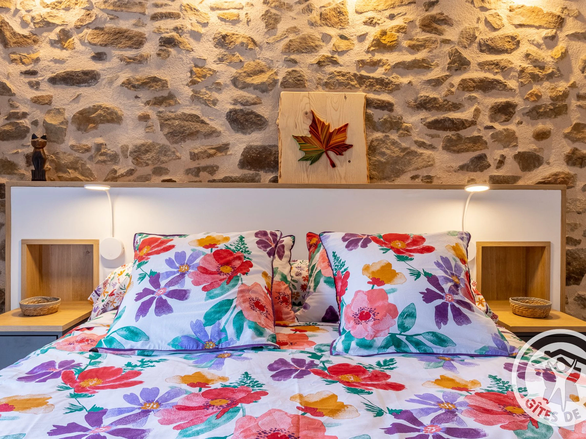 Located on the ground floor of this beautiful stone house, with its own private entrance, the room is comfortable and beautifully decorated: a 160x200cm double bed, television, a shower room (walk-in shower, double sink vanity, hairdryer), toilet, and dressing room. A courtesy tray awaits you to quench your thirst at any time of day: kettle, tea, coffee, water, and biscuits.