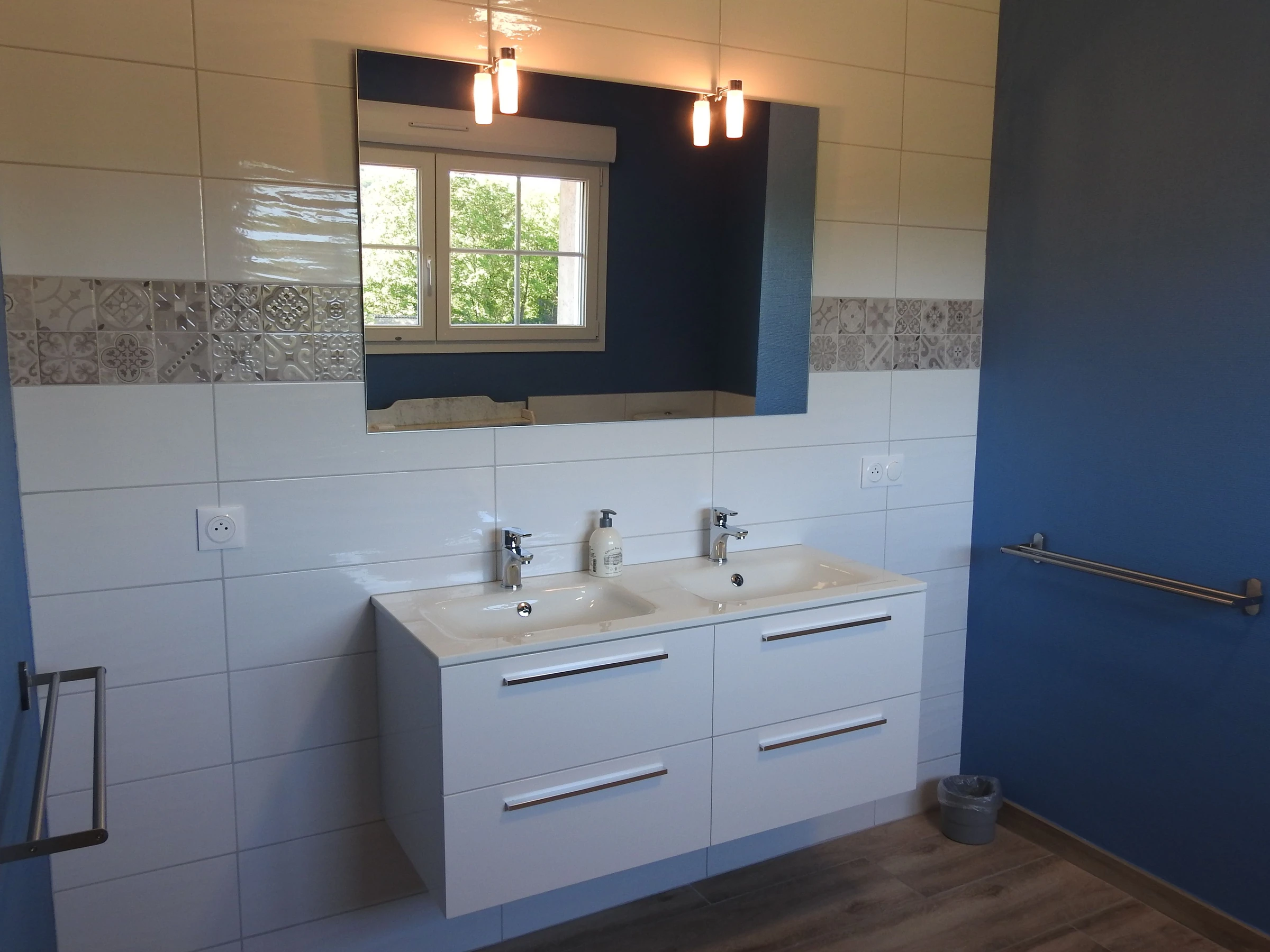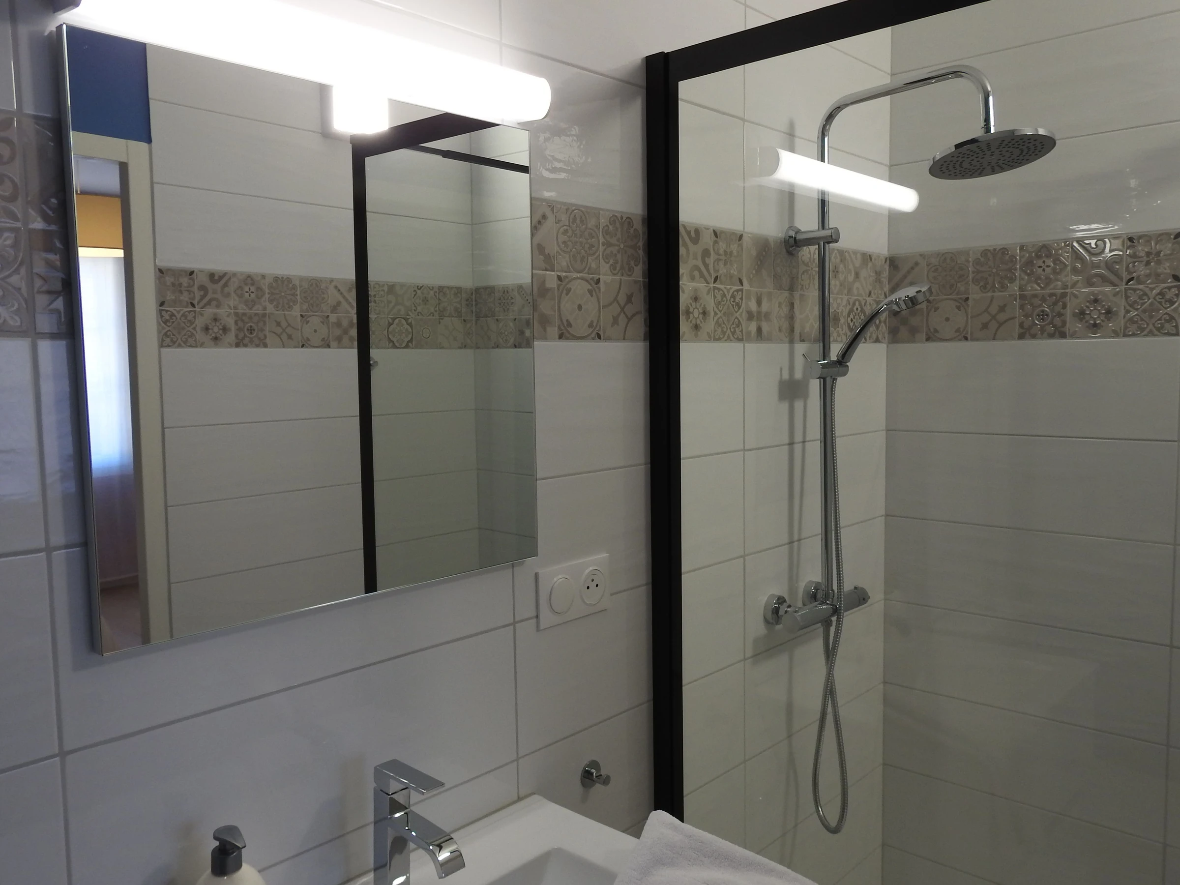 Large bathroom: 12 m² common to the blue and burgundy rooms.