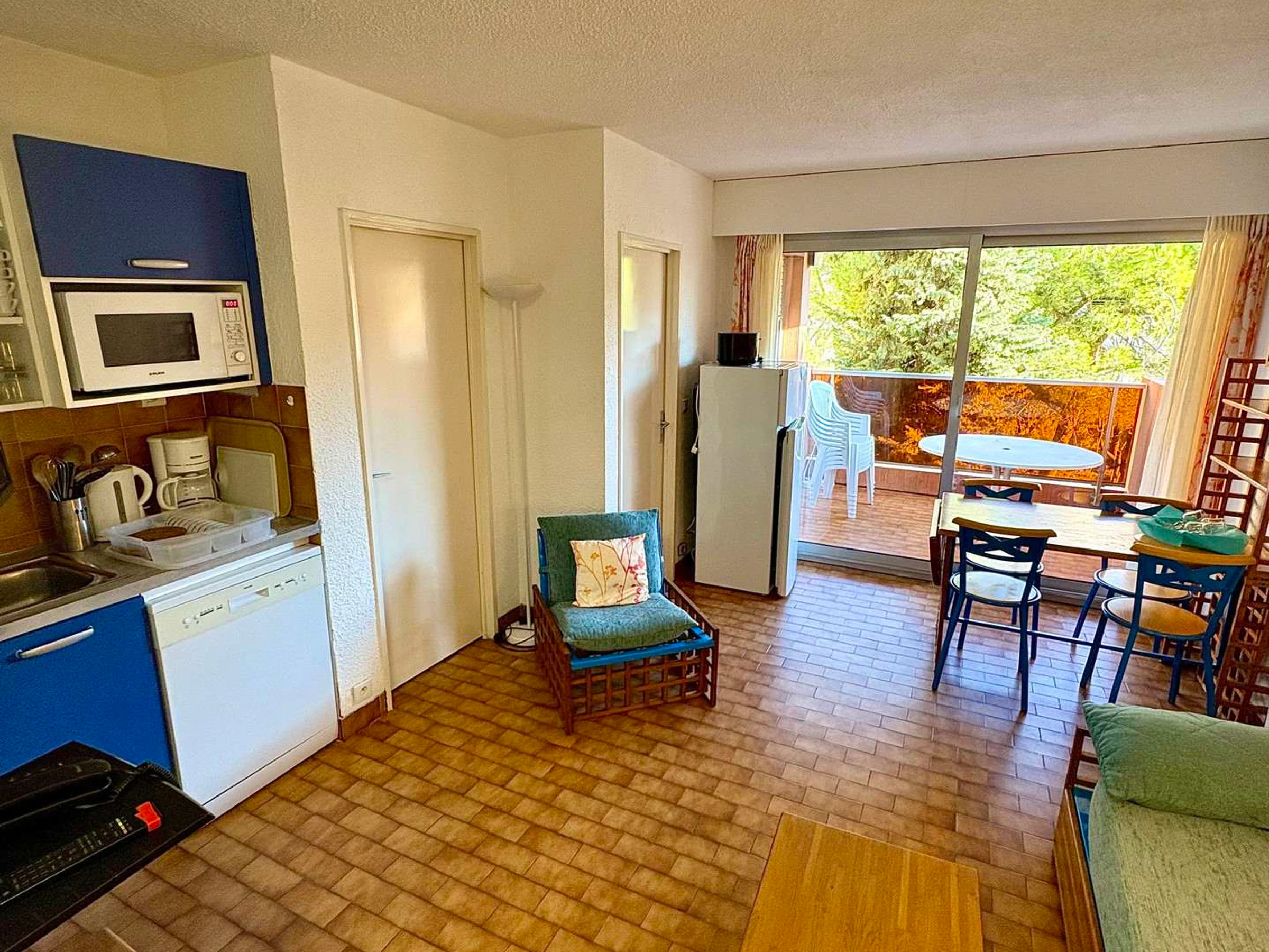 Equipped kitchenette: dishwasher, microwave, fridge-freezer, toaster, kettle, filter coffee maker.