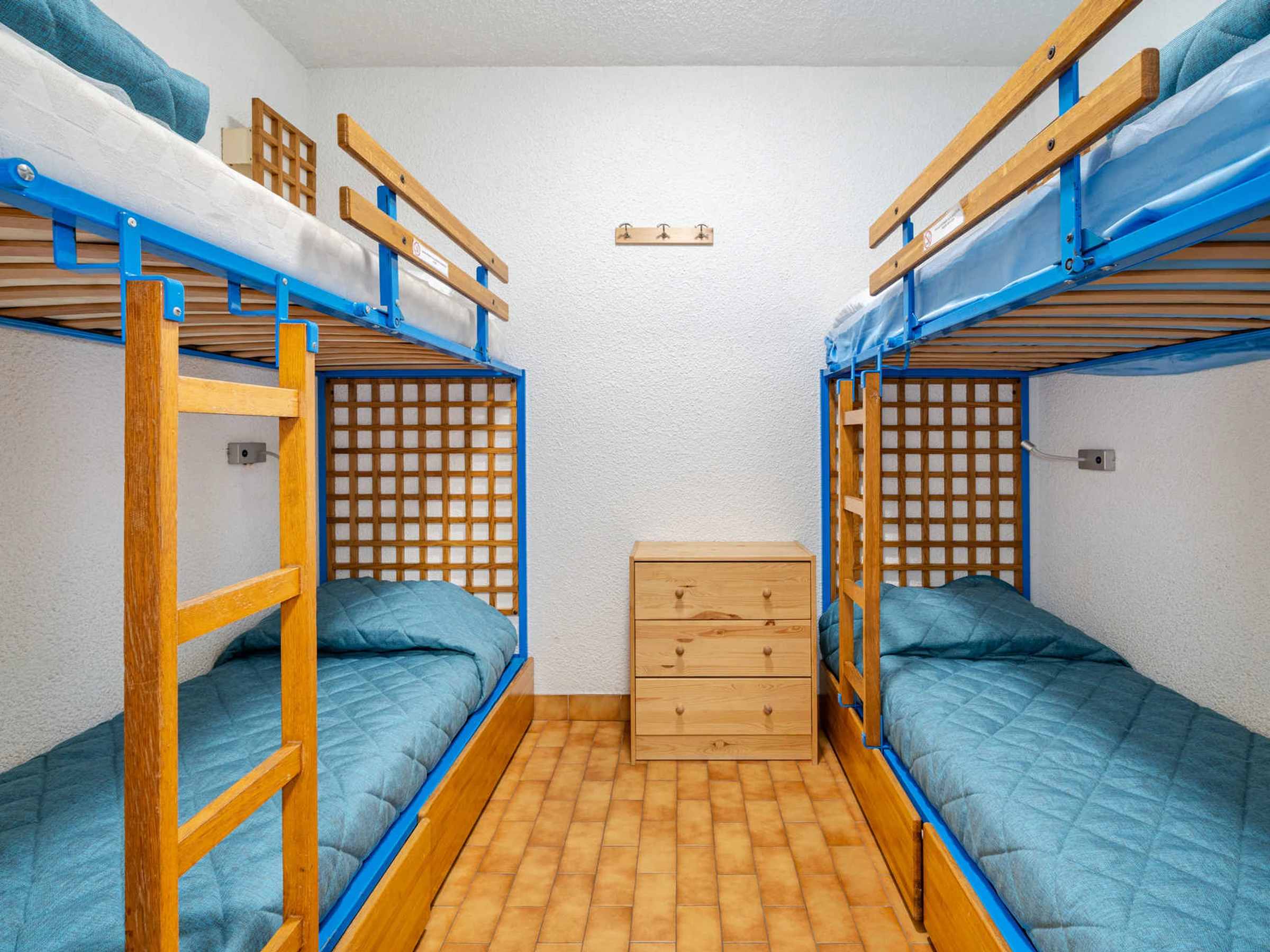 Bedroom with a double bed, cabin with 2 x 2 bunk beds, and living area with pull-out trundle sofa bed.