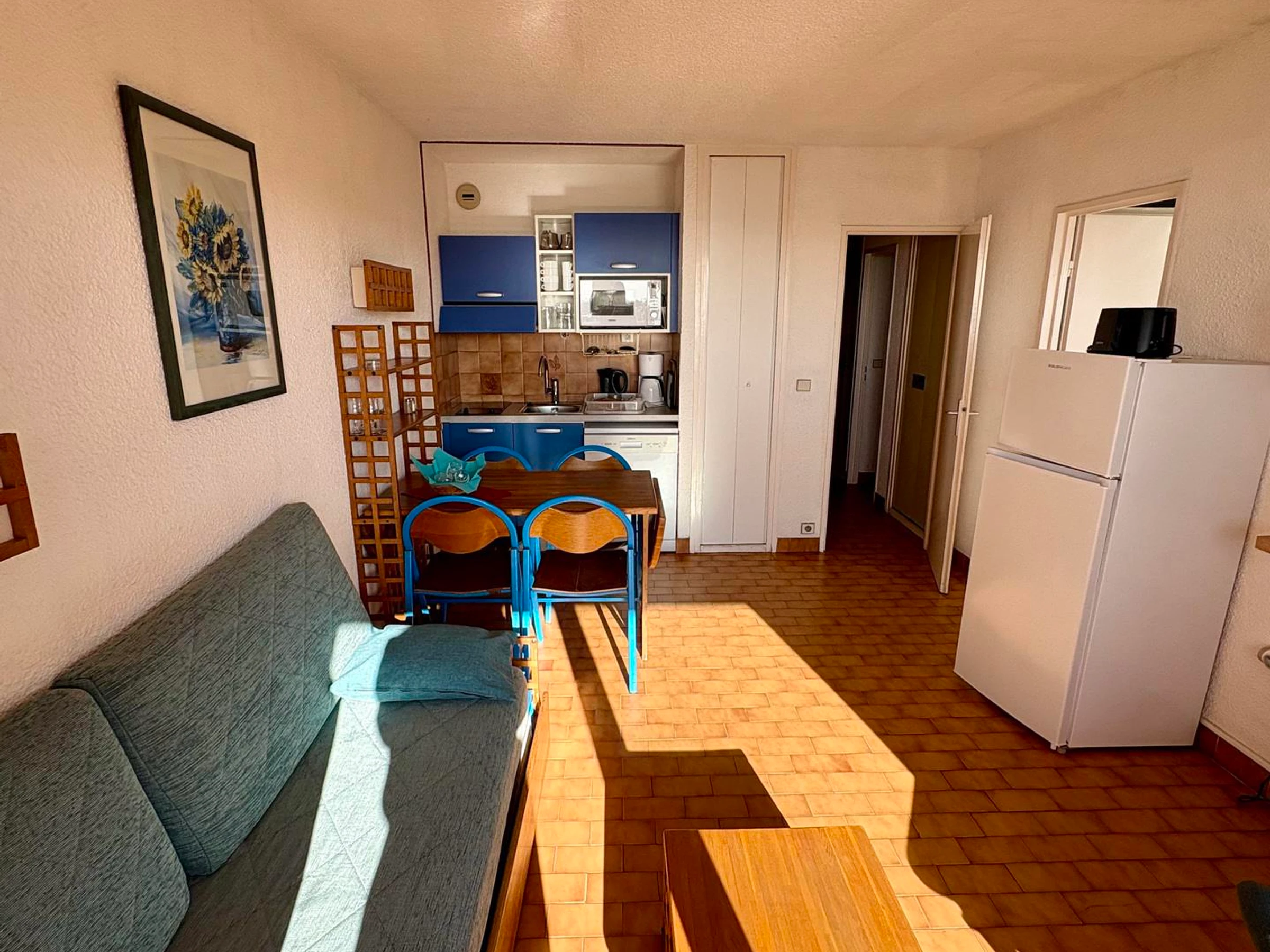 Equipped kitchenette: dishwasher, microwave, fridge-freezer, toaster, kettle, filter coffee maker.