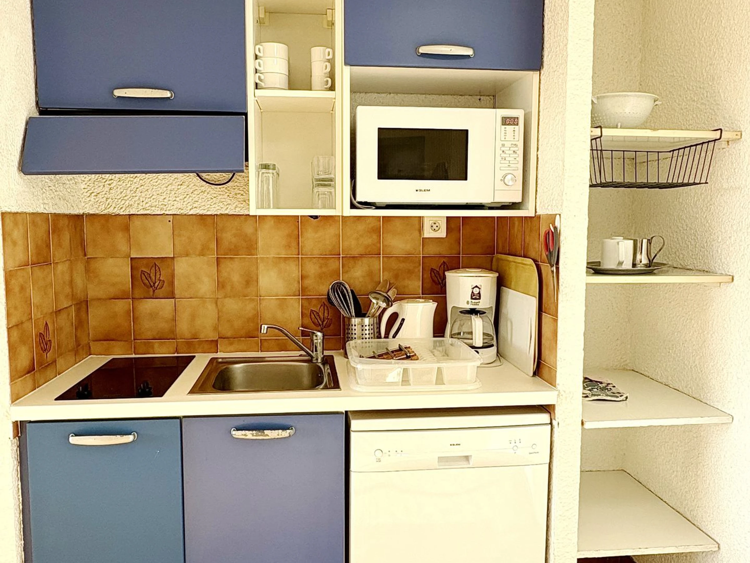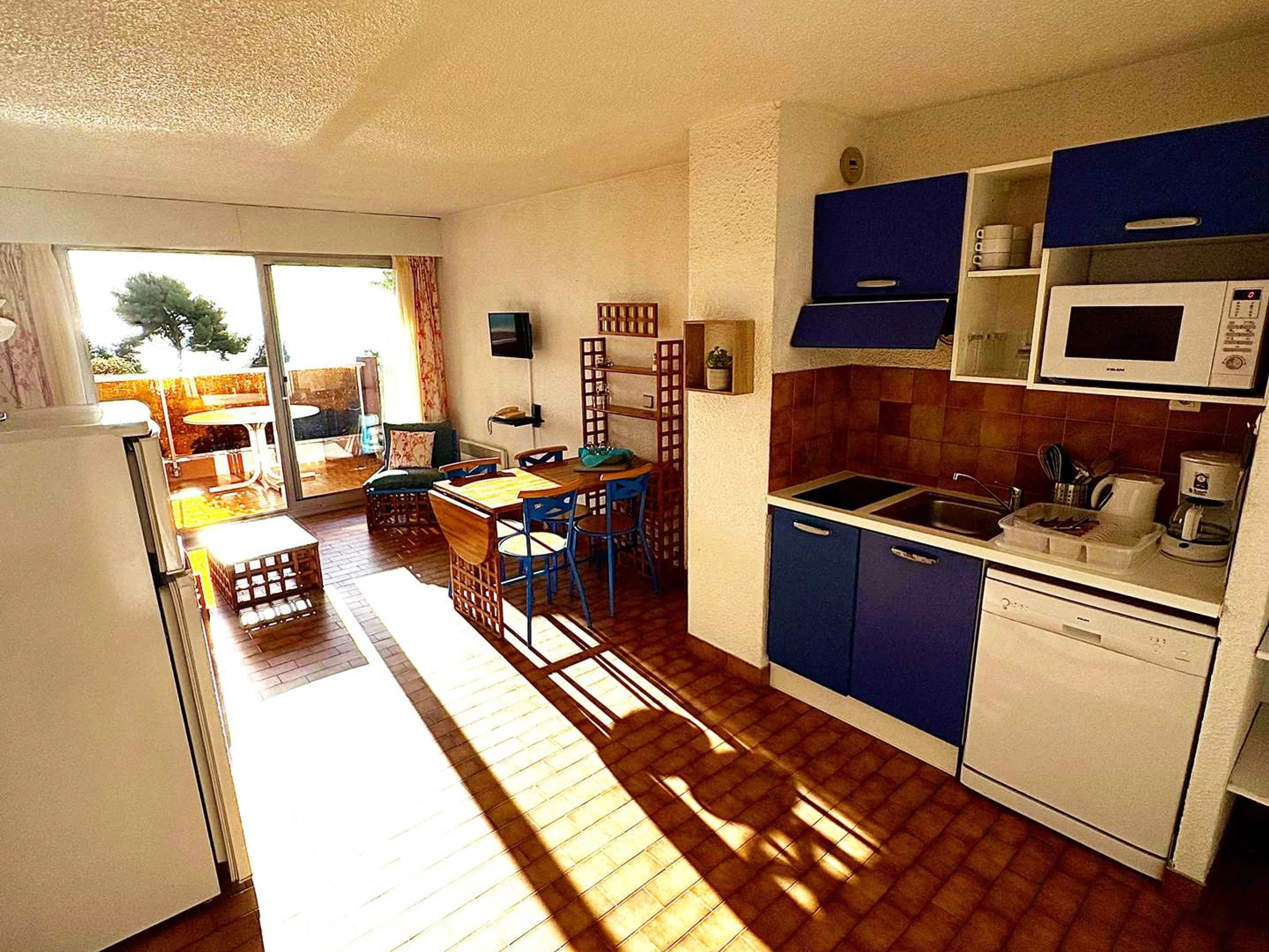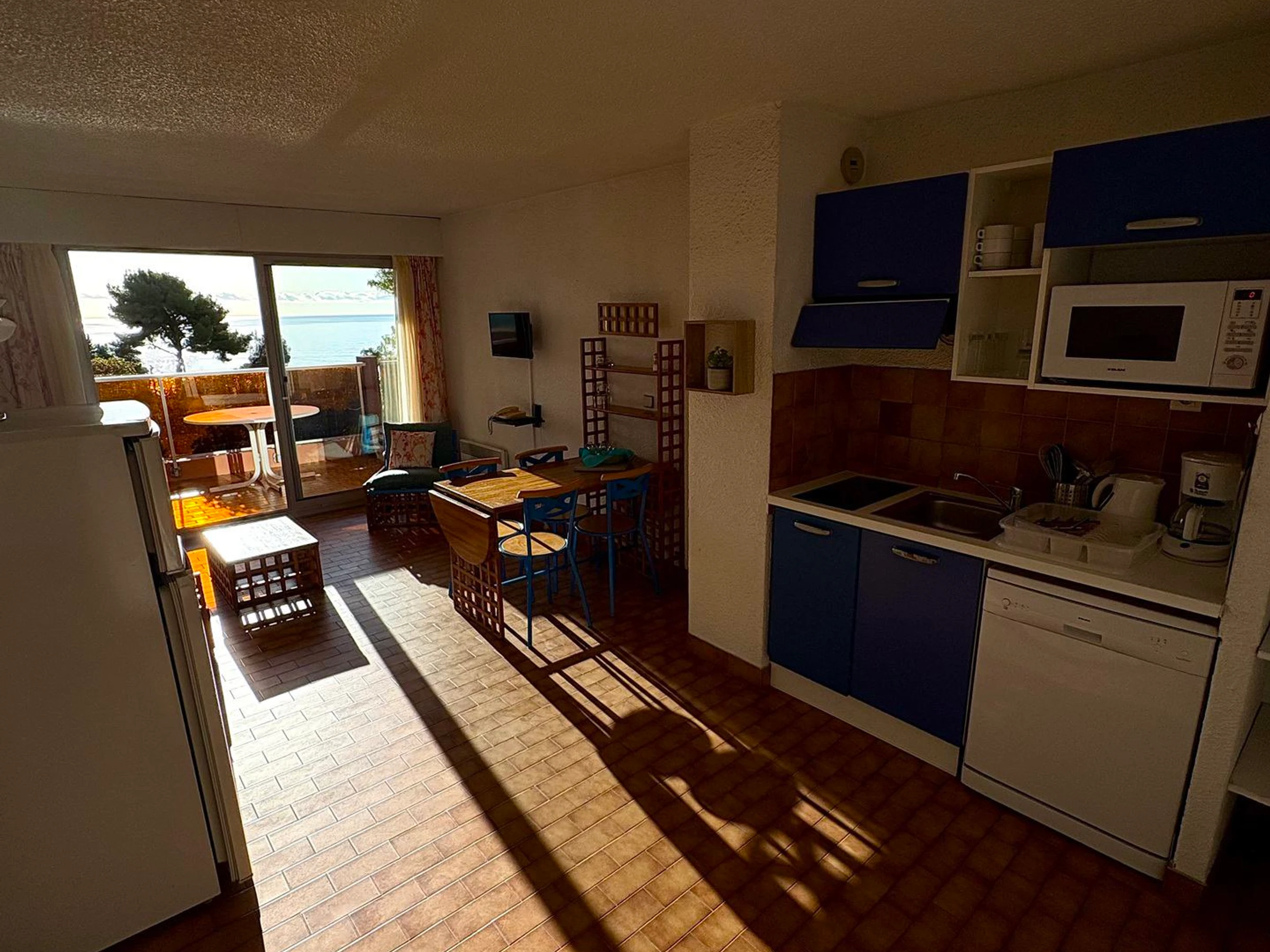 Equipped kitchenette: dishwasher, microwave, fridge-freezer, toaster, kettle, filter coffee maker.