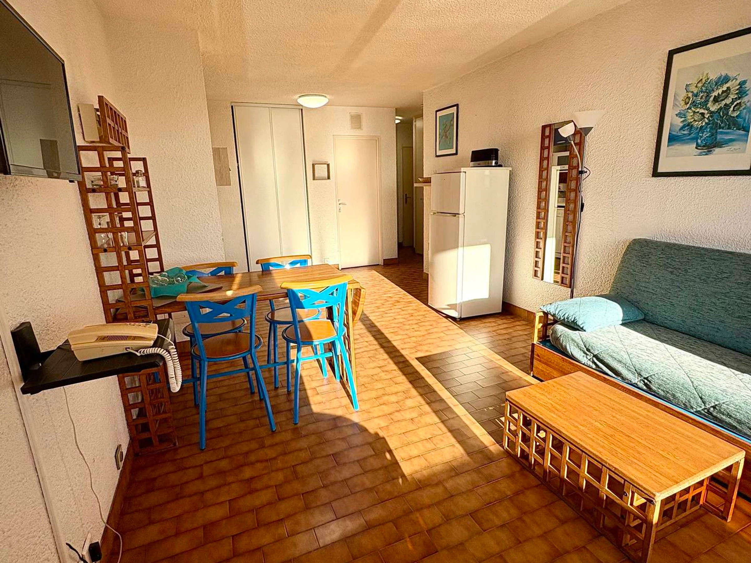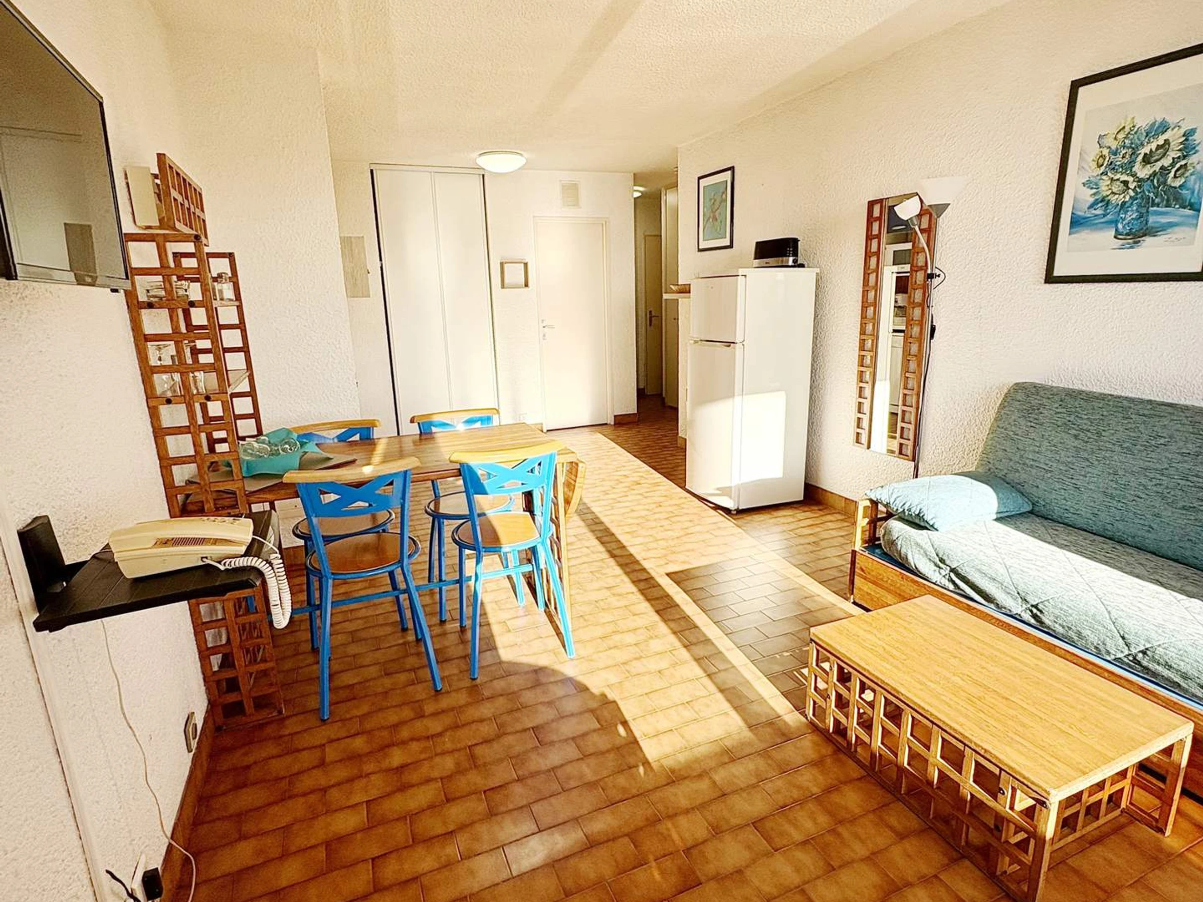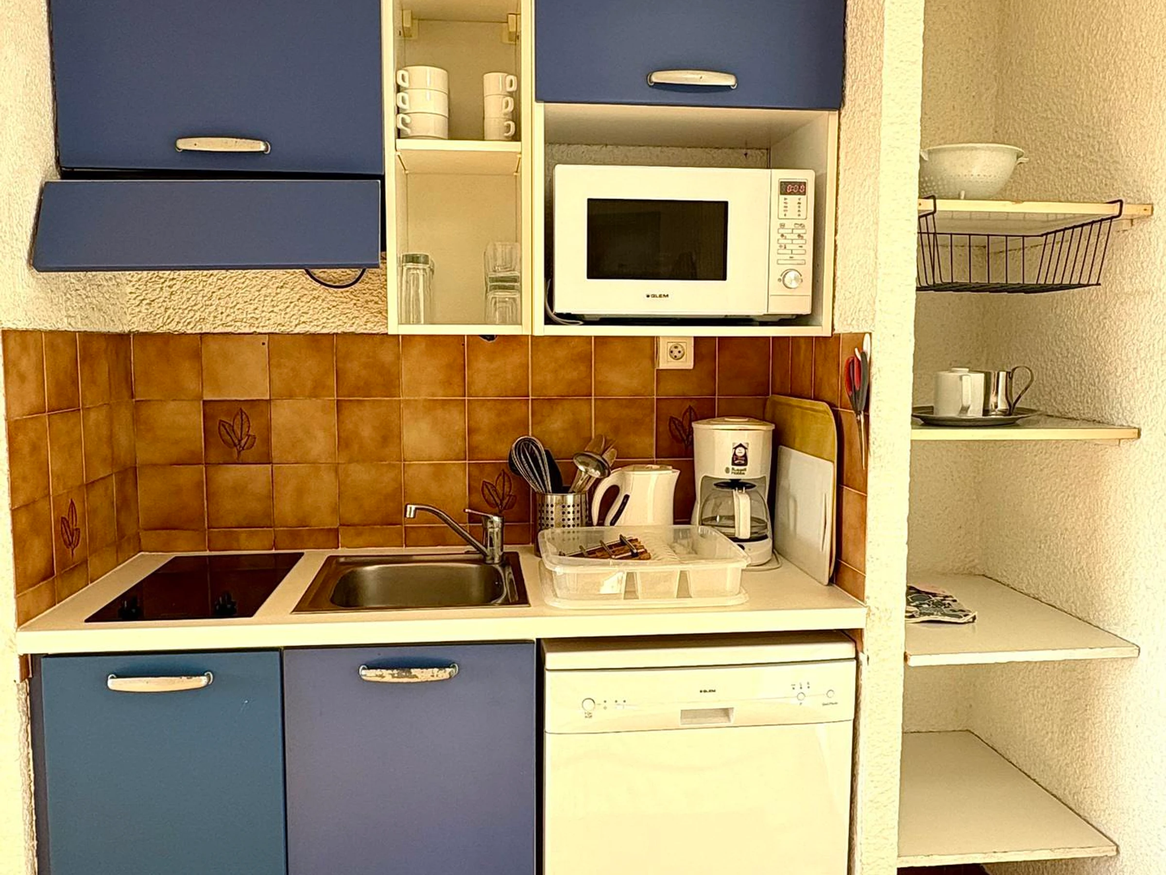 Equipped kitchenette: dishwasher, microwave, fridge-freezer, toaster, kettle, filter coffee maker.
