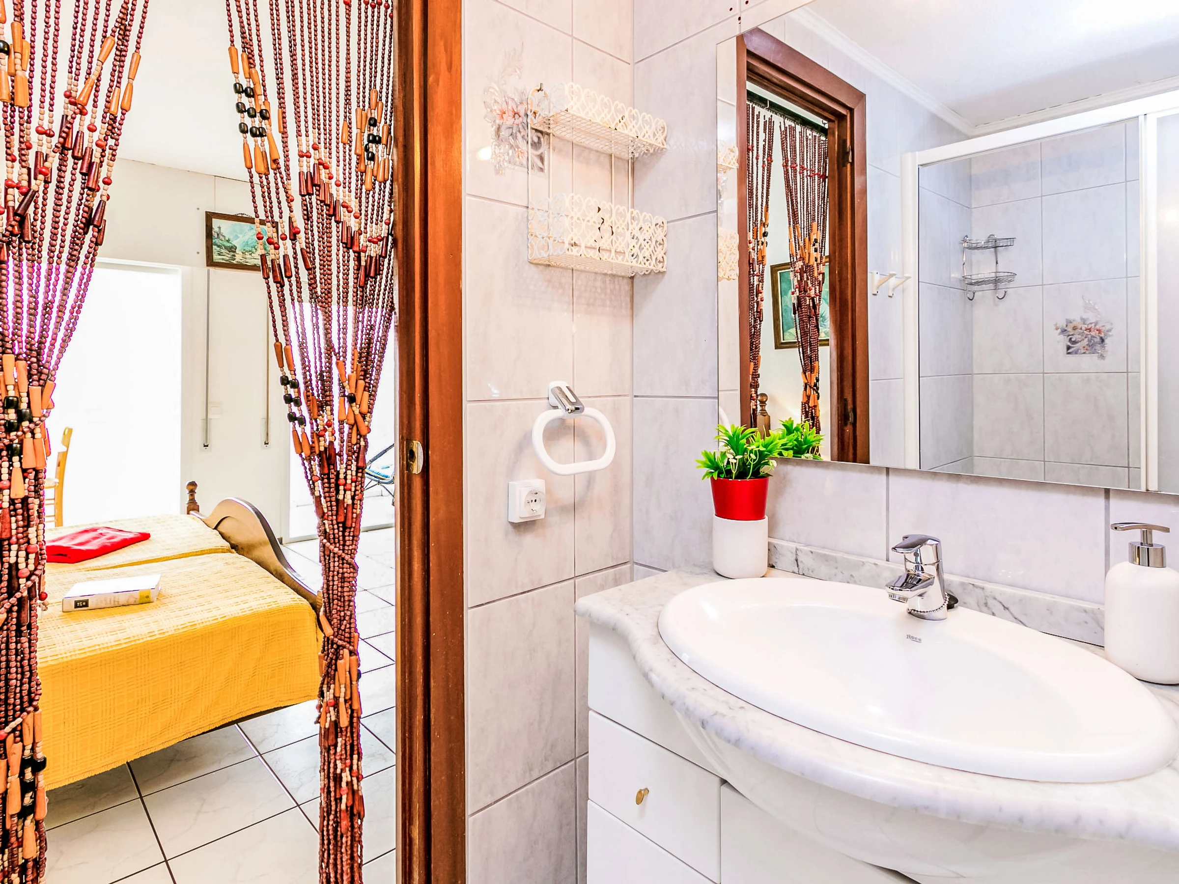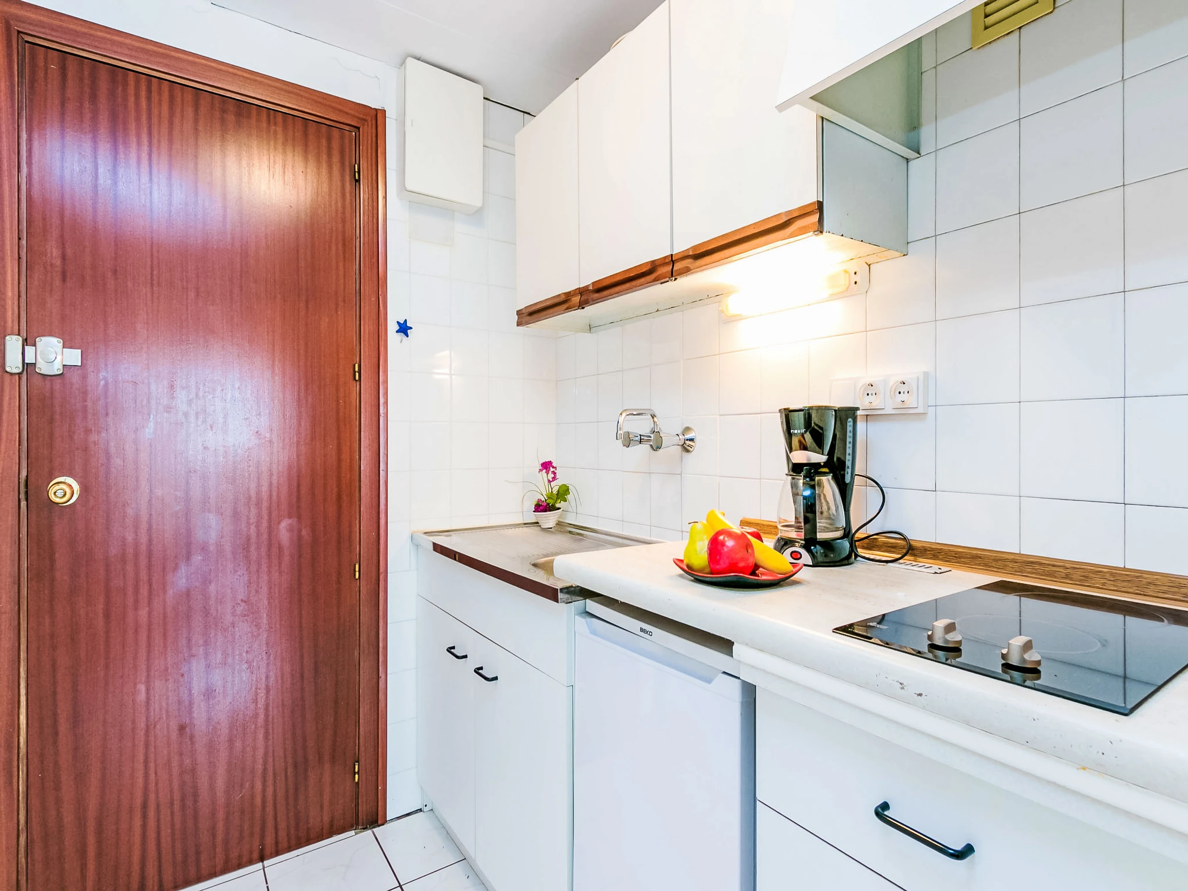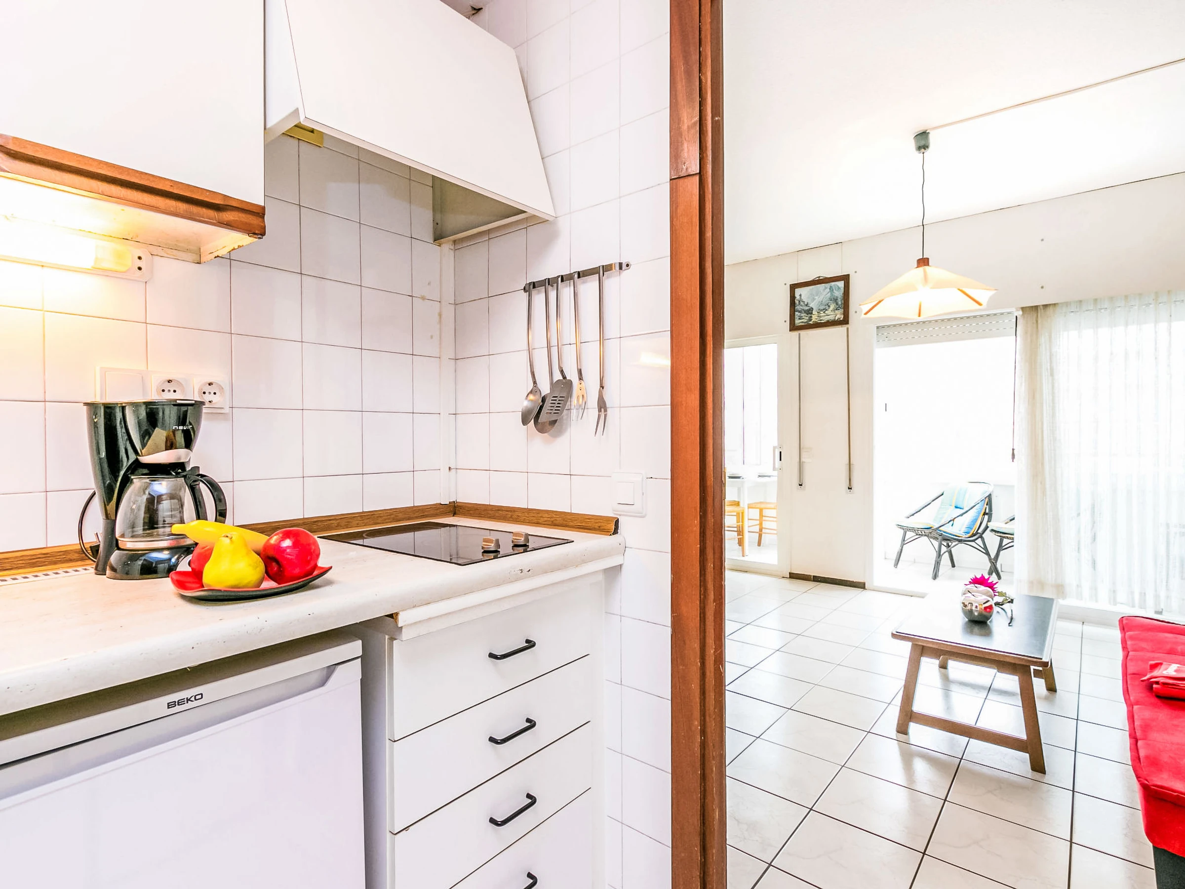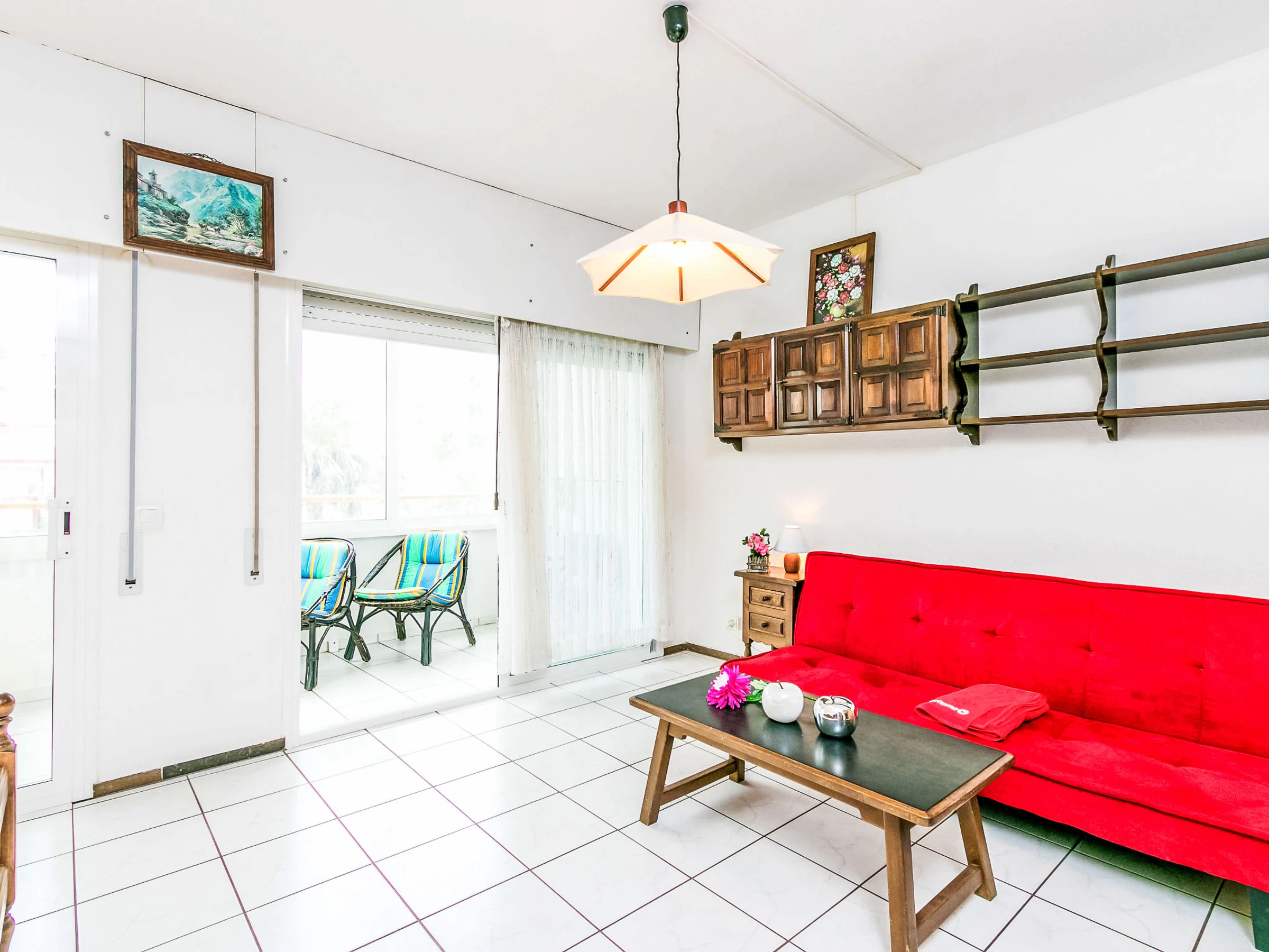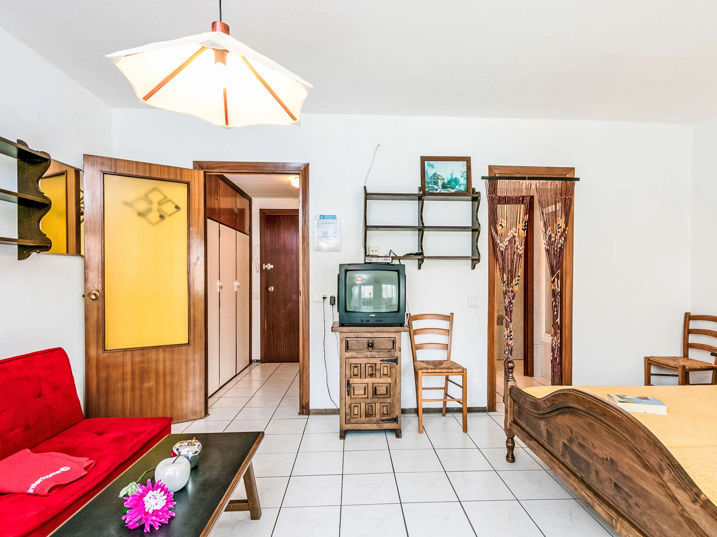 1-room studio 32 m2 on 1st floor. Very simple and rustic furnishings: living/dining room with 1 french bed, satellite TV and digital TV. Exit to the veranda. Small, open kitchen in the entrance (2 ceramic glass hob hotplates). Shower/WC. No heating option. Terrace 7 m2. Balcony furniture. Side view of the sea. Facilities: Internet (WiFi, free). Please note: non-smoking house. TV only ES, FR, DE. [hidden]