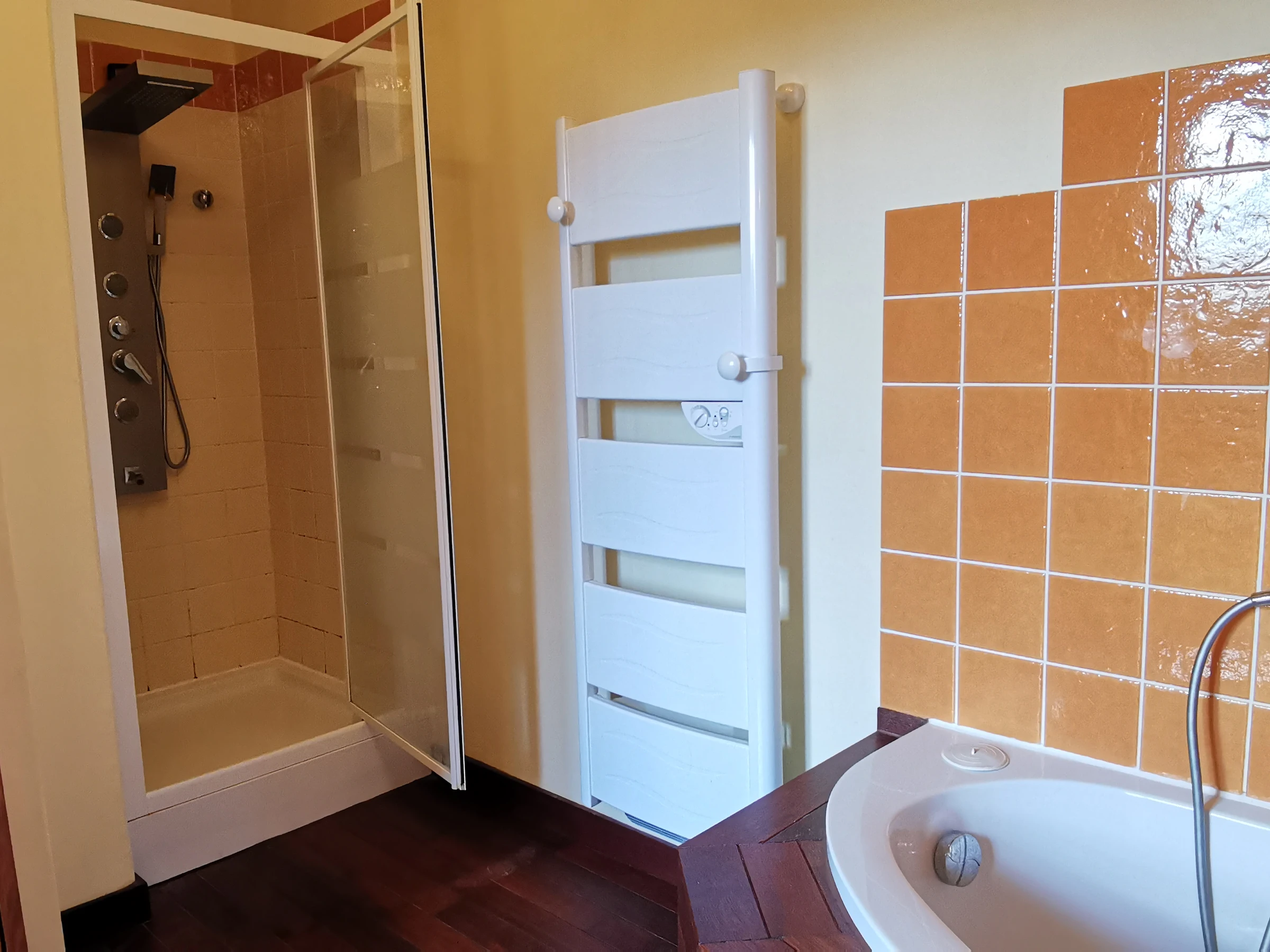 Bathroom with shower, bathtub, sink, towel warmer, and storage cupboard,