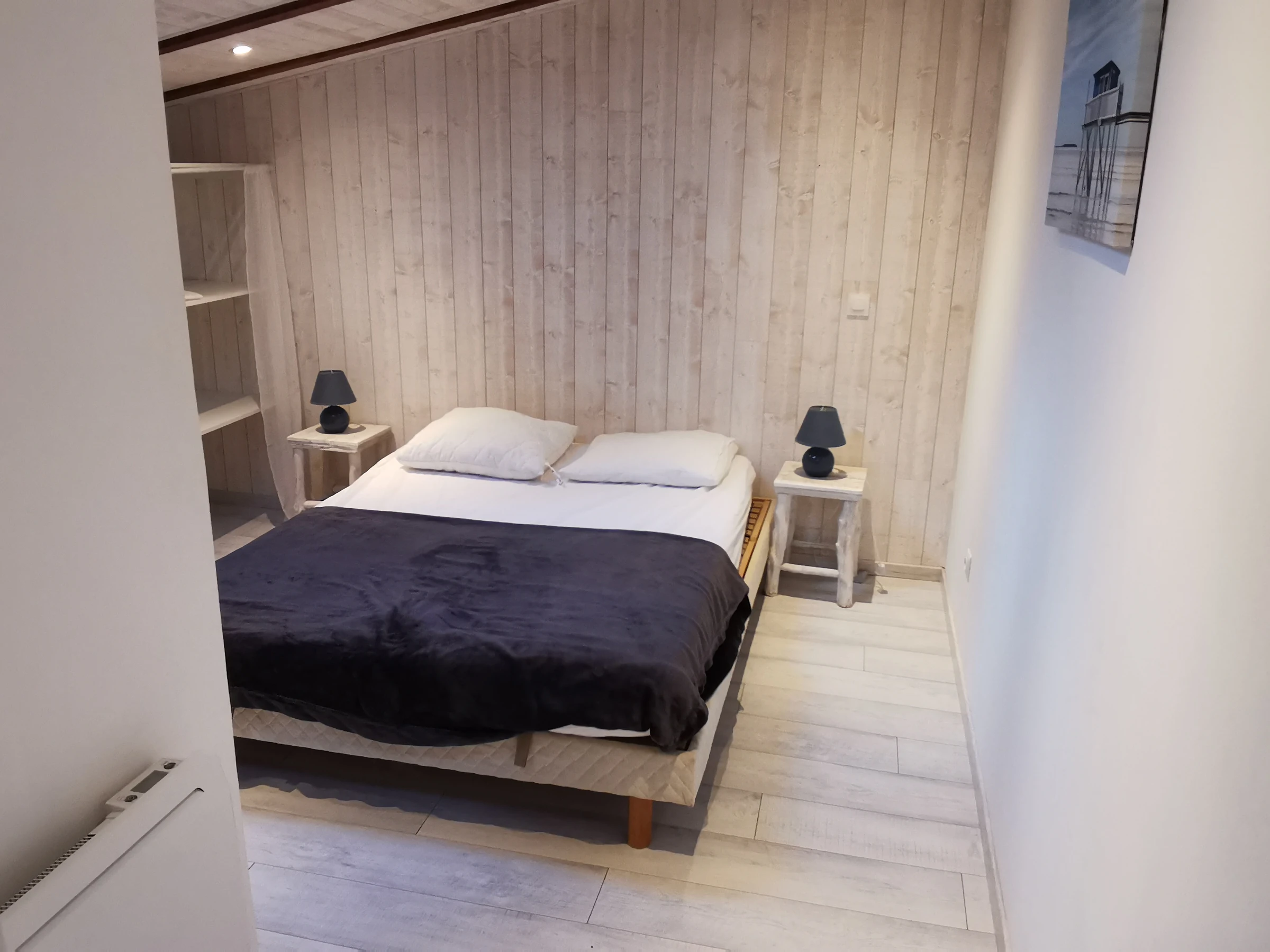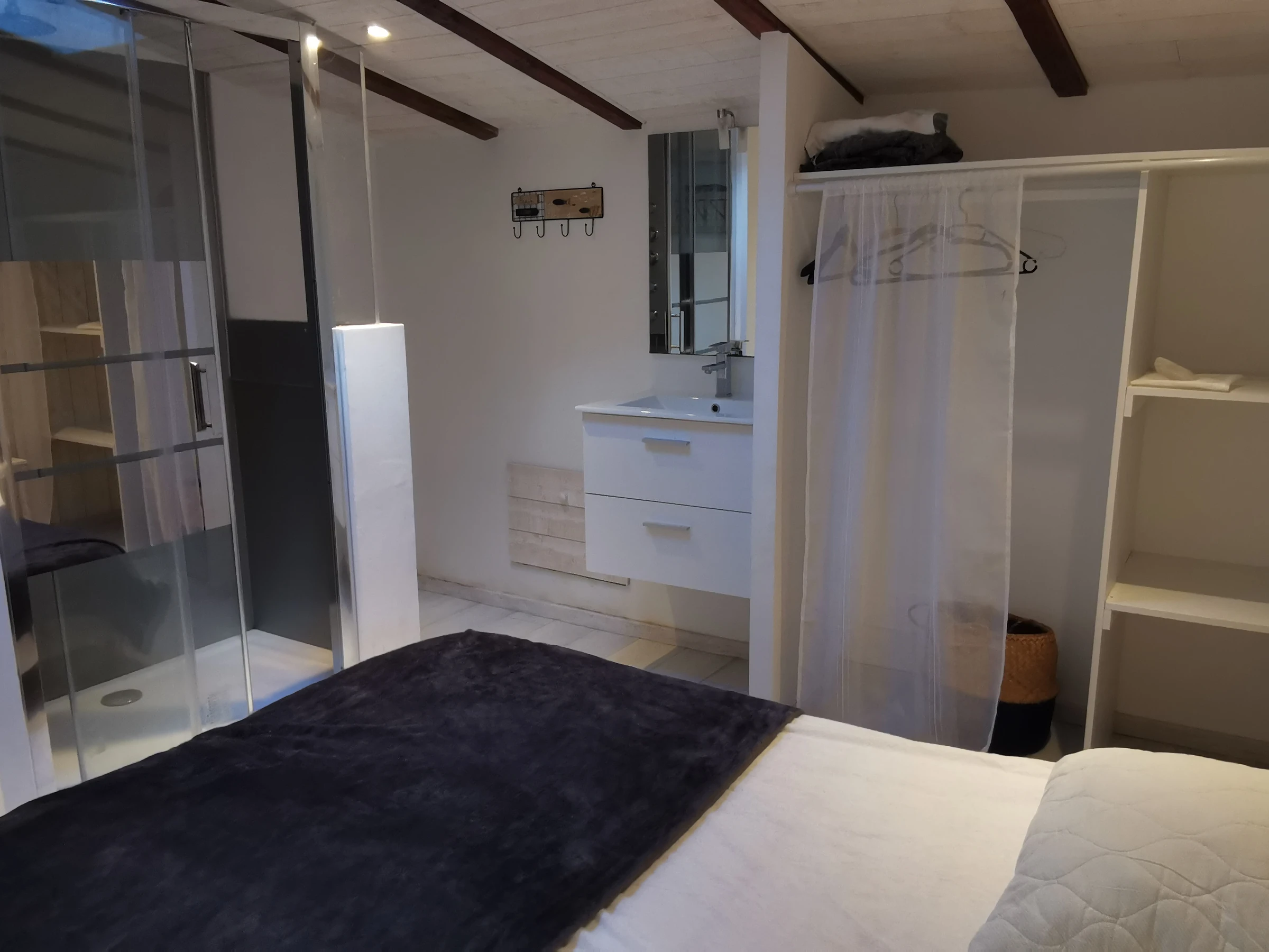 One bedroom with a queen-size bed (160cm), wardrobe, and shower,